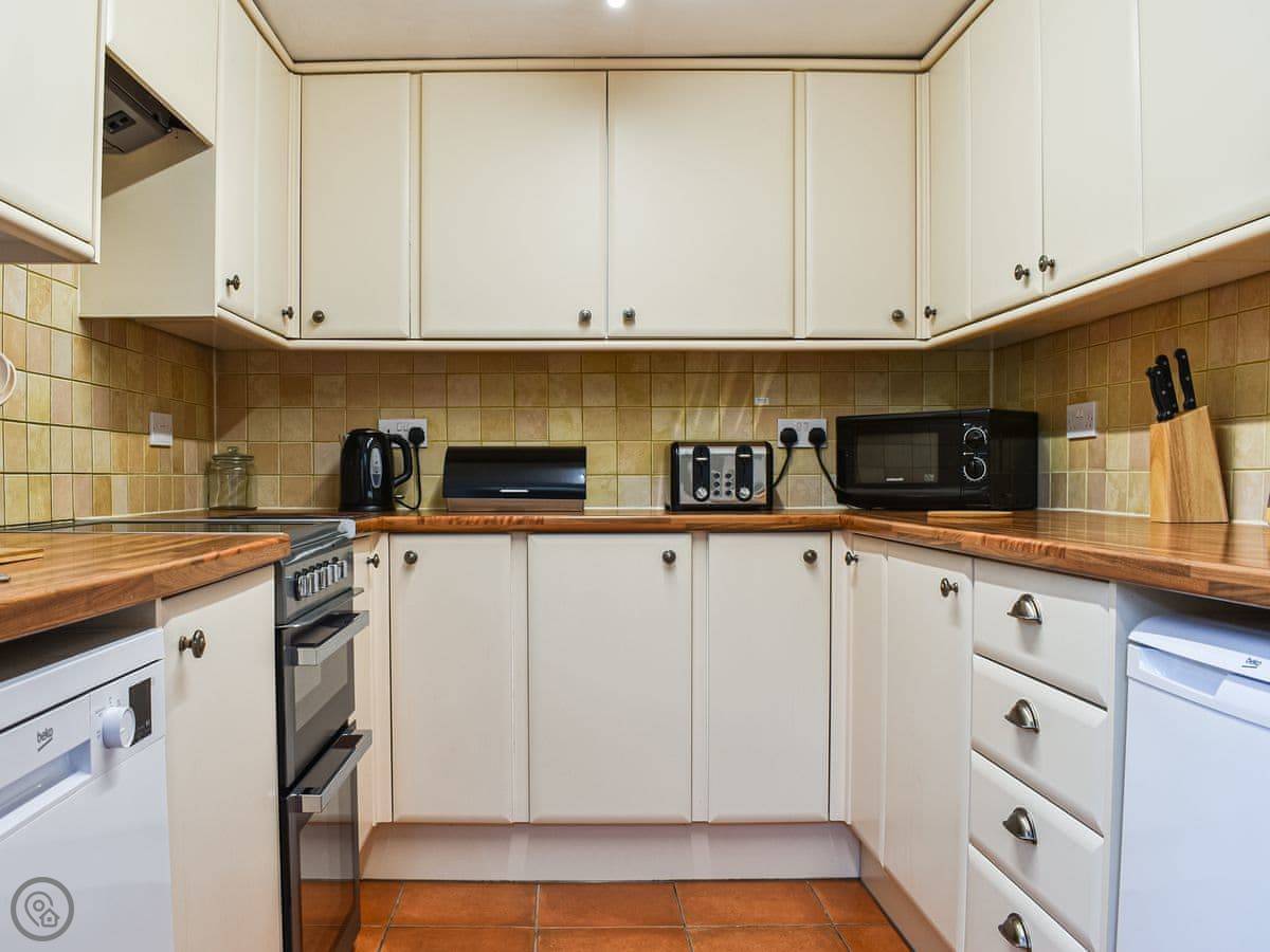 The kitchen has what you need. There's a dining table in the living room that seats everyone. Patio doors go out to the back garden. The garage is accessible from the garden and has a washing machine in it.