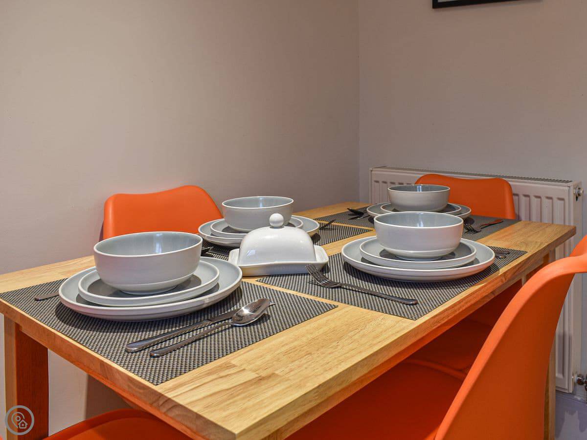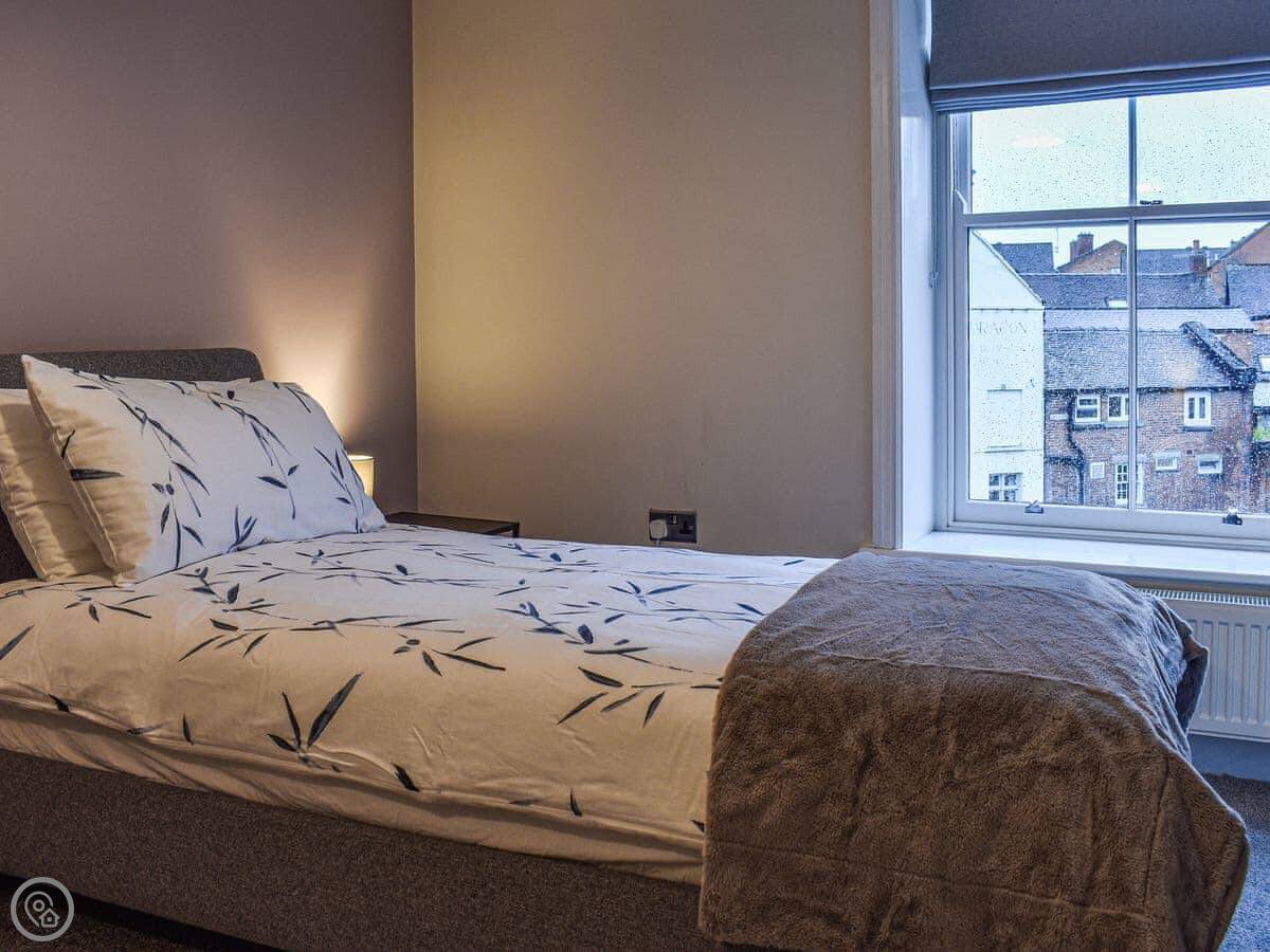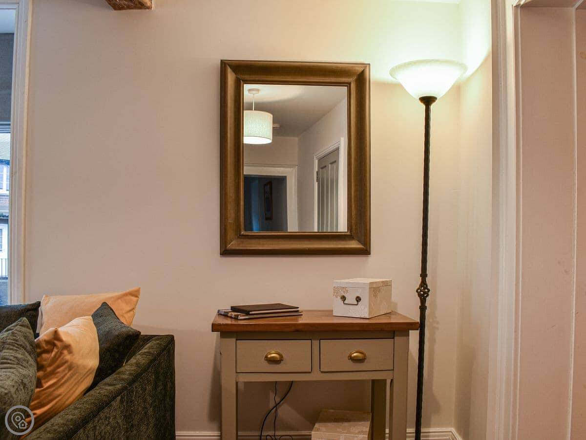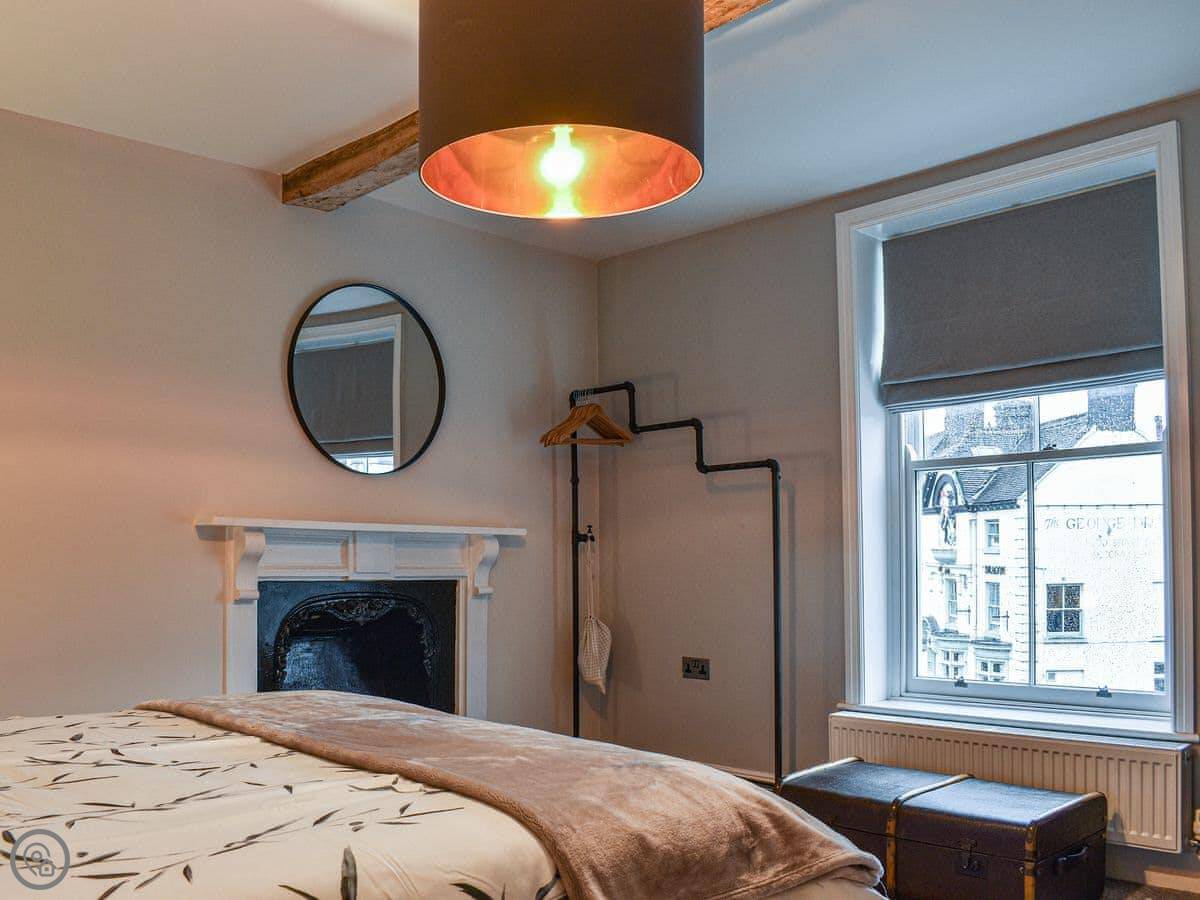 This first floor apartment has a shared entrance with one other property. Market View is a first floor apartment and as you enter the property you are greeted by the open plan living space. The living area is light and spacious and has comfortable seating, Smart TV with Sky and a feature fireplace for decorative purposes only. The kitchen area has been finished to a high standard with all the equipment and appliances you should need for your stay, and the dining area has a table with four chair, and Just off the kitchen is the shower room with walk in shower. The apartment has two generously sized bedrooms, one with a kingsize bed and the other with twin beds both having wardrobe space. There is an outdoor terrace with artificial grass and table with chairs. Although there isn’t parking with the property there is ample parking surrounding it.