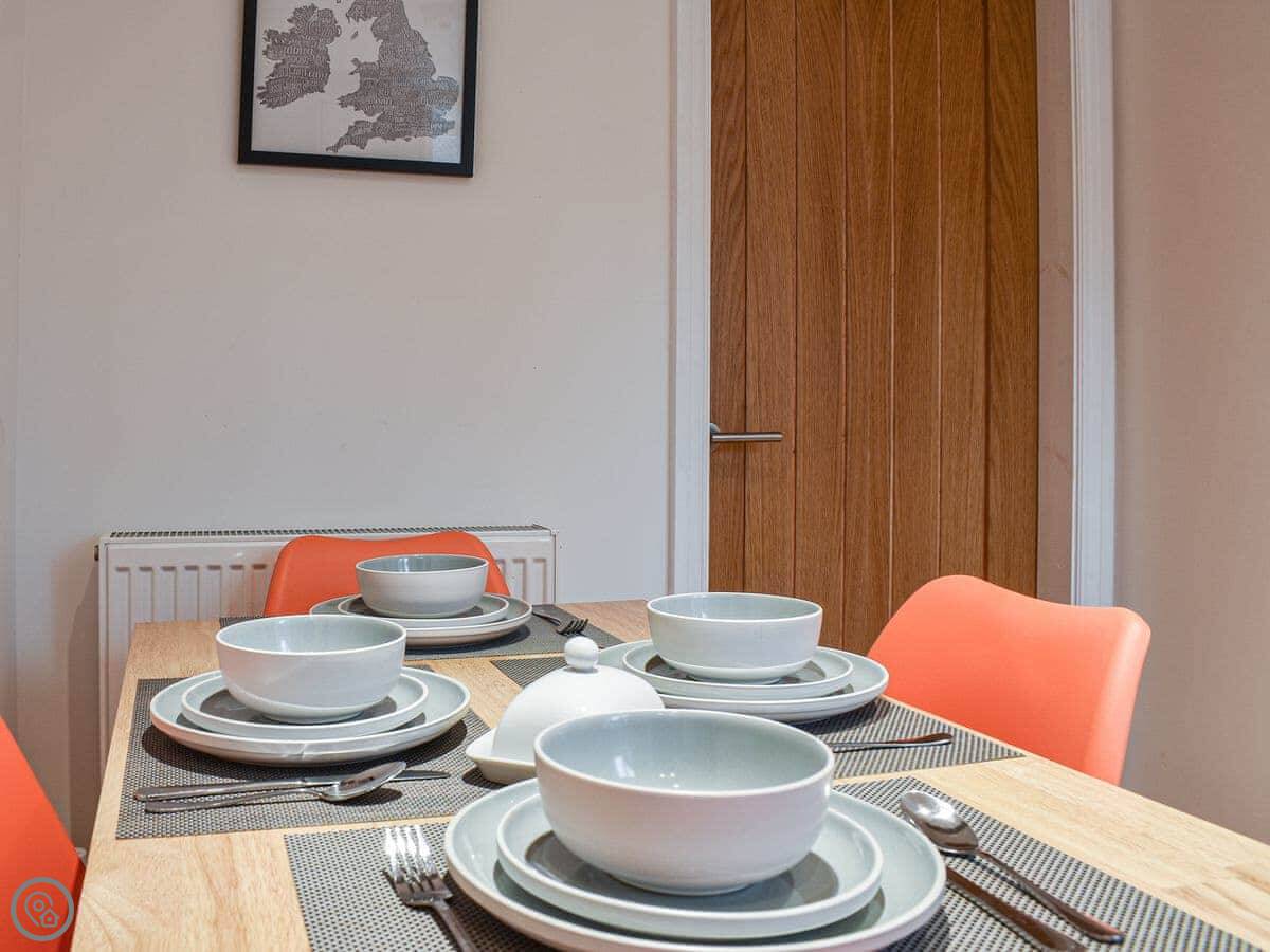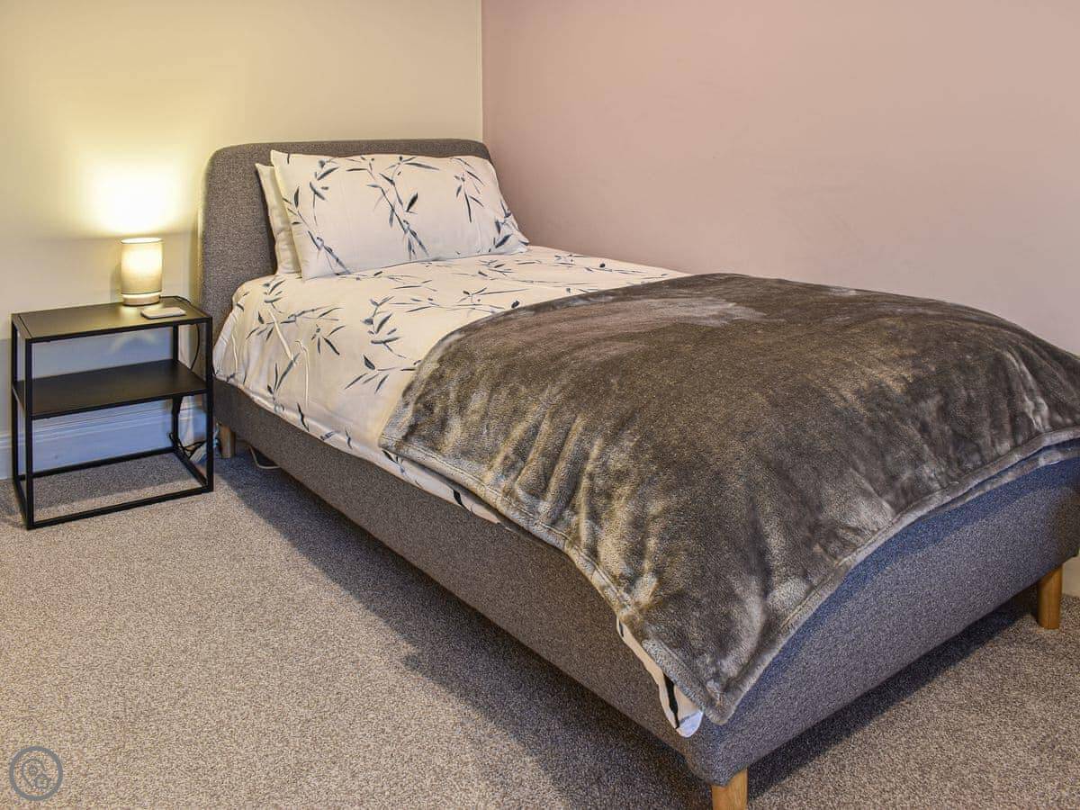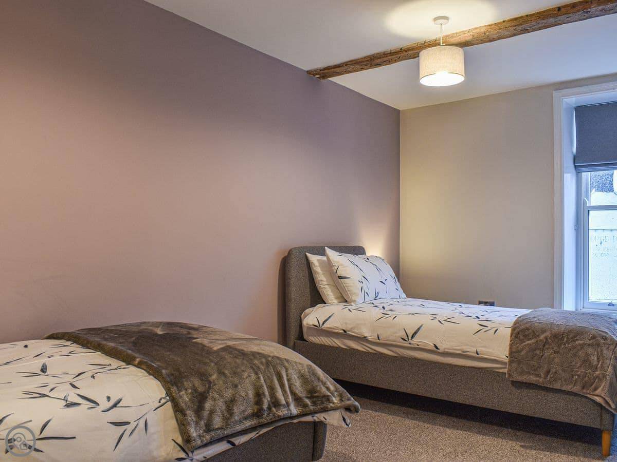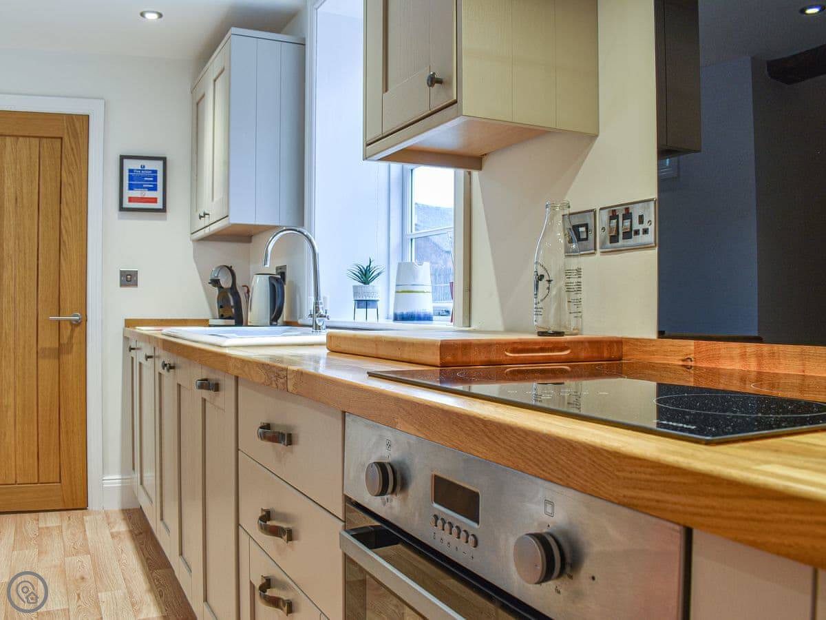 This first floor apartment has a shared entrance with one other property. Market View is a first floor apartment and as you enter the property you are greeted by the open plan living space. The living area is light and spacious and has comfortable seating, Smart TV with Sky and a feature fireplace for decorative purposes only. The kitchen area has been finished to a high standard with all the equipment and appliances you should need for your stay, and the dining area has a table with four chair, and Just off the kitchen is the shower room with walk in shower. The apartment has two generously sized bedrooms, one with a kingsize bed and the other with twin beds both having wardrobe space. There is an outdoor terrace with artificial grass and table with chairs. Although there isn’t parking with the property there is ample parking surrounding it.