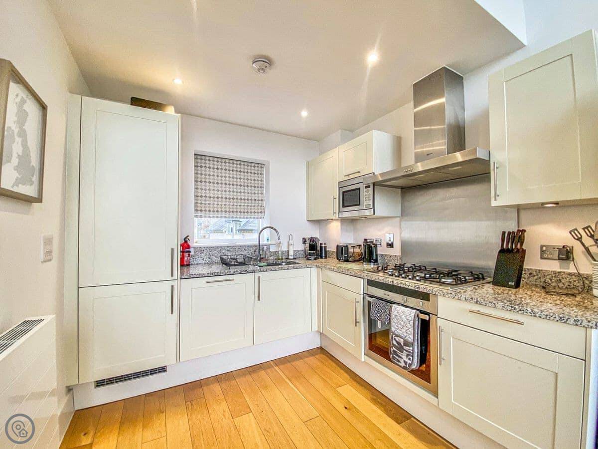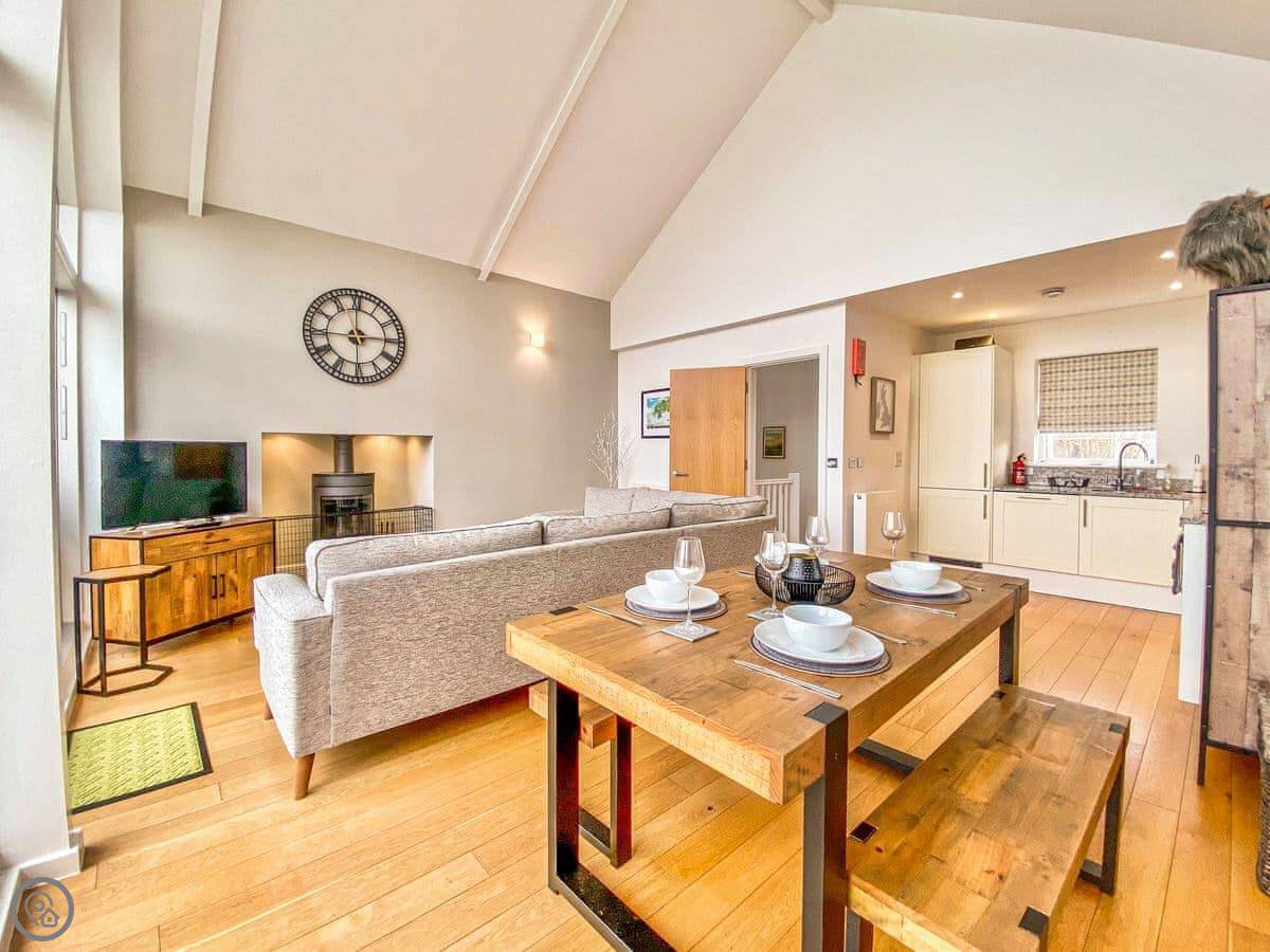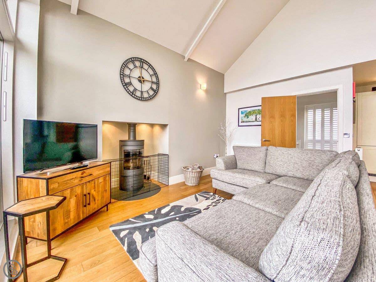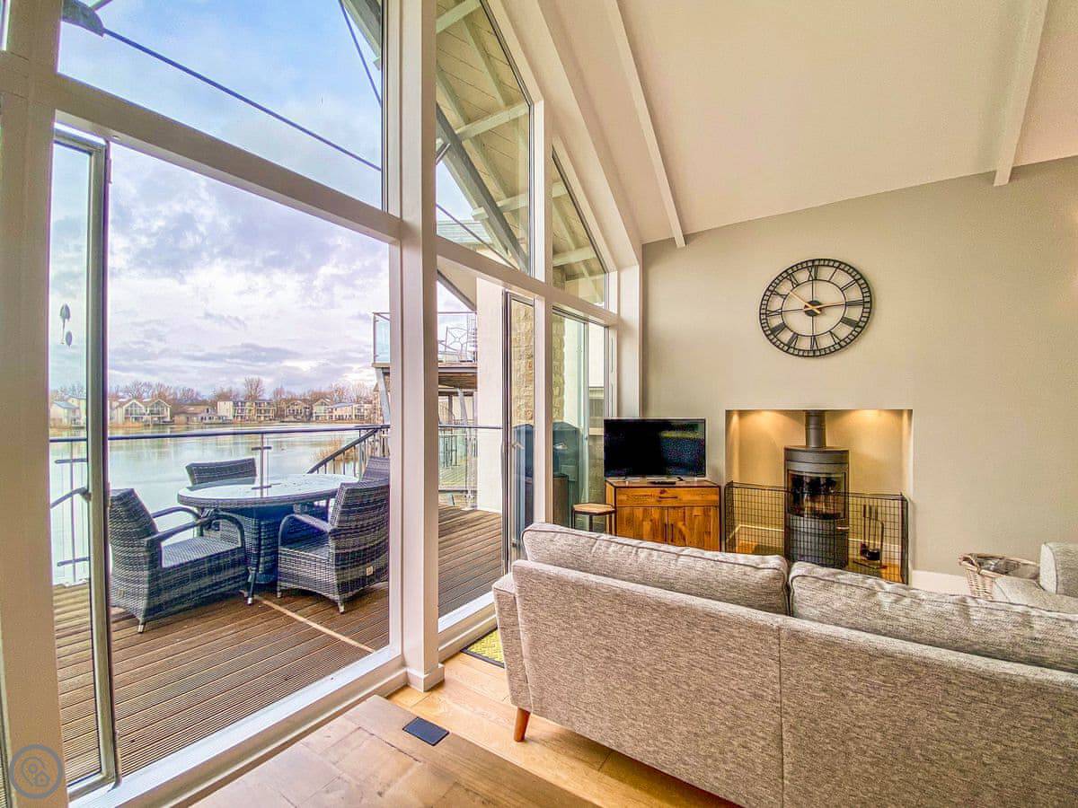 Lambs Tail is located on the private estate of Lower Mill, overlooking one of the beautiful lakes, and sleeps up to five guests. With the idea of inverted living, this luxury property is designed to take in spectacular sunrises or sunsets, with the living areas on the first floor and bedrooms on the ground floor. On the ground floor are two good sized bedrooms, one with en-suite, and a further bedroom with single bed and bunk beds, along with a family bathroom. Access to the ground floor deck is via the bedrooms. As you enter the first floor the landing leads into the open plan living space and features a large corner for additional seating. The living room provides plenty of space to relax around the fire, comfortably seated on a large corner sofa, sit back and watch the Smart TV with Netflix. The kitchen is well equipped and sliding doors lead to the deck where you can enjoy a nice meal while overlooking the lake.