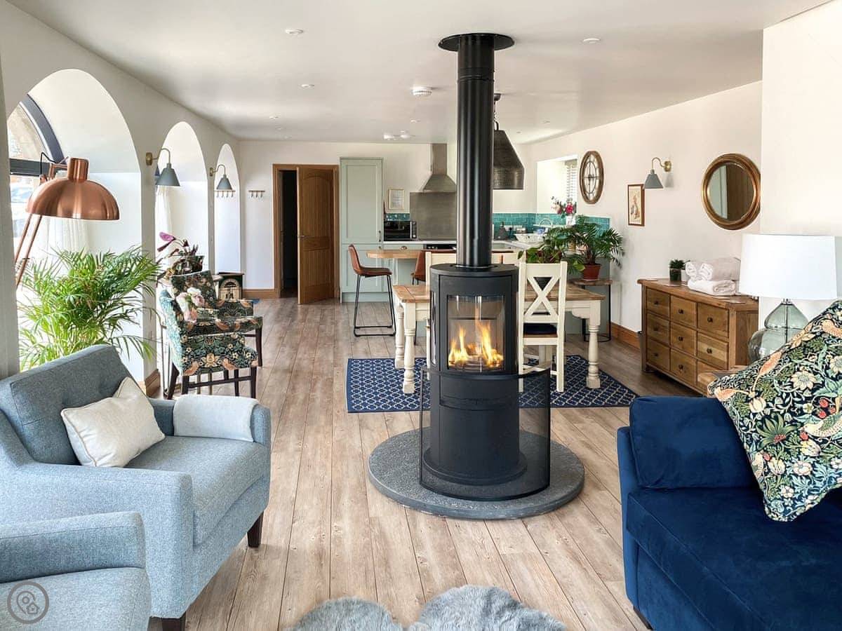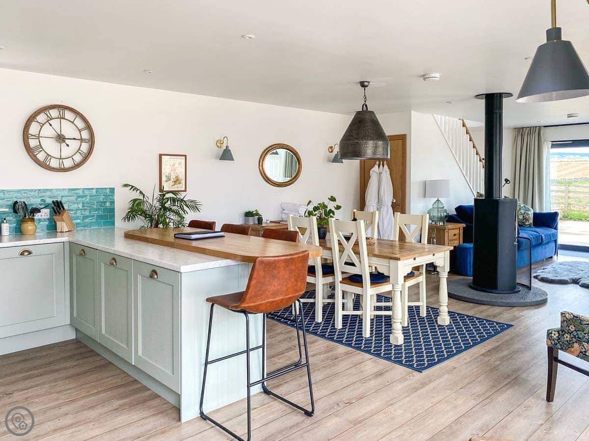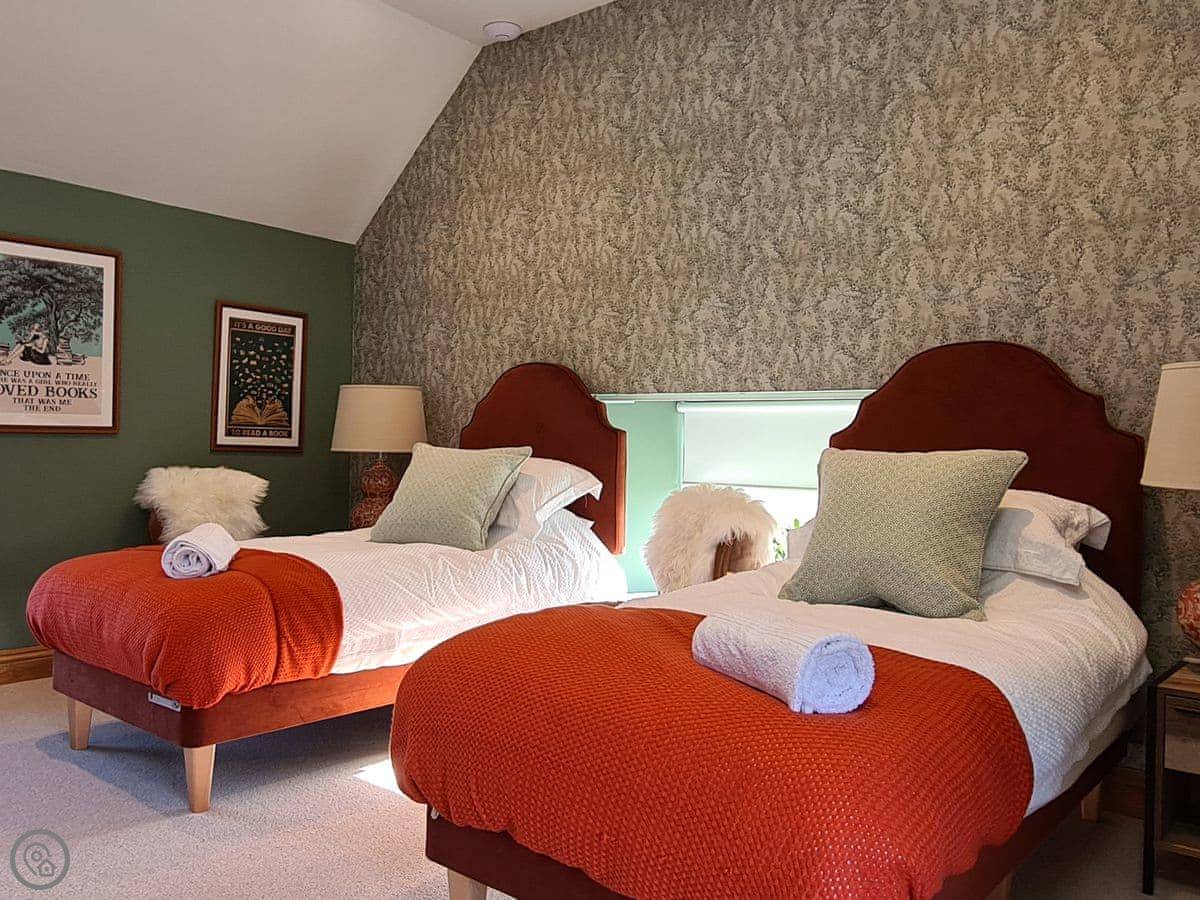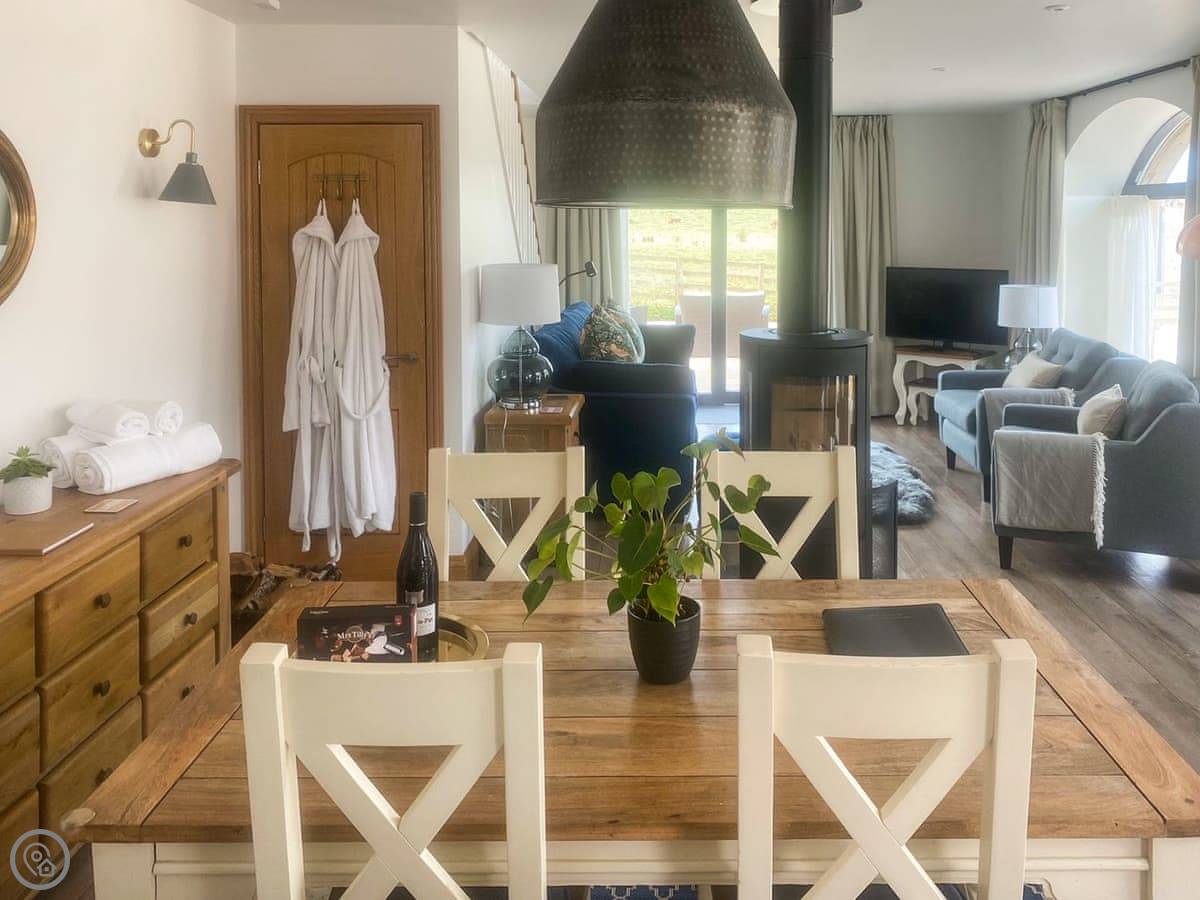 It sleeps four. Two bedrooms, both with super king beds you can split into twins if you prefer. Each bedroom has its own bathroom, one with a bath, one with a shower. It's got a 4 Star rating. It's comfortable, with things like a wood burner and underfloor heating.