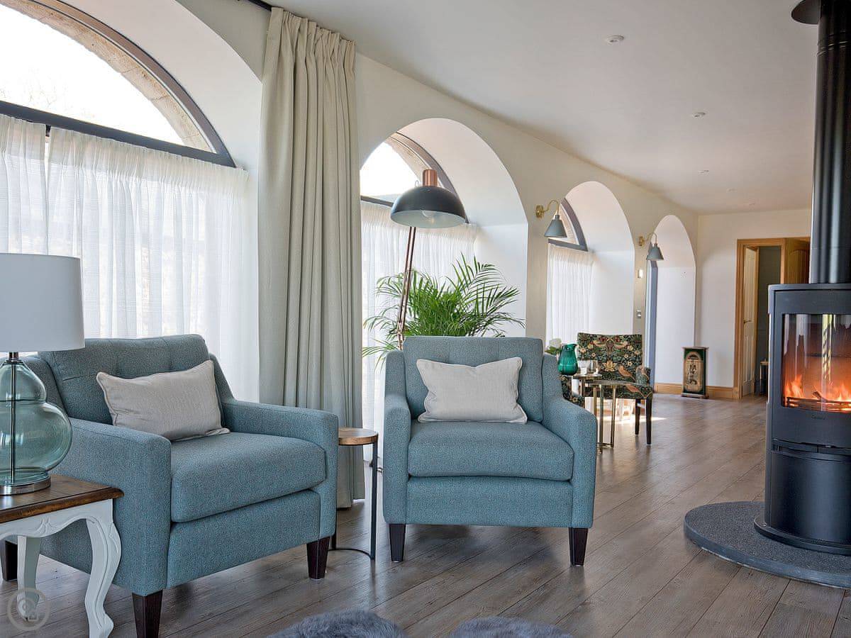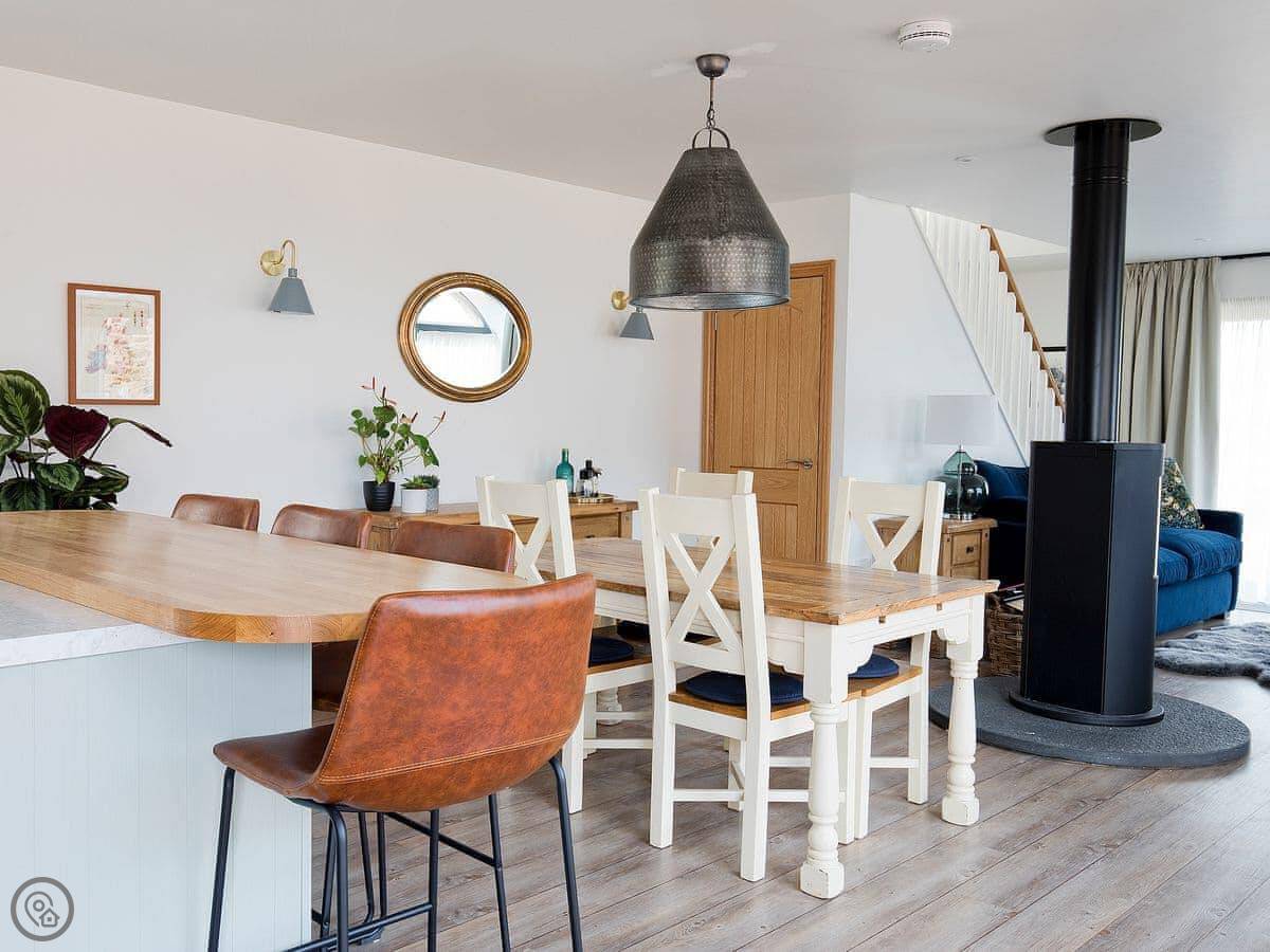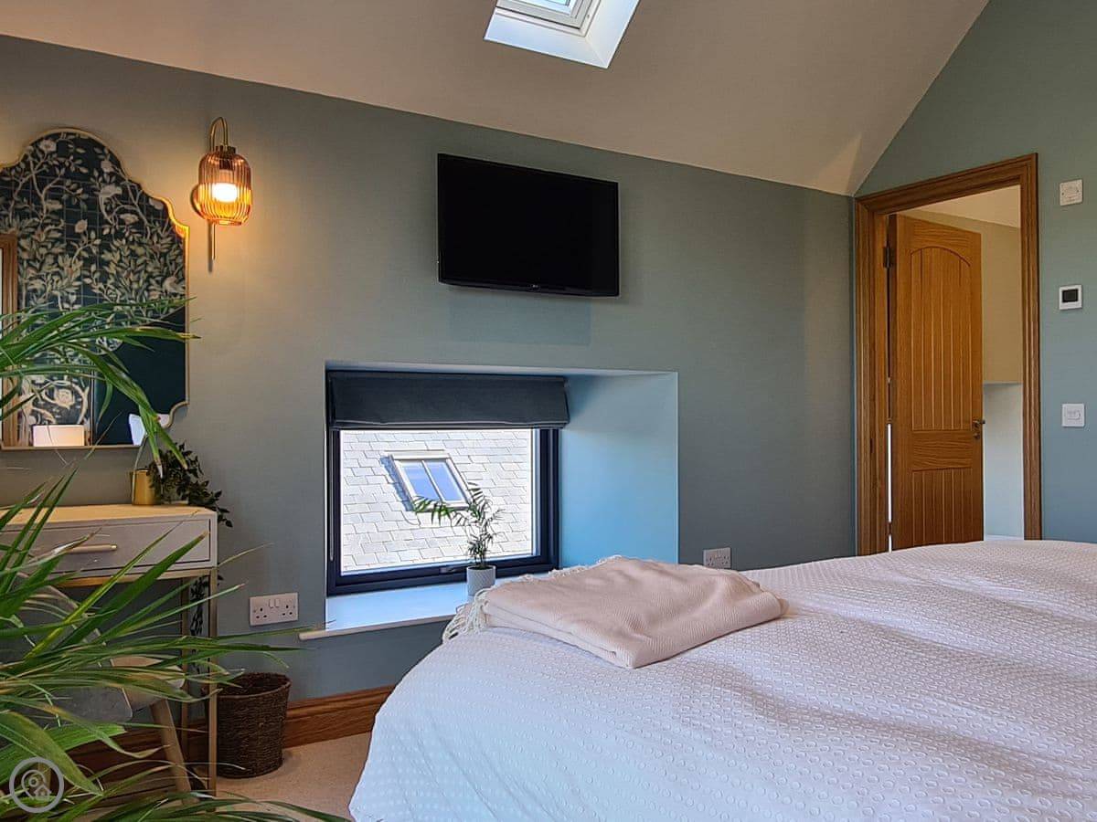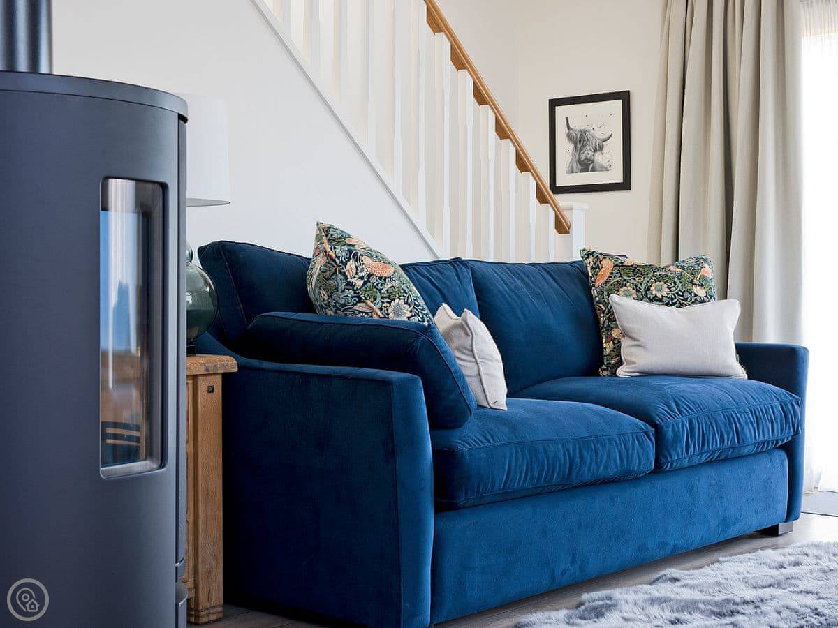 It sleeps four. Two bedrooms, both with super king beds you can split into twins if you prefer. Each bedroom has its own bathroom, one with a bath, one with a shower. It's got a 4 Star rating. It's comfortable, with things like a wood burner and underfloor heating.