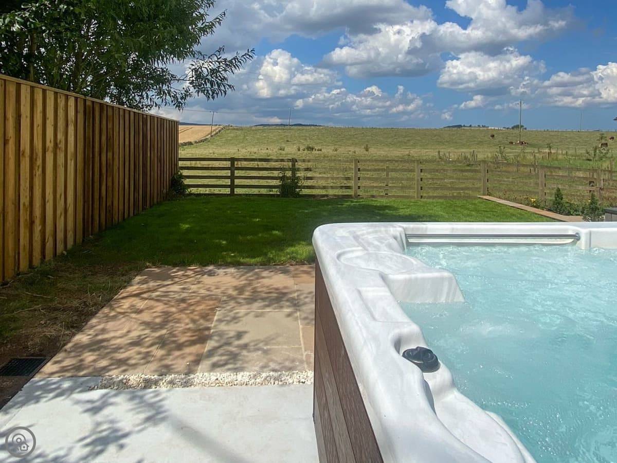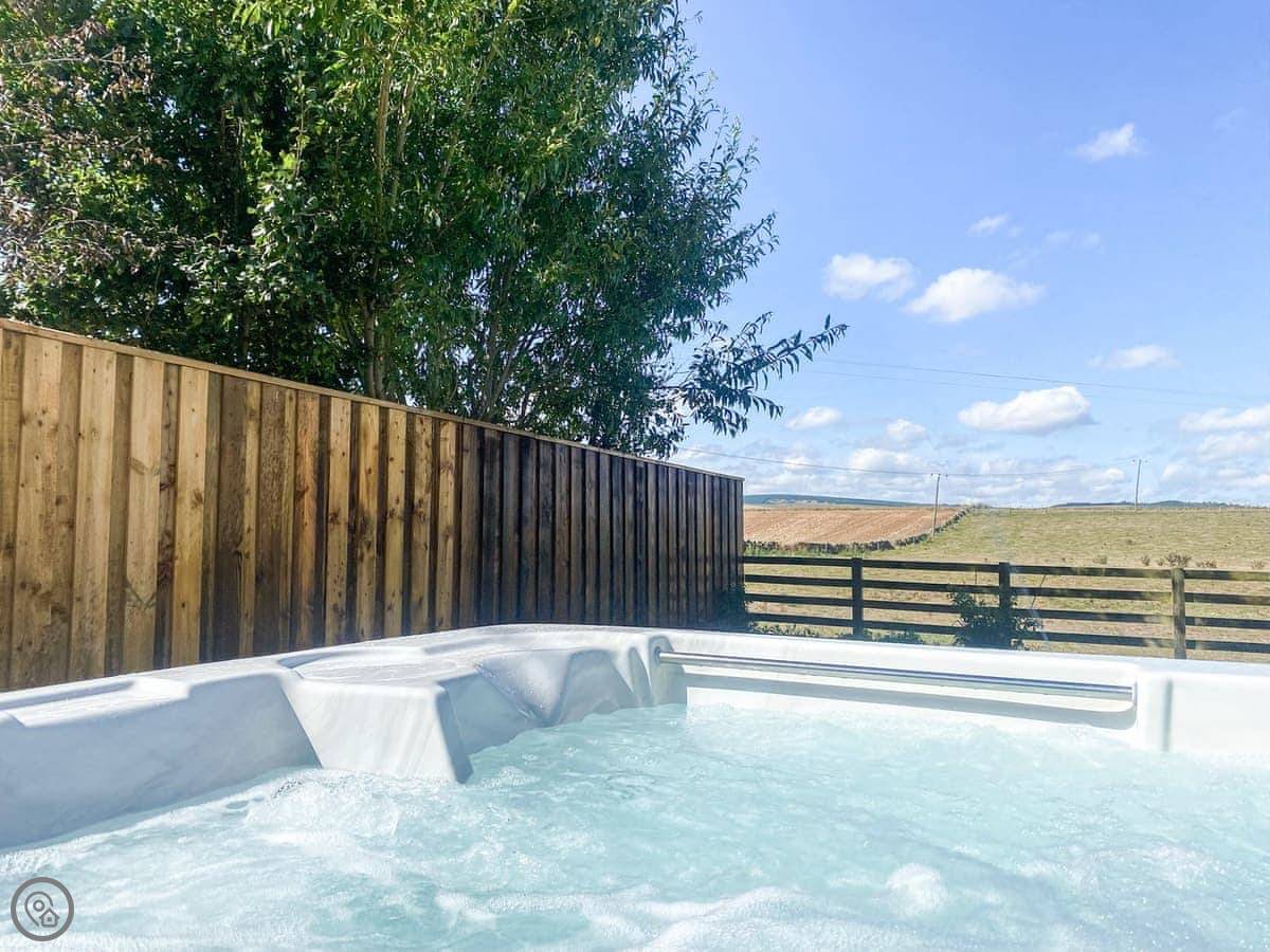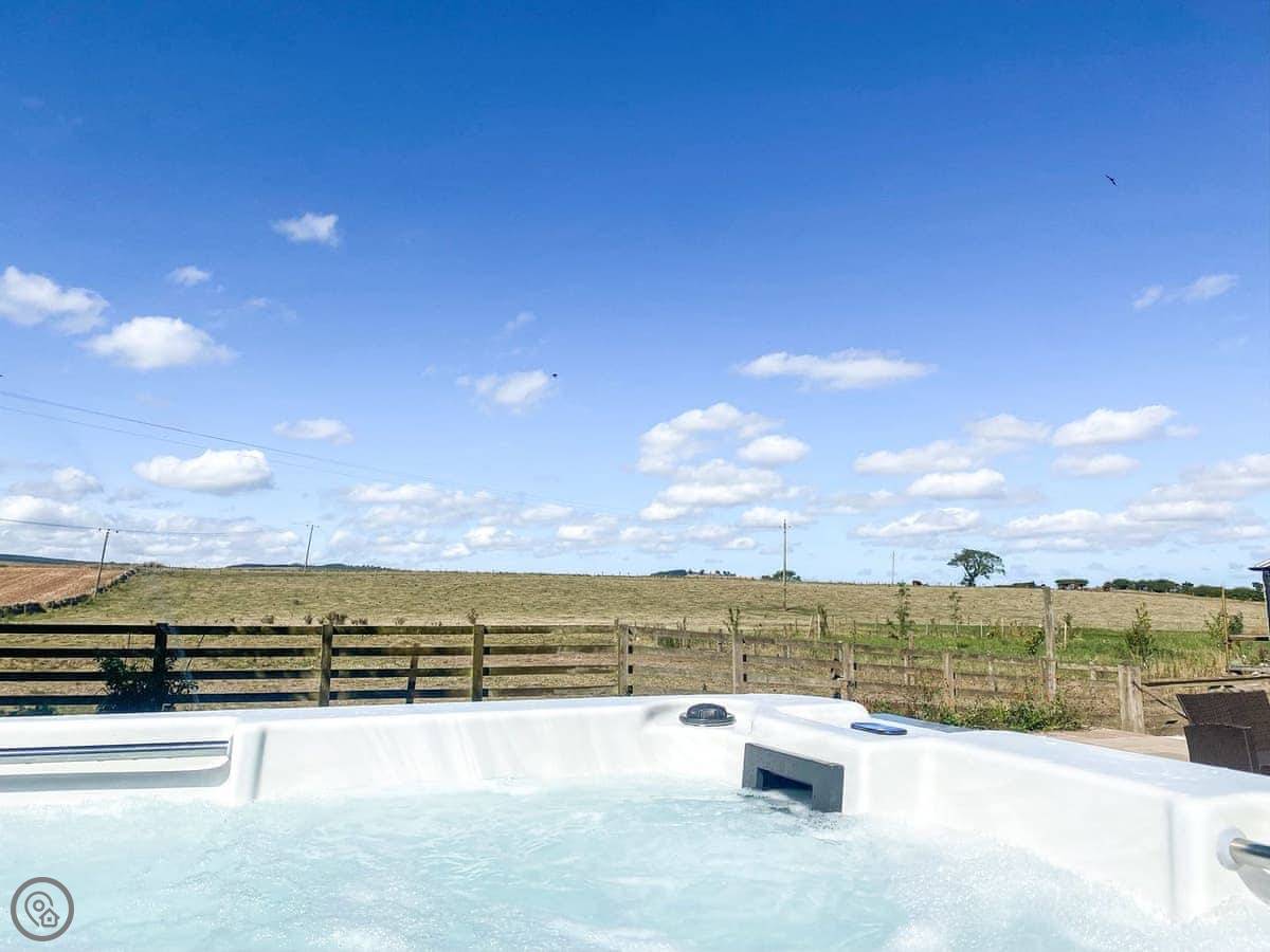 Outside, there's a patio area with a hot tub. The view is over fields. It's very quiet here.