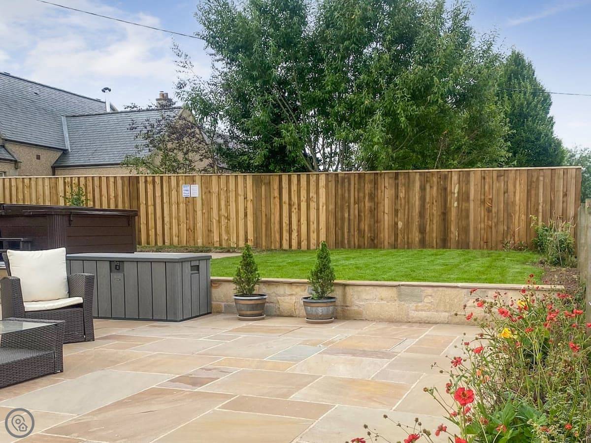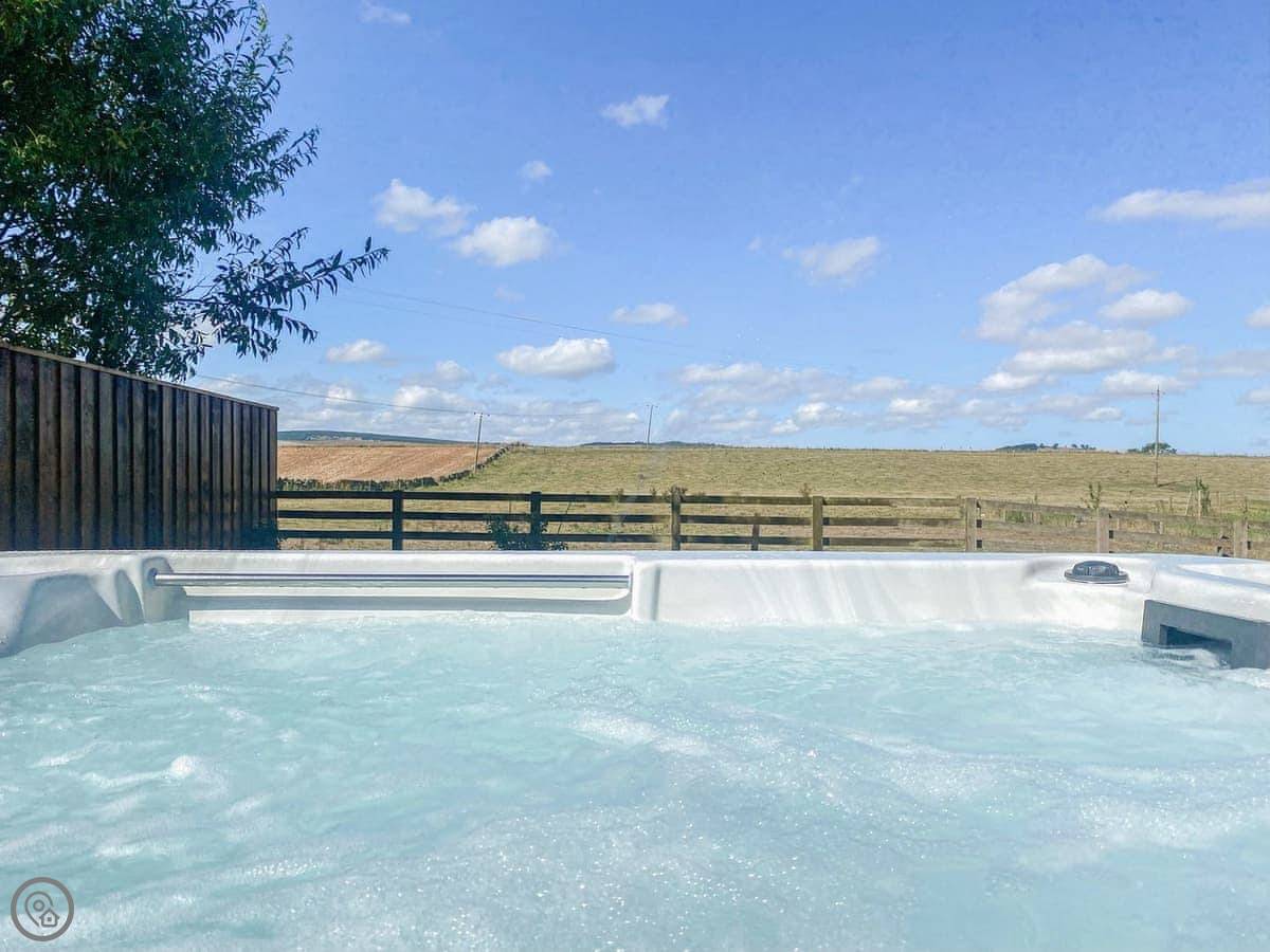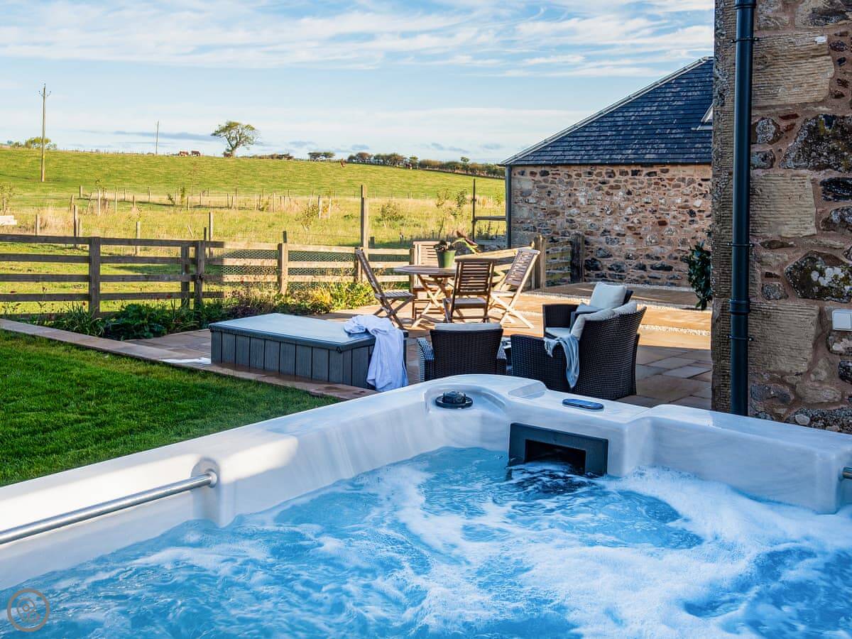 Outside, there's a patio area with a hot tub. The view is over fields. It's very quiet here.