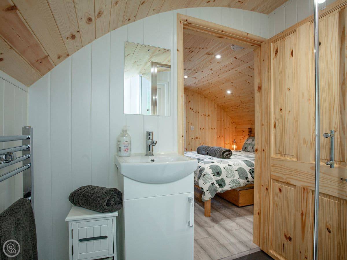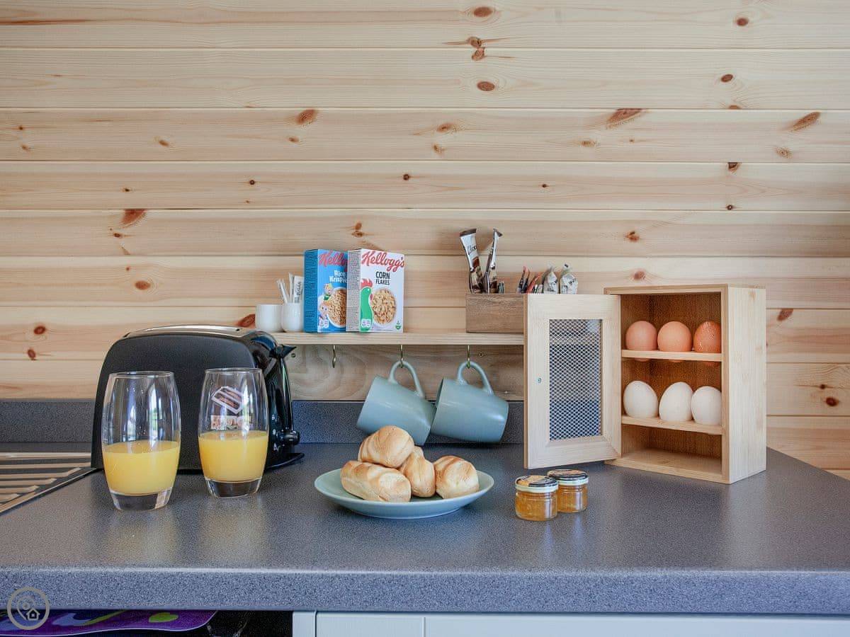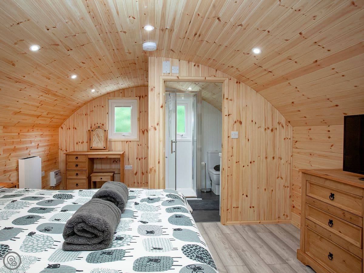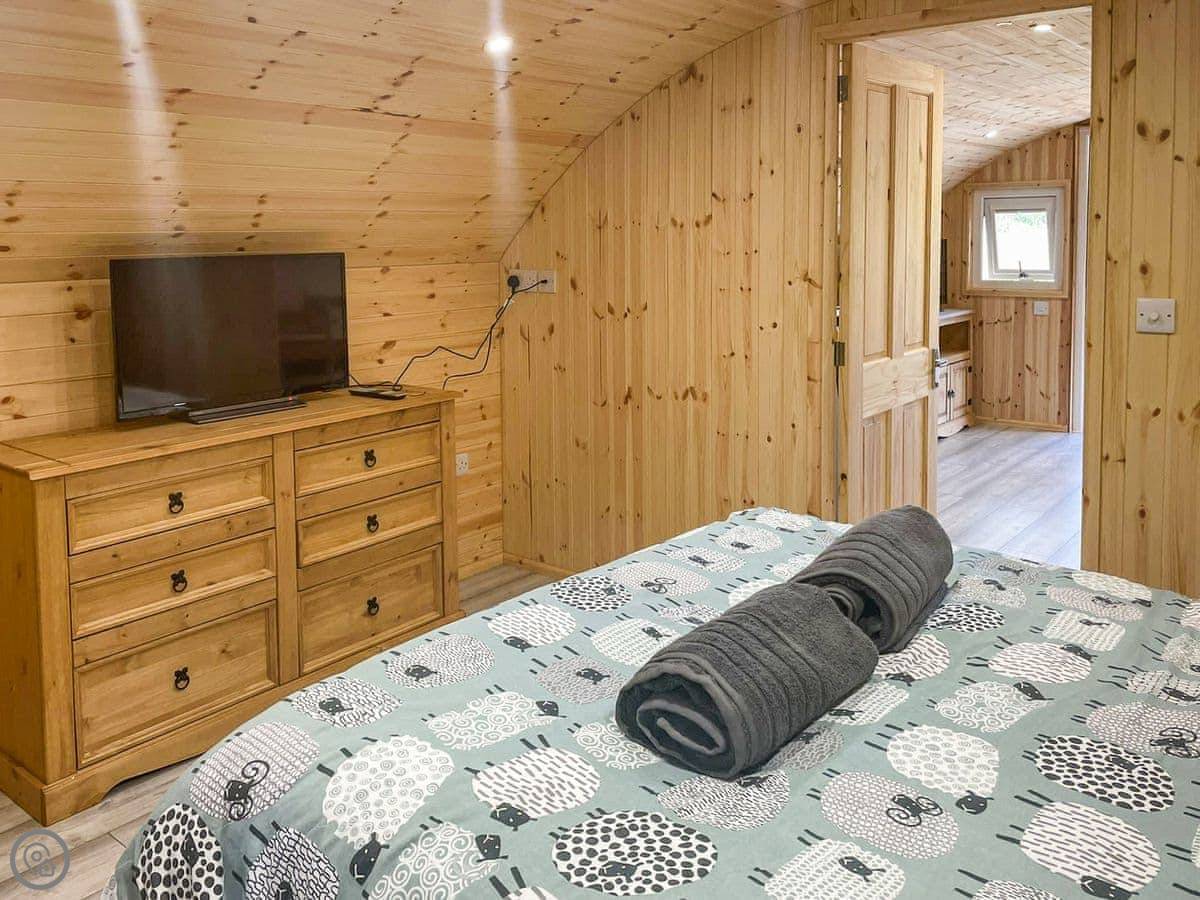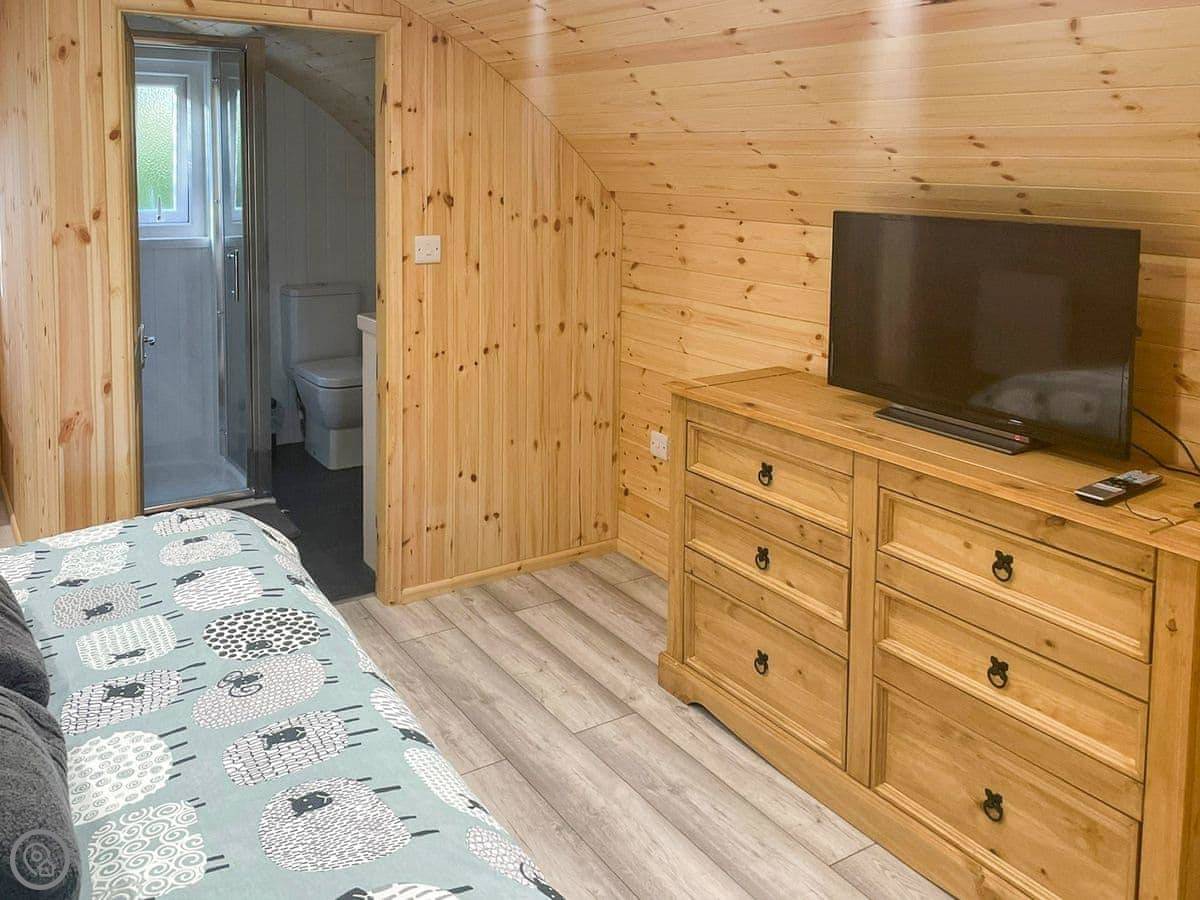 As you enter the lodge through the French doors, you find yourself in the open kitchen/living/dining area. The kitchen is fully equipped with electric oven, electric hob and fridge/freezer. The living/dining area benefits from dining table and chairs, a sofa bed as additional sleeping and a TV. The bedroom contains a kingsize bed with wall mounted TV and en-suite shower room. The lodge has a lovely small decked and patio area to the front where guests can sit out and relax on the two zero-gravity garden chairs, looking out across the fields with various animals. Should you wish to bring your dogs along, a portable dog wash and towels are provided for your convenience.