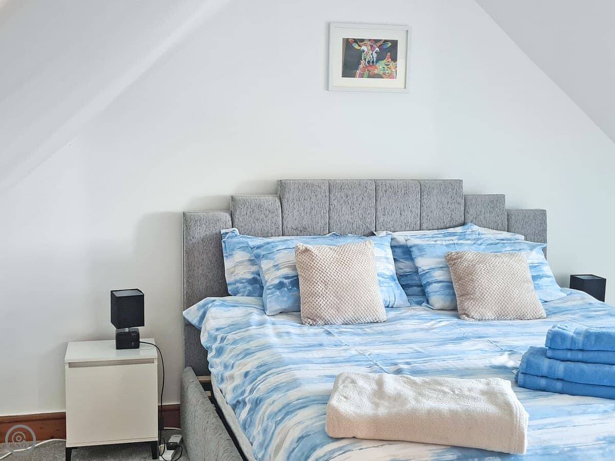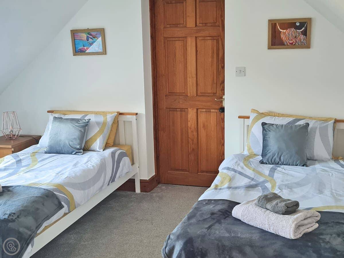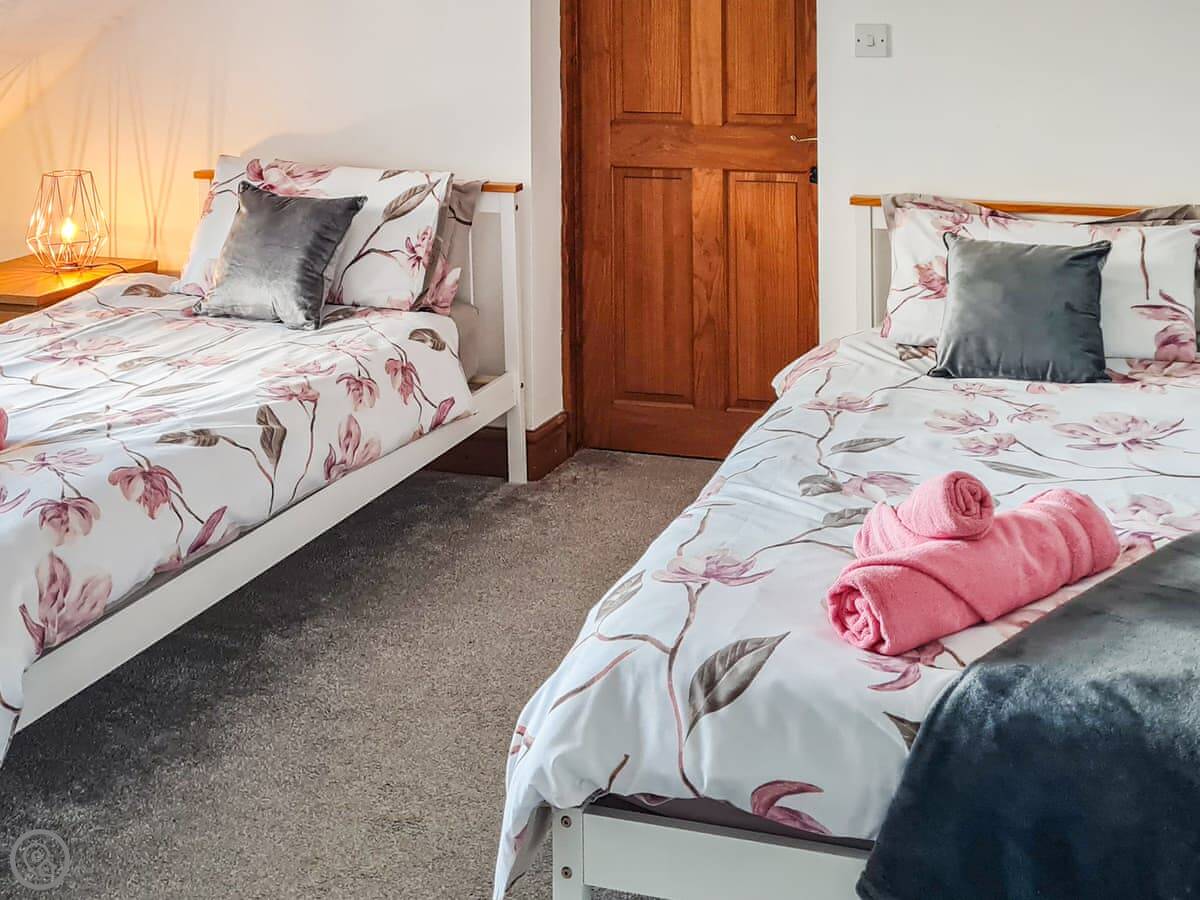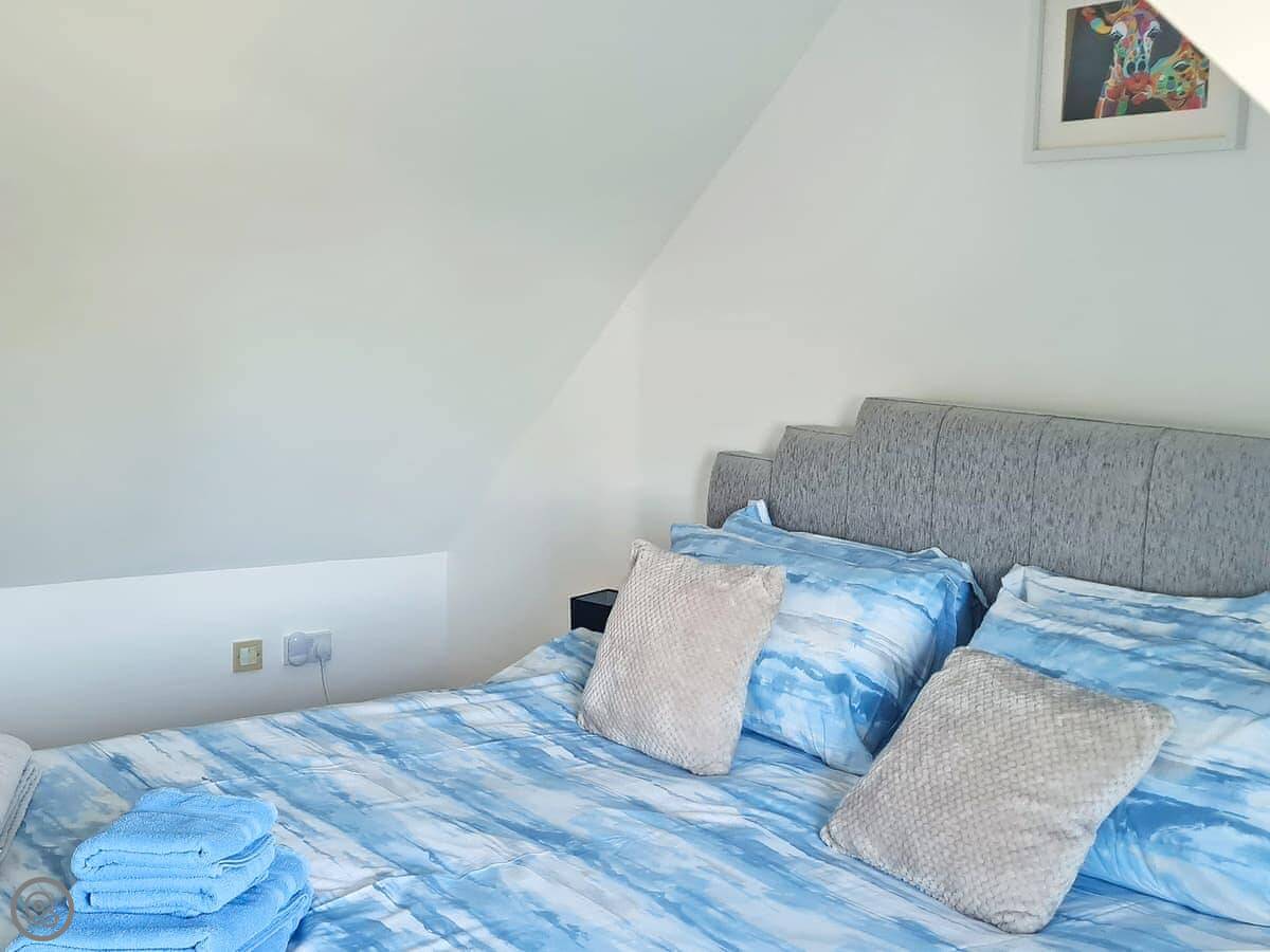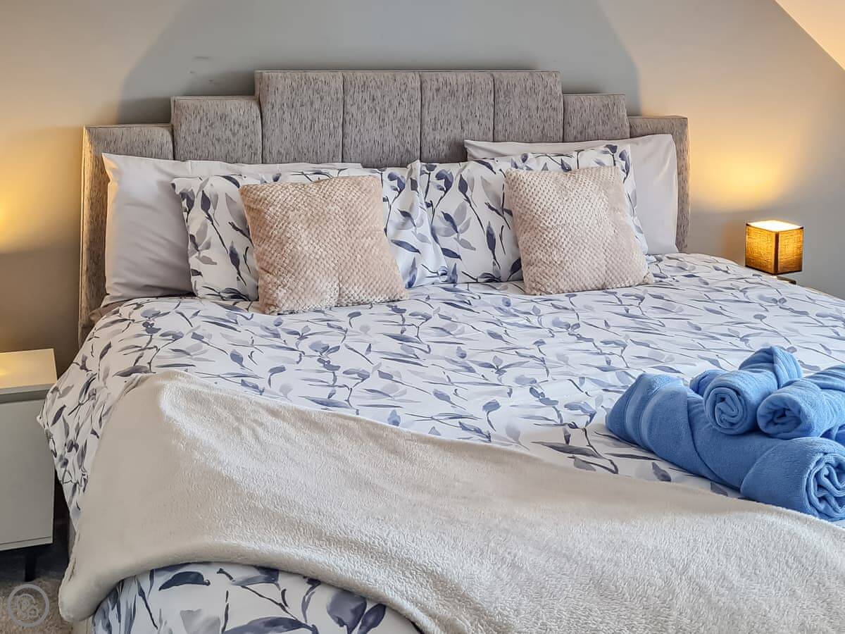 It sleeps six people. Three bedrooms, three bathrooms. Two of the bedrooms are upstairs and have en-suites. There's a third bedroom on the ground floor. It's got a 4 Star rating, so it's comfortable and has everything you'd need.
