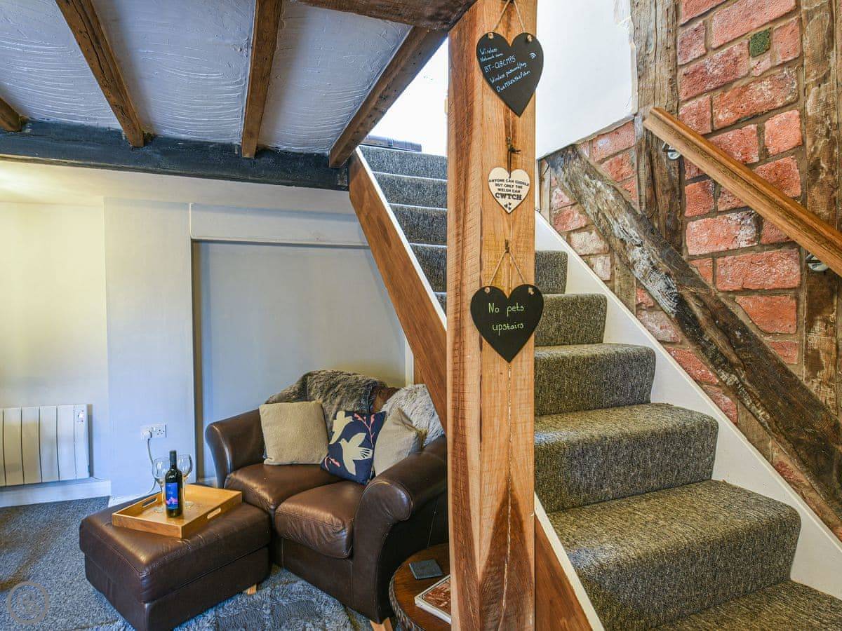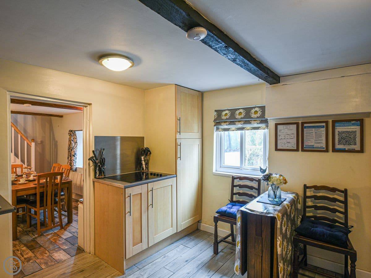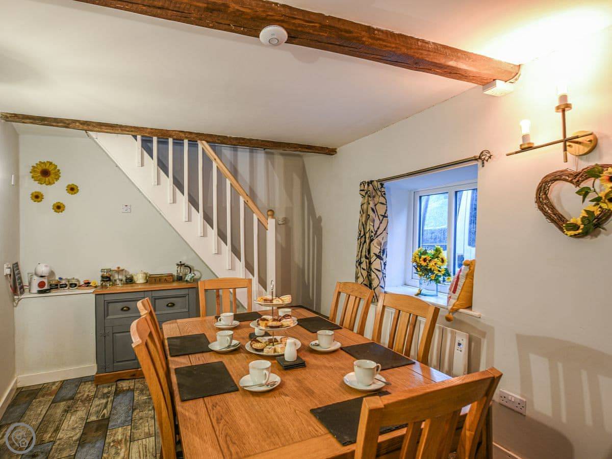 The kitchen has what you need, including a coffee machine. The dining table fits six. There are two staircases, which is a bit unusual. One from the lounge, one from near the kitchen. They're both normal cottage stairs.