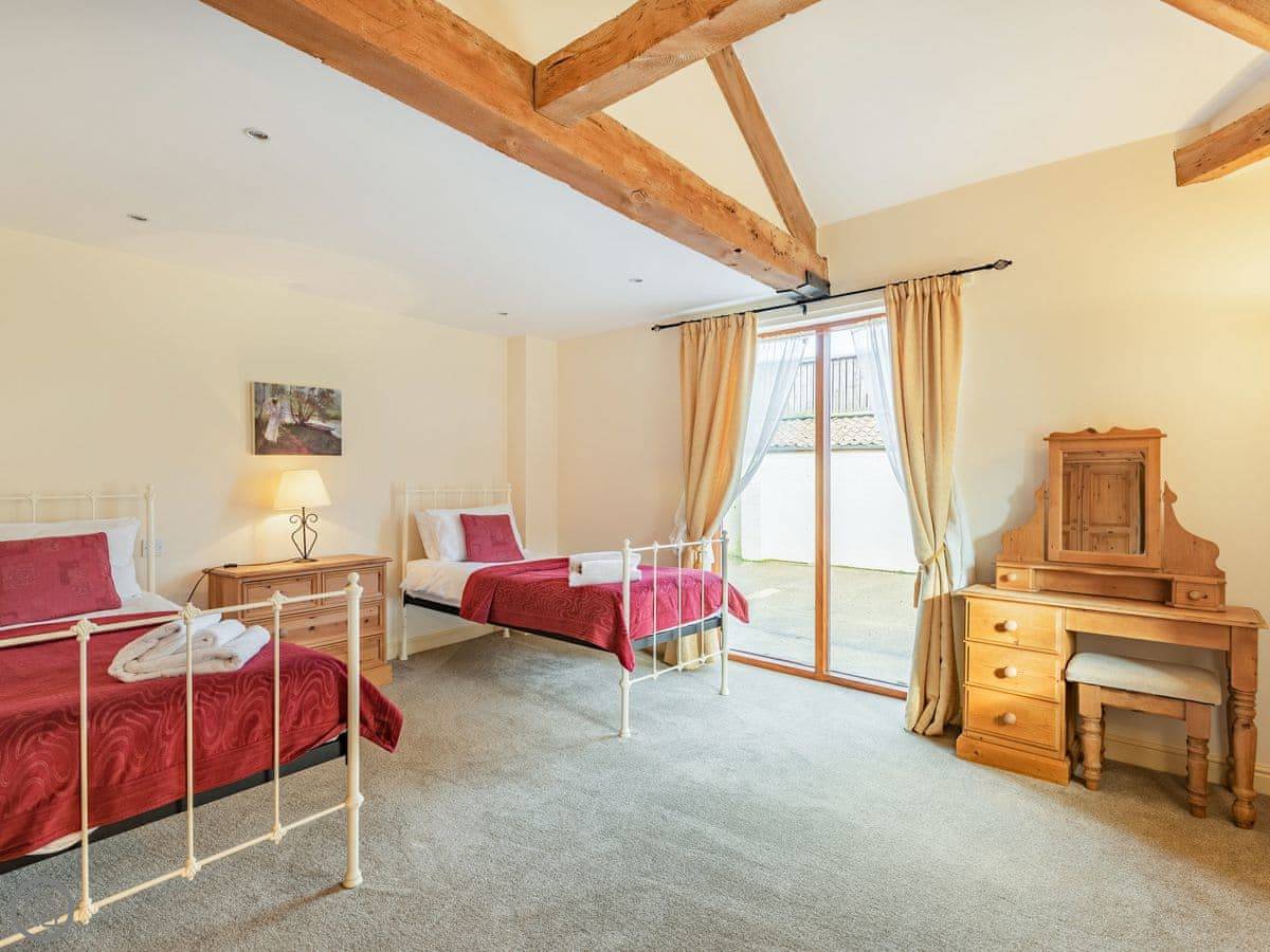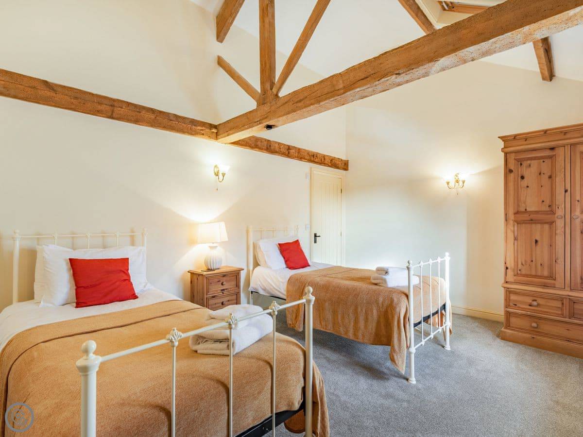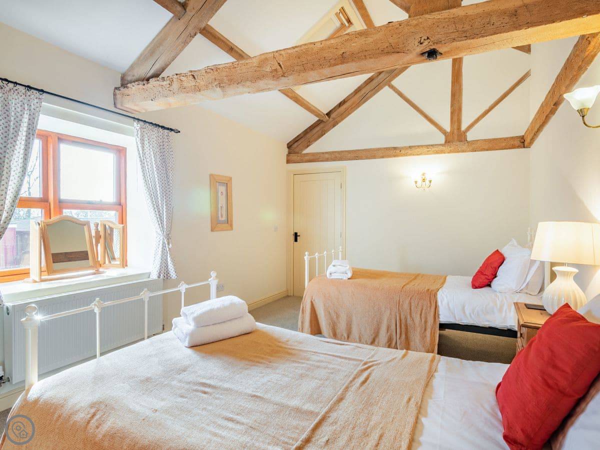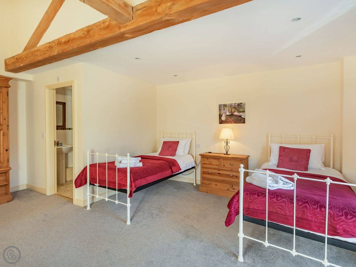 It's a barn conversion, so you've got the exposed brick and beams. It sleeps six, in three bedrooms. Each bedroom has its own bathroom, which is handy. There's a twin room on the ground floor. The stairs to the first floor are proper cottage stairs, a bit steeper than modern ones.