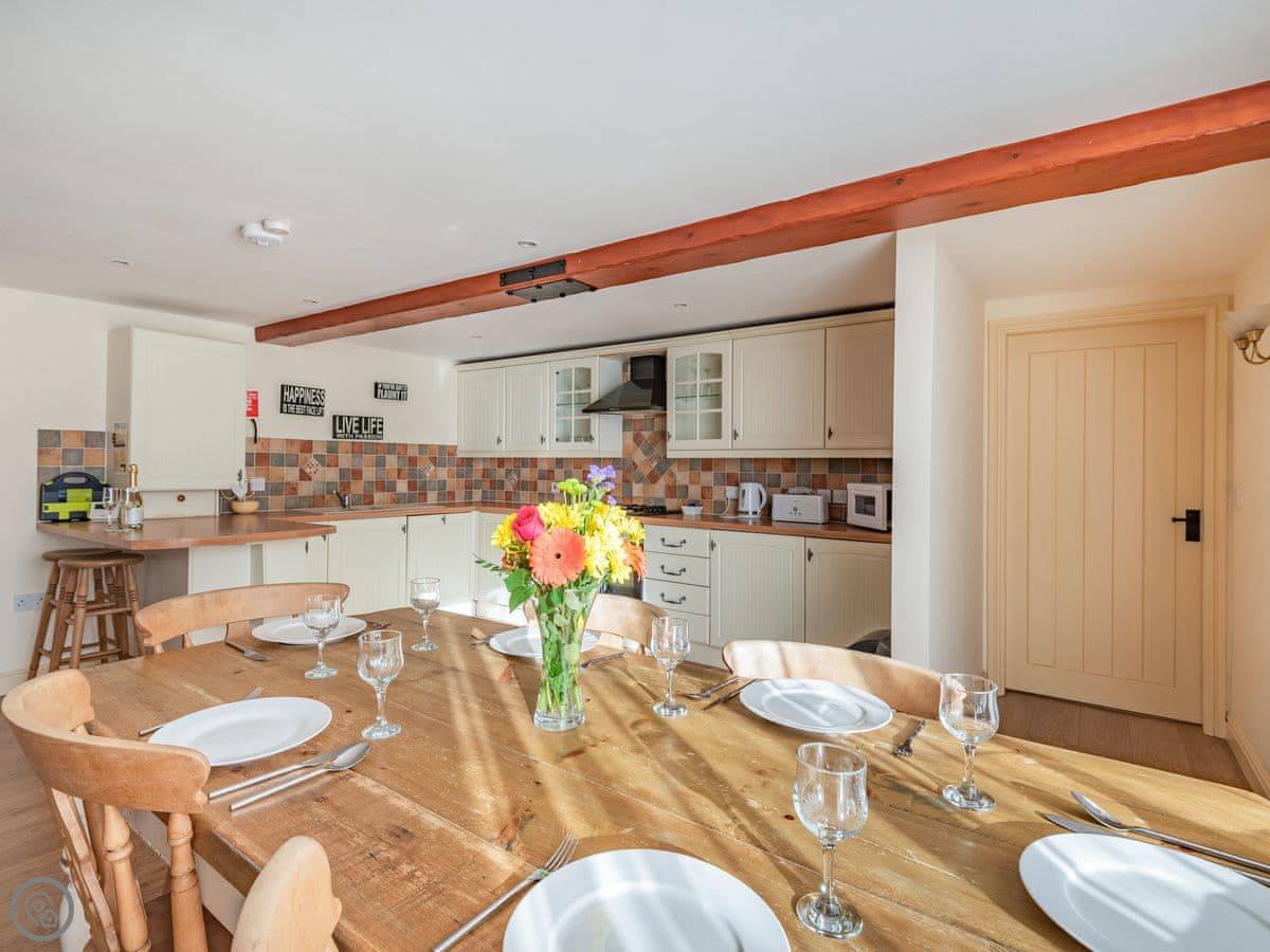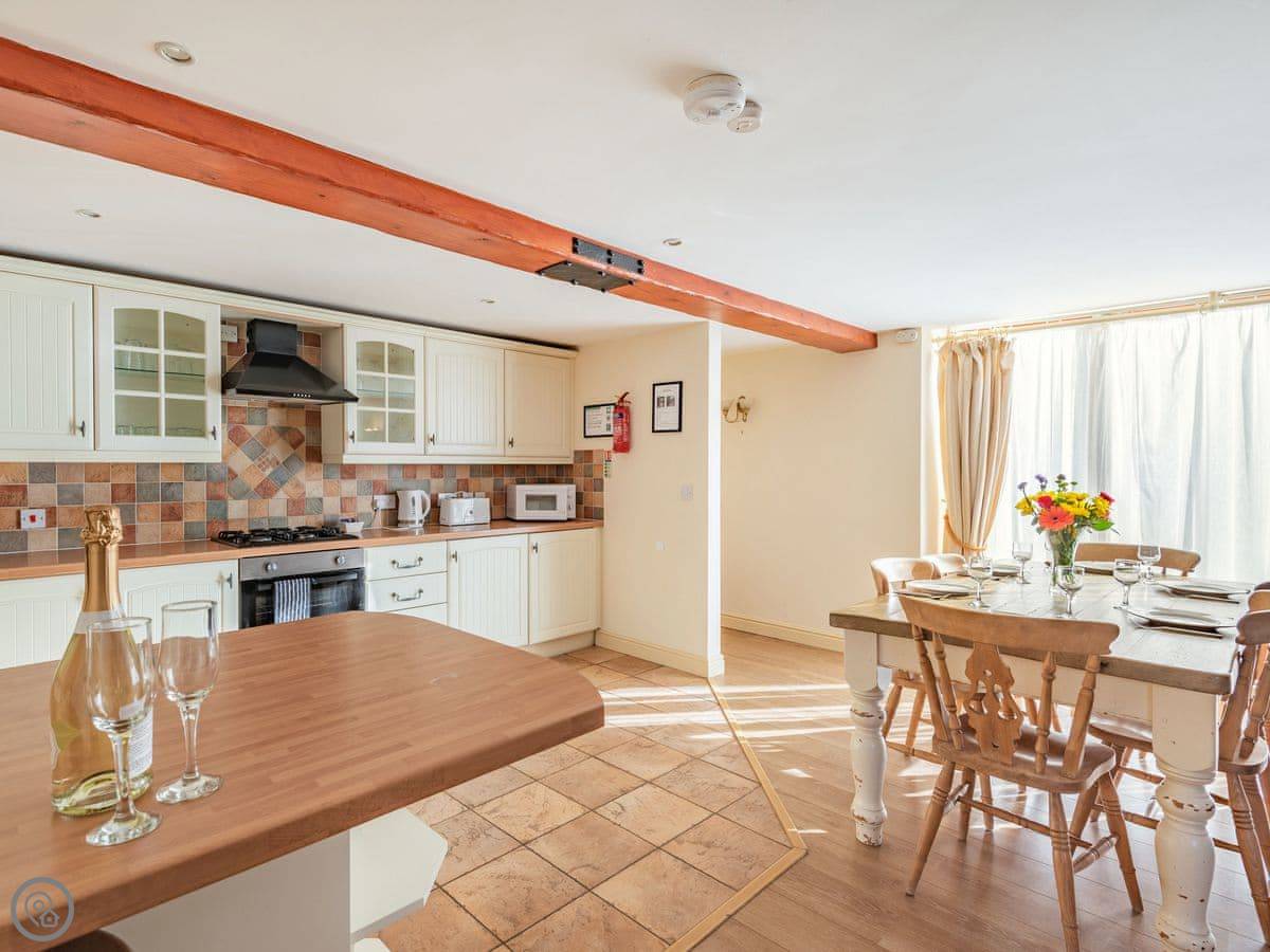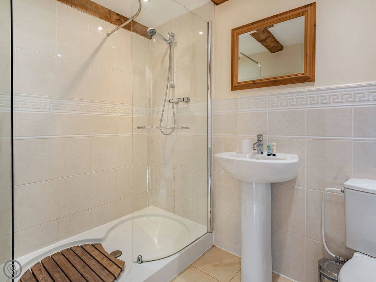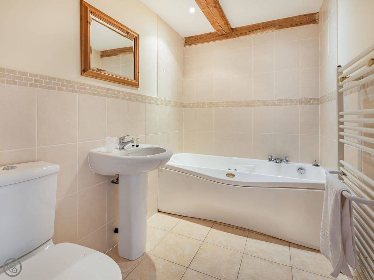 It's a barn conversion, so you've got the exposed brick and beams. It sleeps six, in three bedrooms. Each bedroom has its own bathroom, which is handy. There's a twin room on the ground floor. The stairs to the first floor are proper cottage stairs, a bit steeper than modern ones.