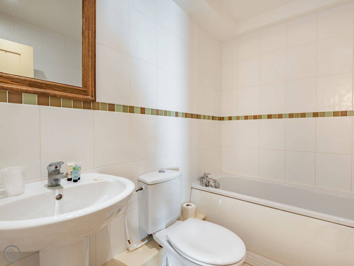 The main living area is open plan with big windows. There's a decent kitchen with a gas hob and electric oven, plus a dishwasher. The sofas are comfortable. Outside, you have your own patio seating area in a shared courtyard. There's parking right there, and an electric vehicle charger.