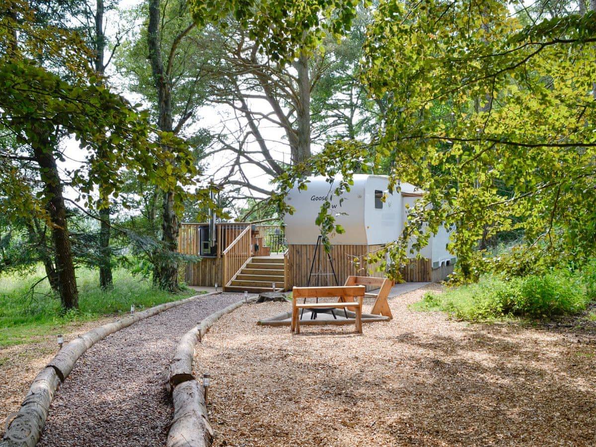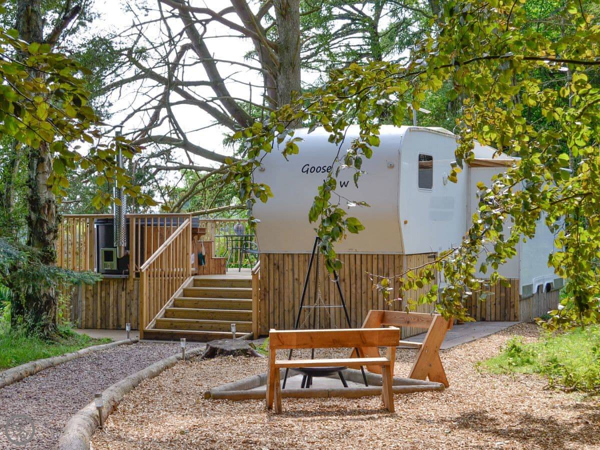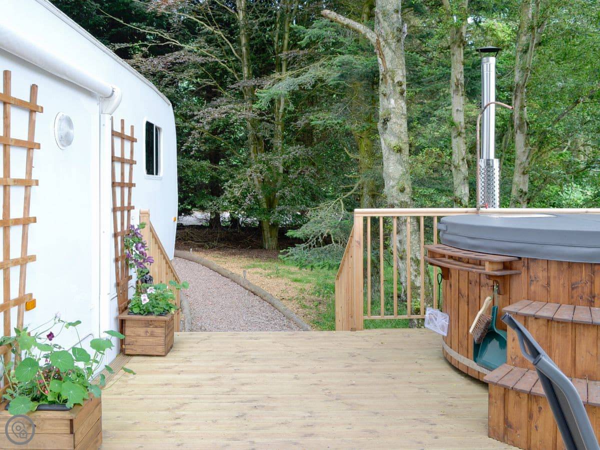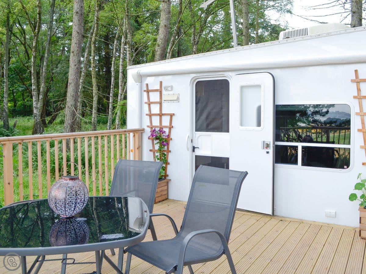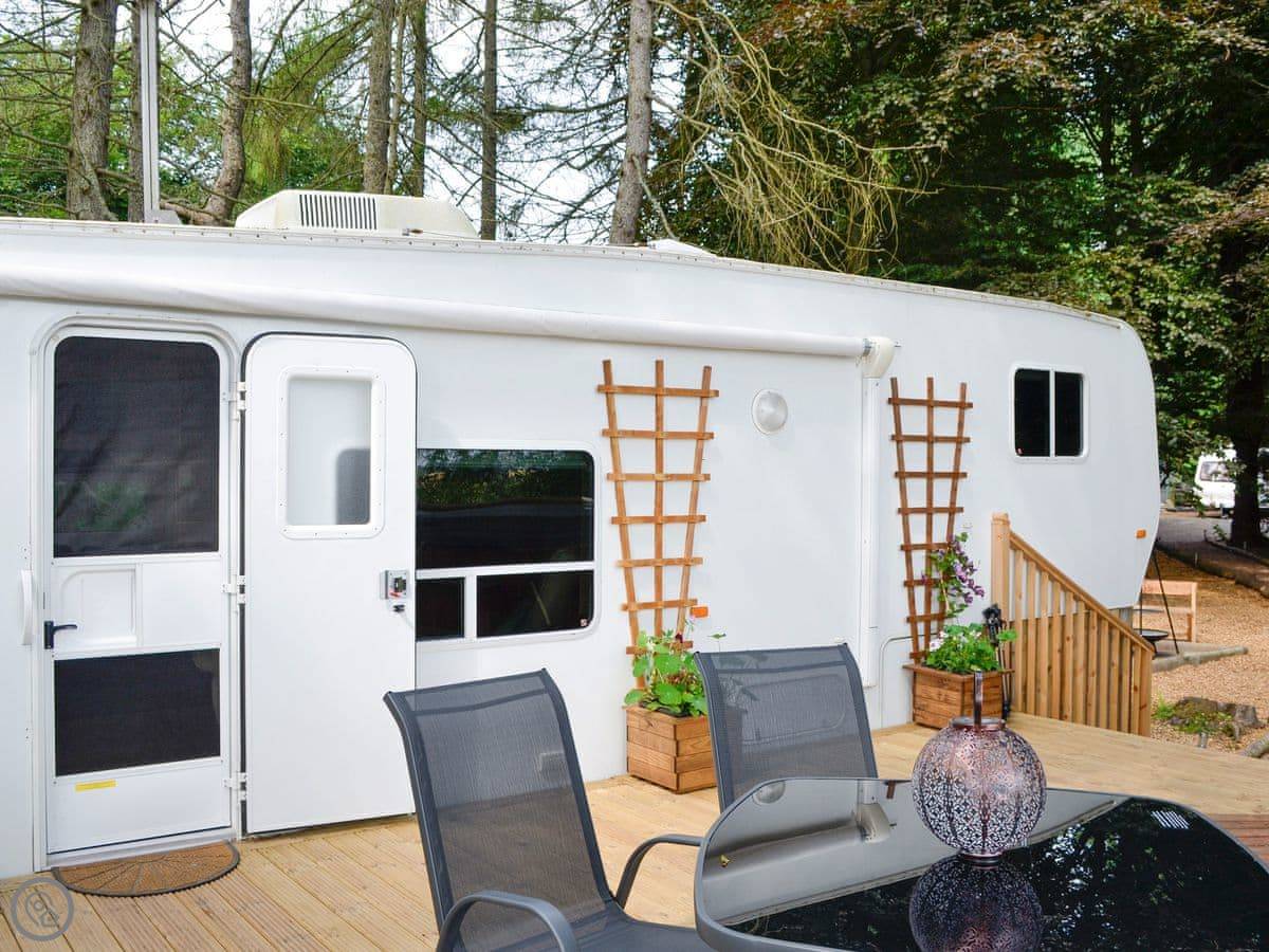 What a fabulous property! If you are looking for a complete rest and get-away from it all, this is the choice for you. In an absolute oasis of peace and tranquility this wonderful use of an original Gooseneck Caravan completely makes the most of the amazing location, tucked away in a peaceful corner of the owner’s 27 acres of grounds. There is a large decking area right in front, with a wood fired hot tub, table and chairs and if the weather is cloudy, a huge retractable awning which enables you to sit out whatever the weather and enjoy the expansive views over the meadows, fields and beyond to the Montrose Basin.