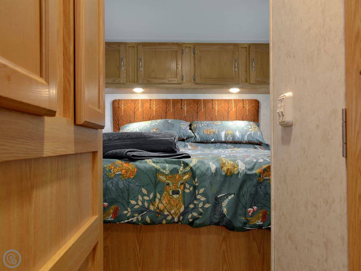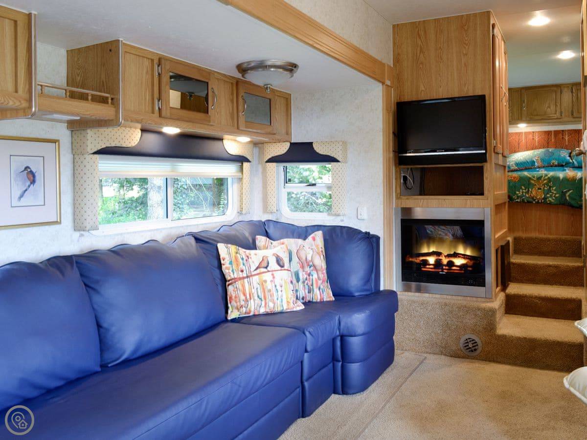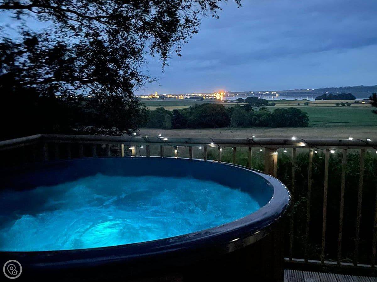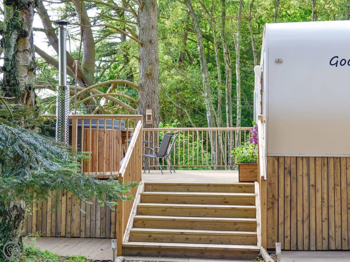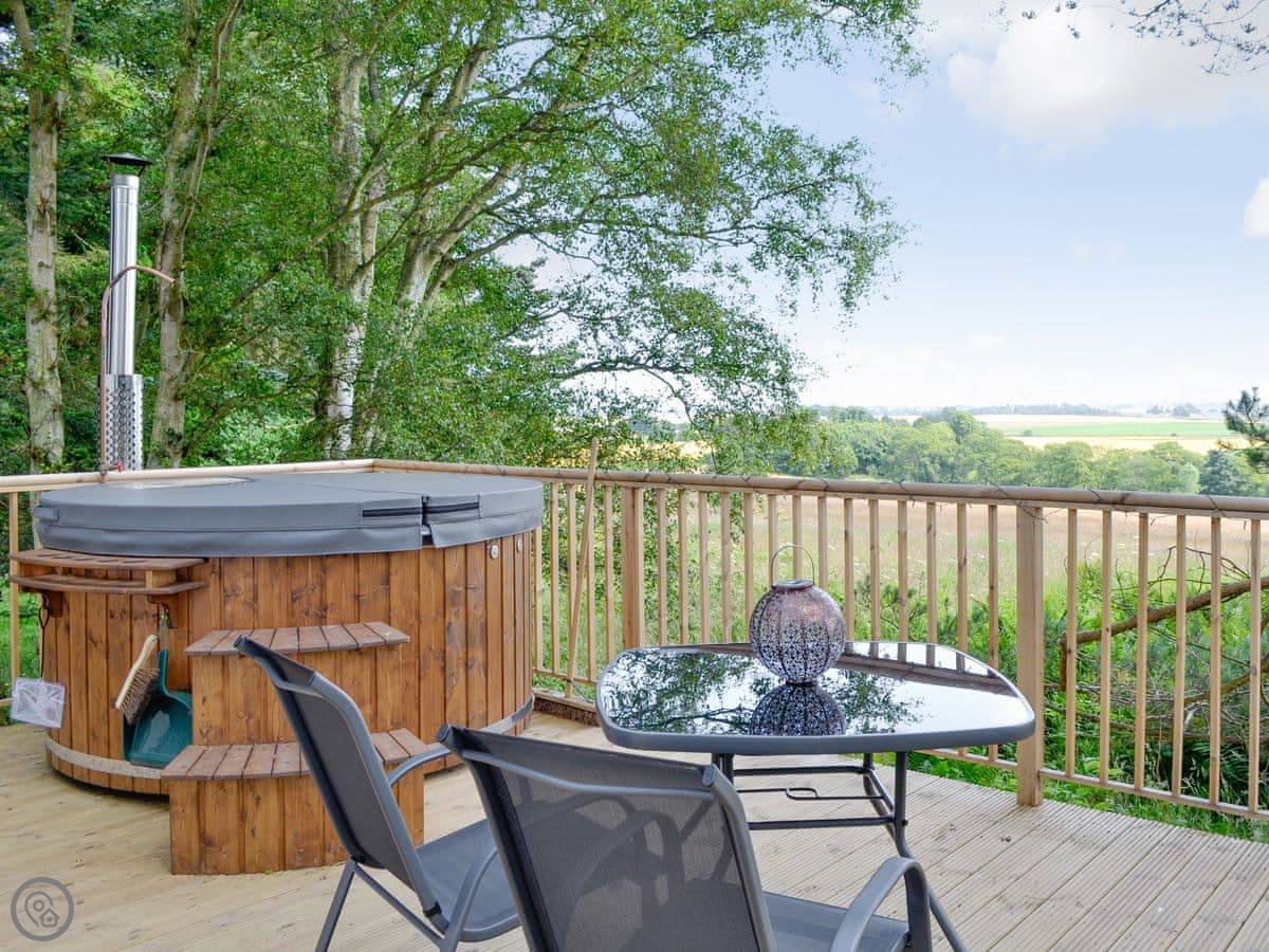 What a fabulous property! If you are looking for a complete rest and get-away from it all, this is the choice for you. In an absolute oasis of peace and tranquility this wonderful use of an original Gooseneck Caravan completely makes the most of the amazing location, tucked away in a peaceful corner of the owner’s 27 acres of grounds. There is a large decking area right in front, with a wood fired hot tub, table and chairs and if the weather is cloudy, a huge retractable awning which enables you to sit out whatever the weather and enjoy the expansive views over the meadows, fields and beyond to the Montrose Basin.