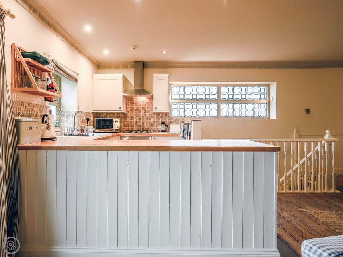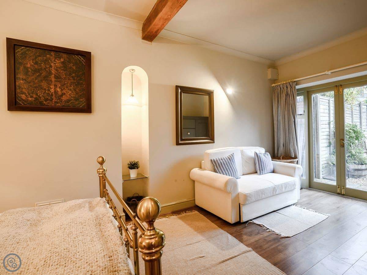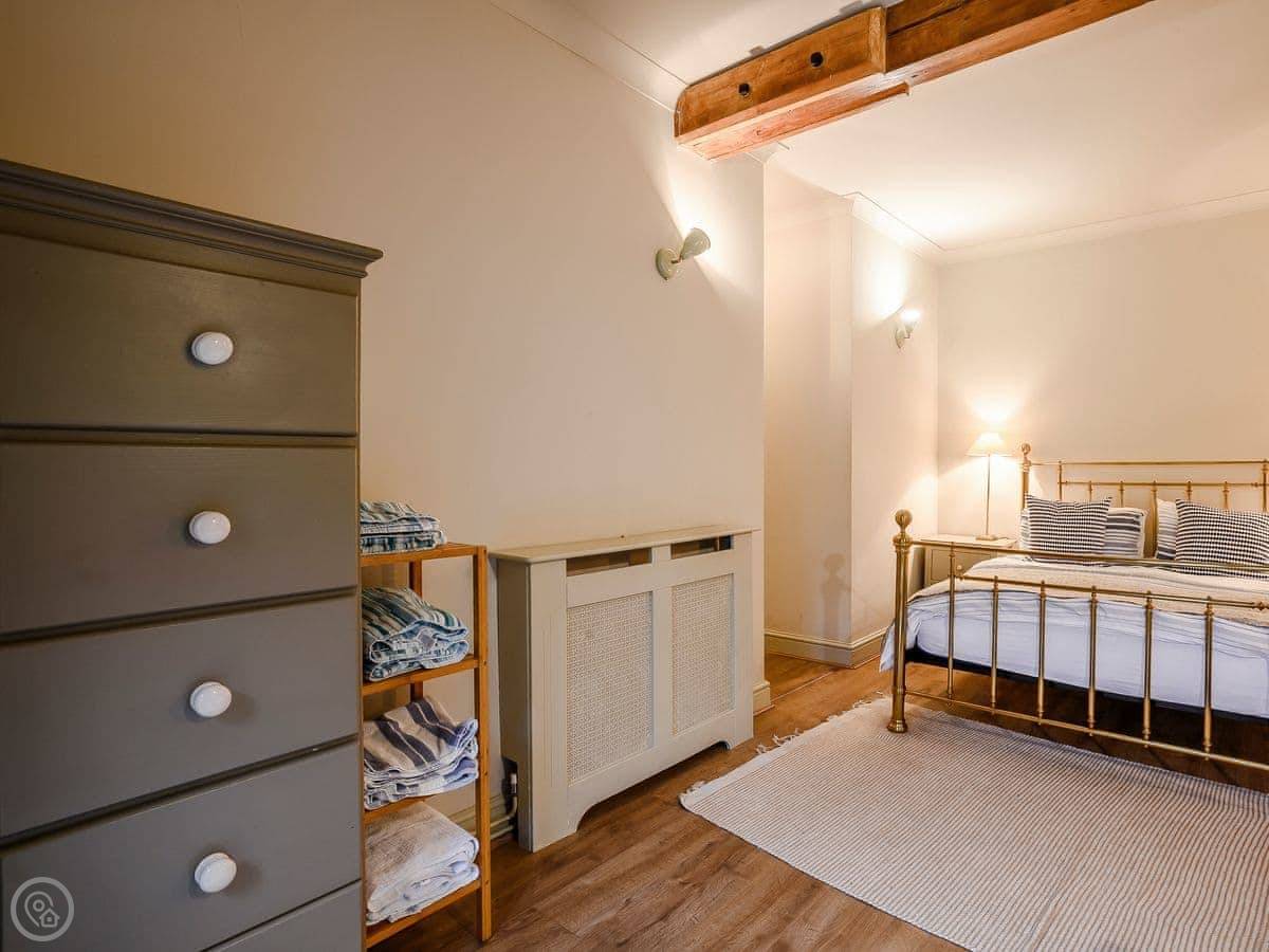 The layout is unusual. It's an upside-down house. The living room, kitchen, and dining area are all upstairs. This is so you get a view of the sea from the main room. There are patio doors upstairs that open onto a Juliet balcony, so you can get the air in. Downstairs are the two bedrooms and a shower room. It sleeps six, with one double bedroom and another room that has a double sofa bed in it. The stairs are quite steep and narrow, which is pretty standard for a cottage like this.