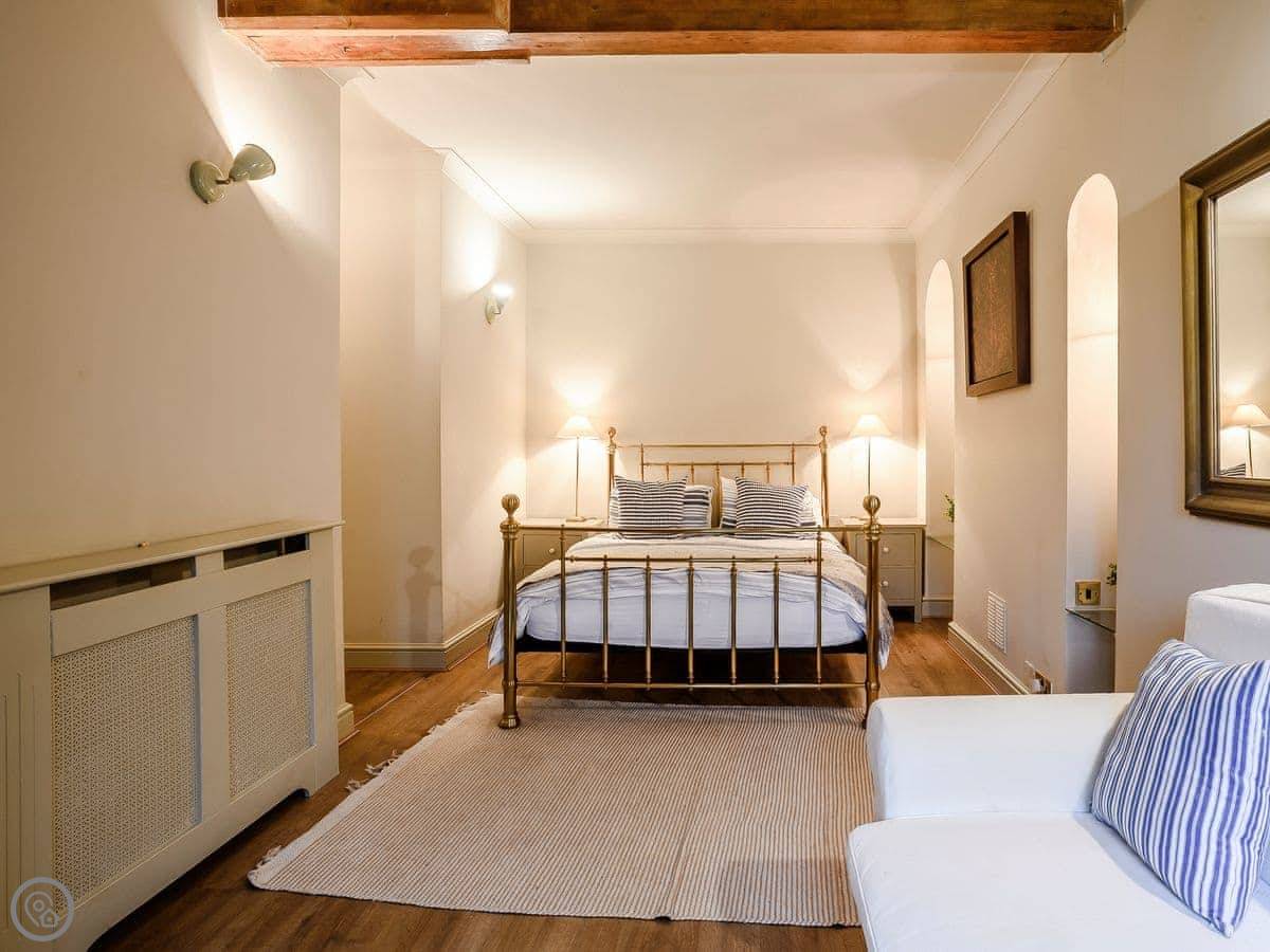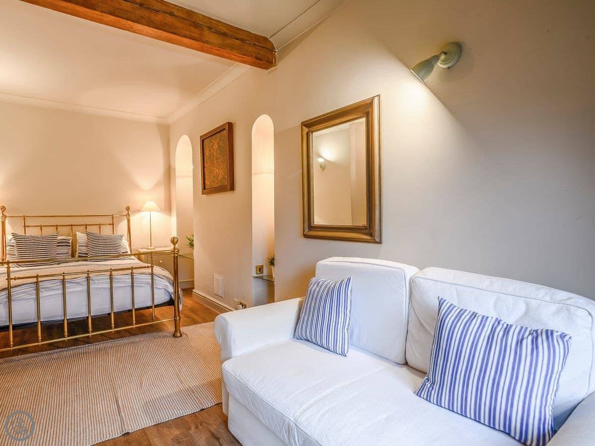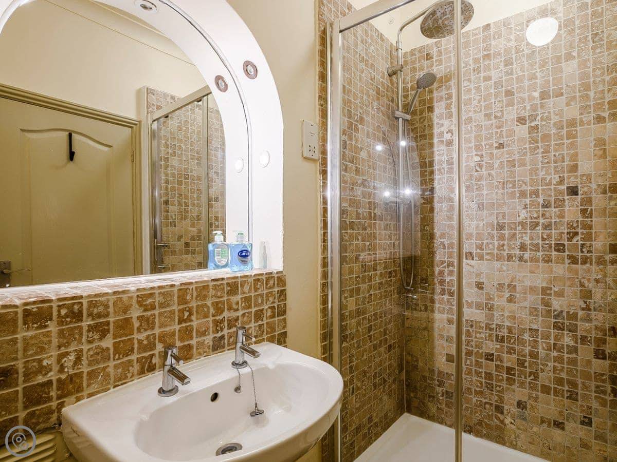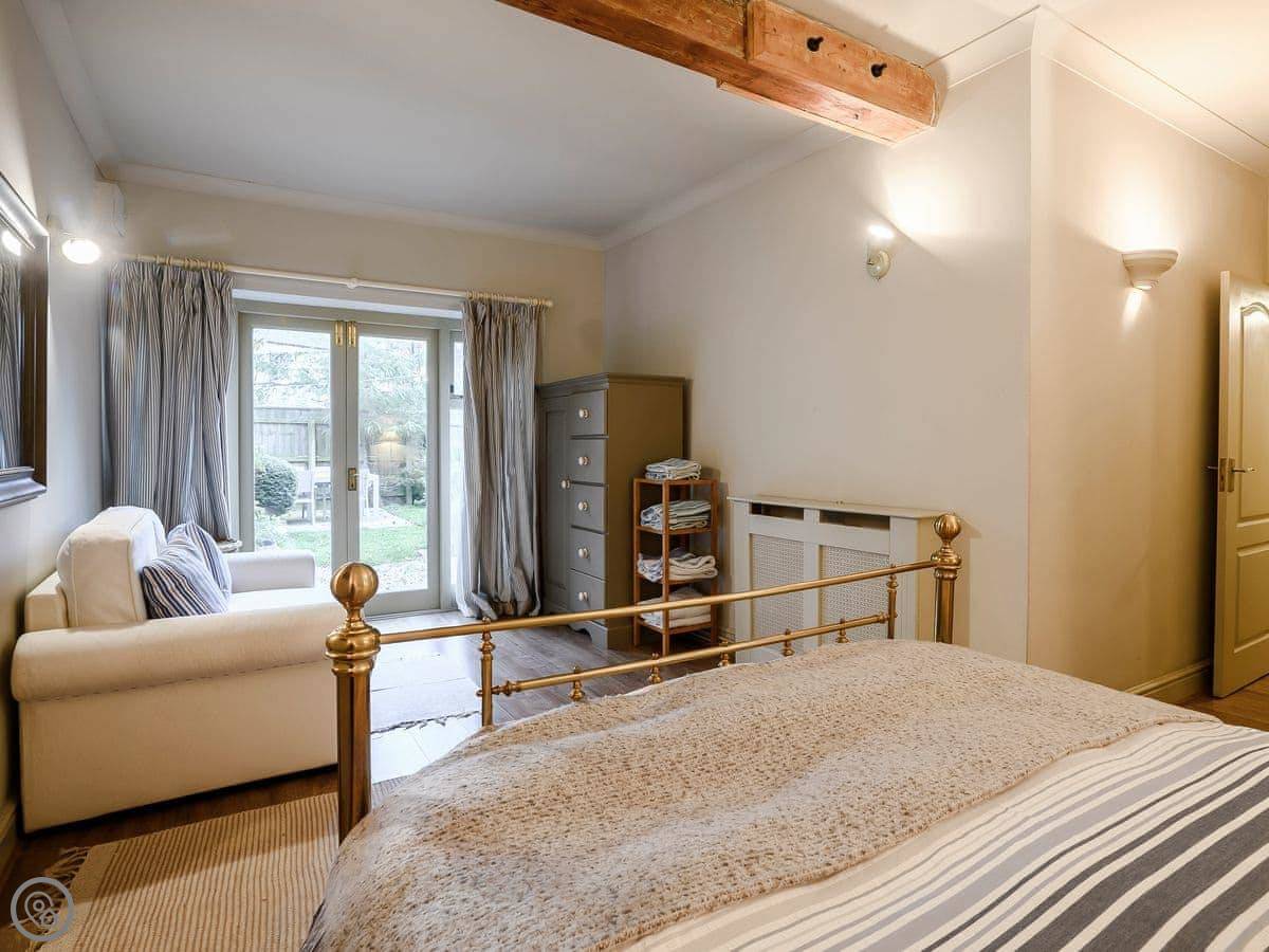 The layout is unusual. It's an upside-down house. The living room, kitchen, and dining area are all upstairs. This is so you get a view of the sea from the main room. There are patio doors upstairs that open onto a Juliet balcony, so you can get the air in. Downstairs are the two bedrooms and a shower room. It sleeps six, with one double bedroom and another room that has a double sofa bed in it. The stairs are quite steep and narrow, which is pretty standard for a cottage like this.