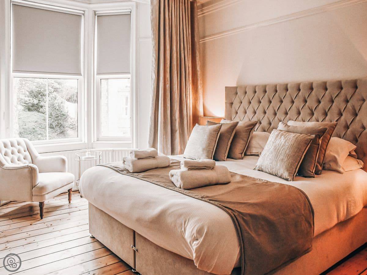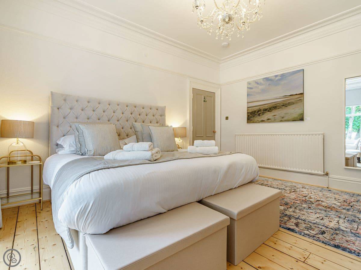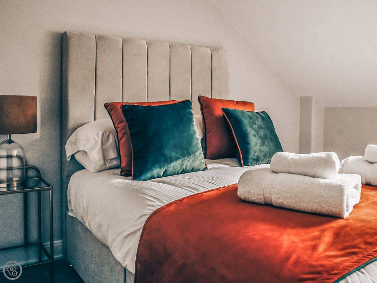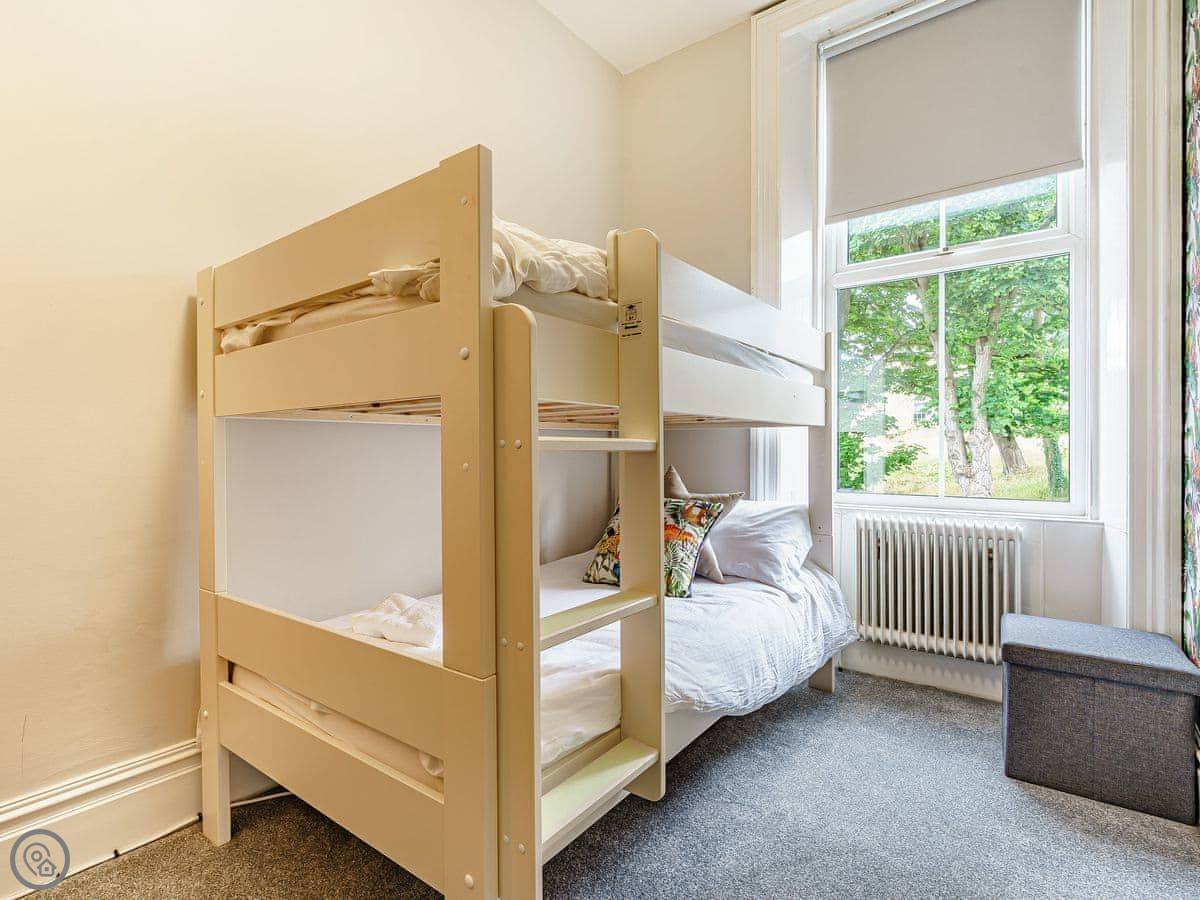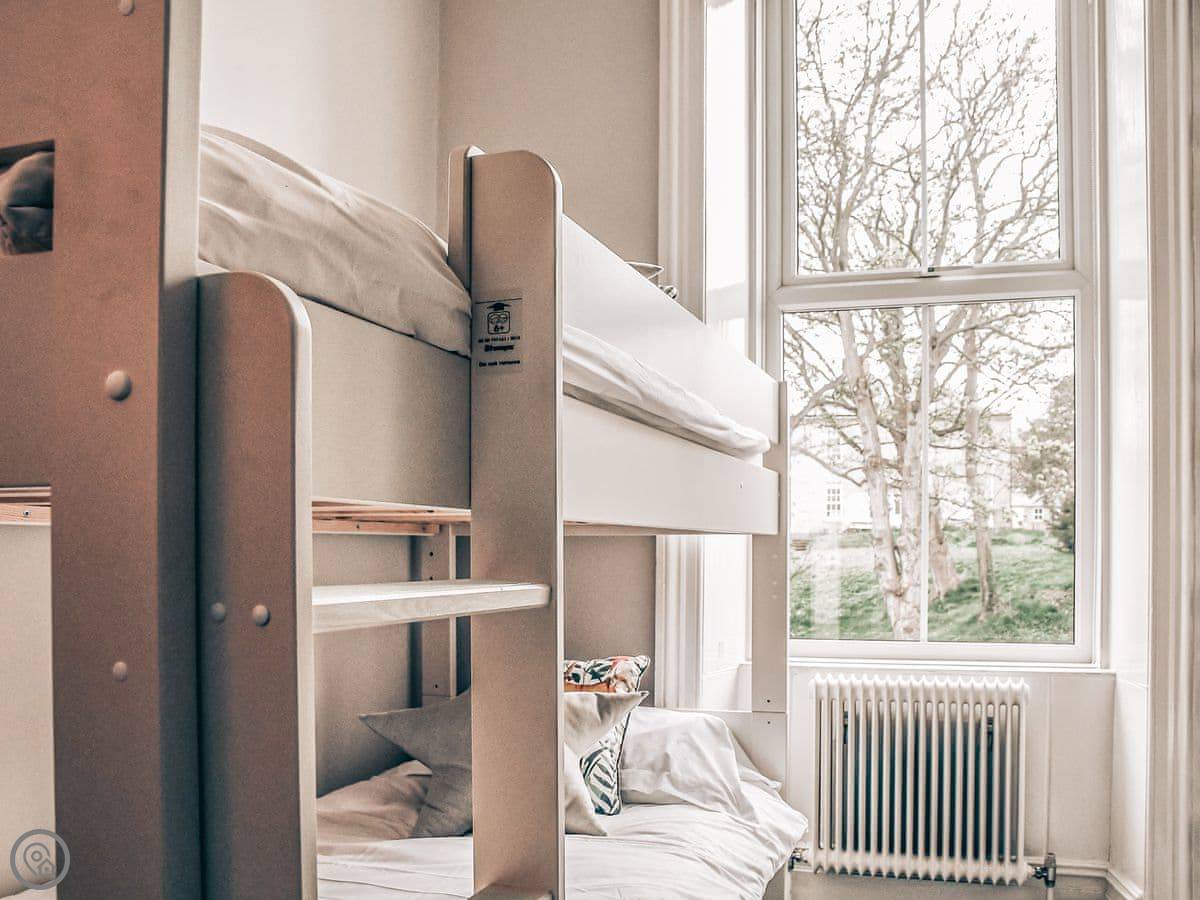 The bedrooms are all a good size. One super king, two kings, a double, and a room with bunk beds. The main bathroom has a roll-top bath and a separate shower. Towels and bedding are provided.