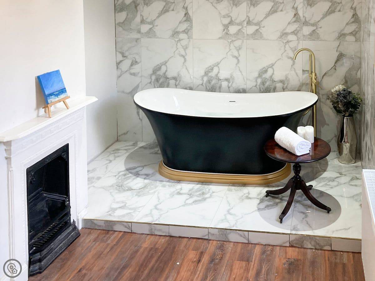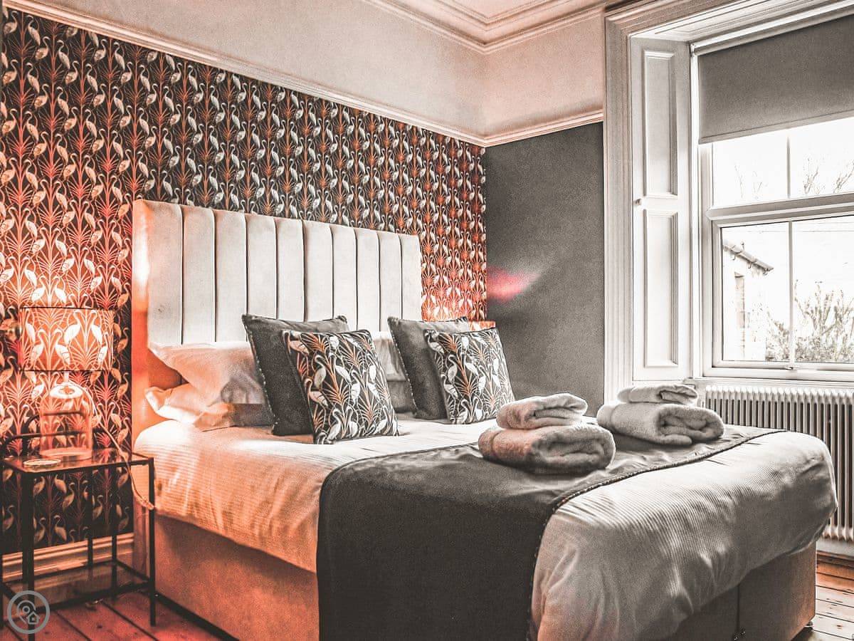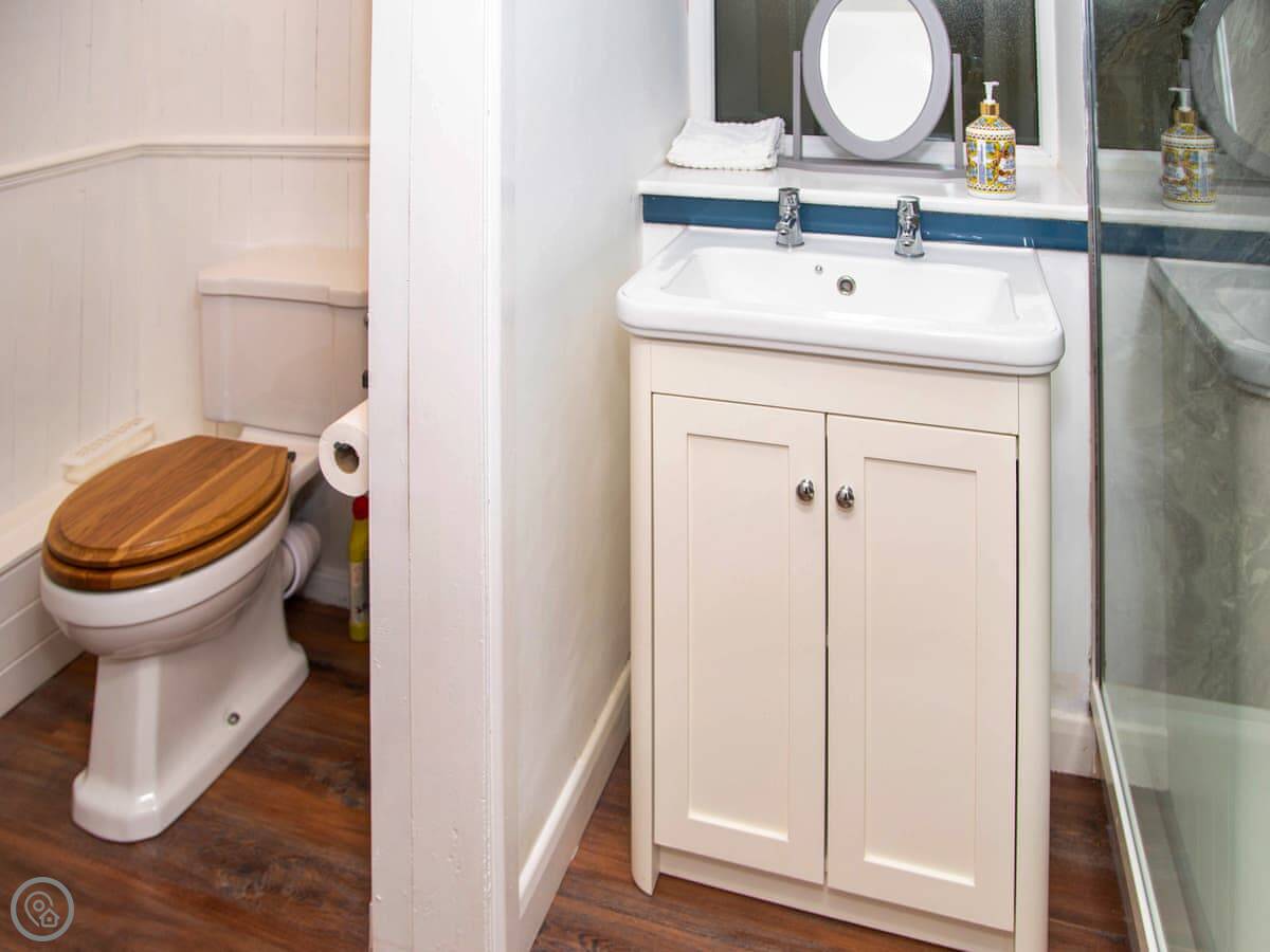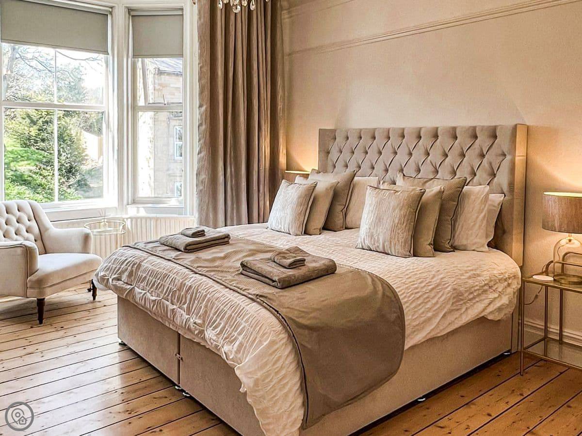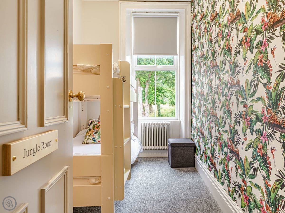 The bedrooms are all a good size. One super king, two kings, a double, and a room with bunk beds. The main bathroom has a roll-top bath and a separate shower. Towels and bedding are provided.