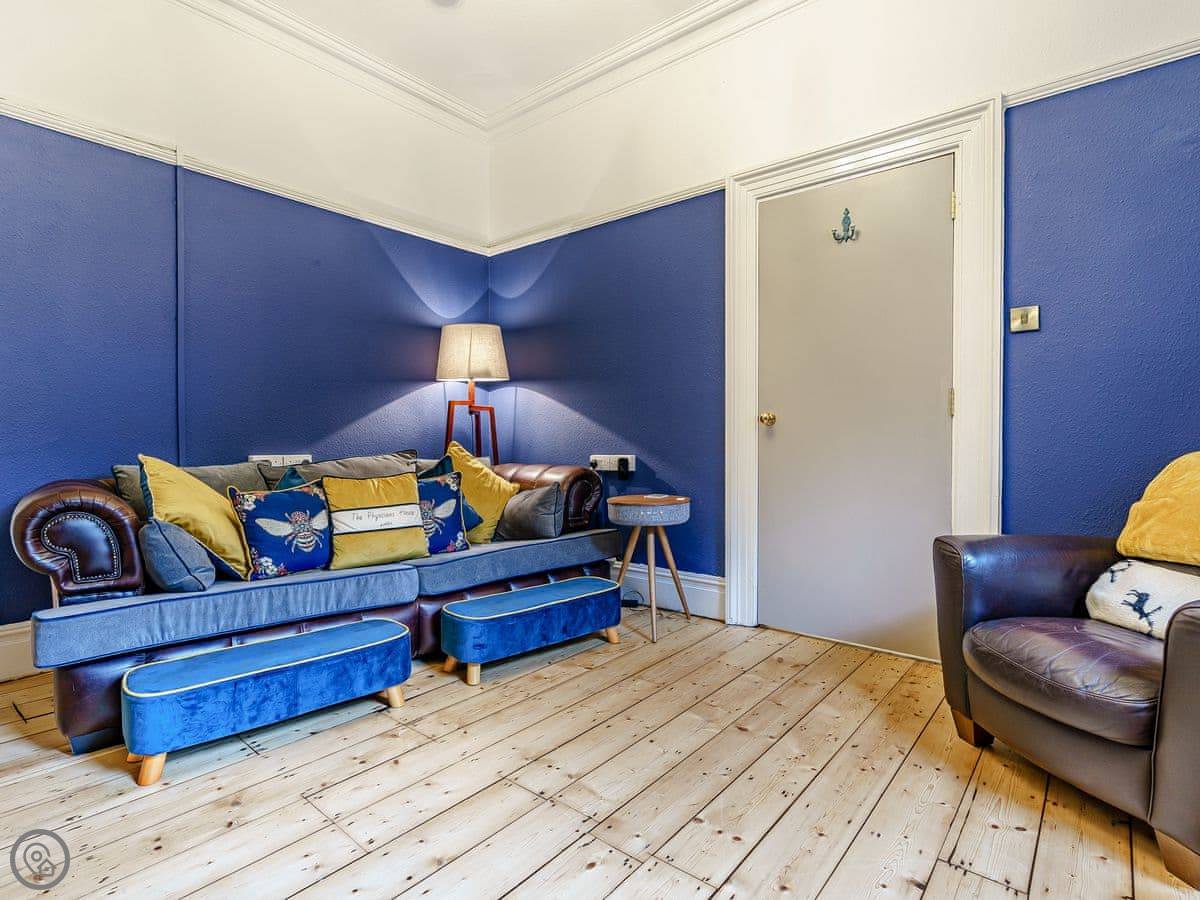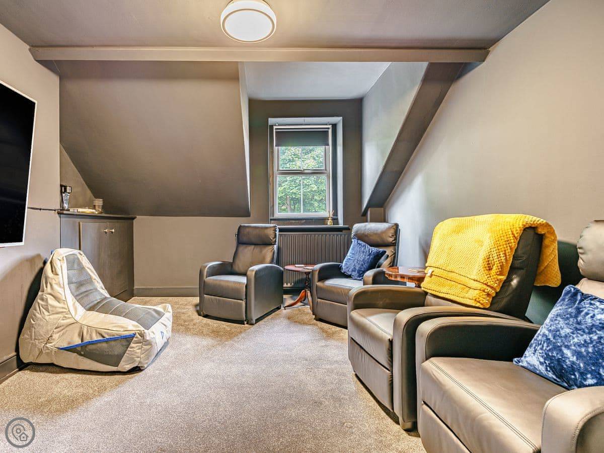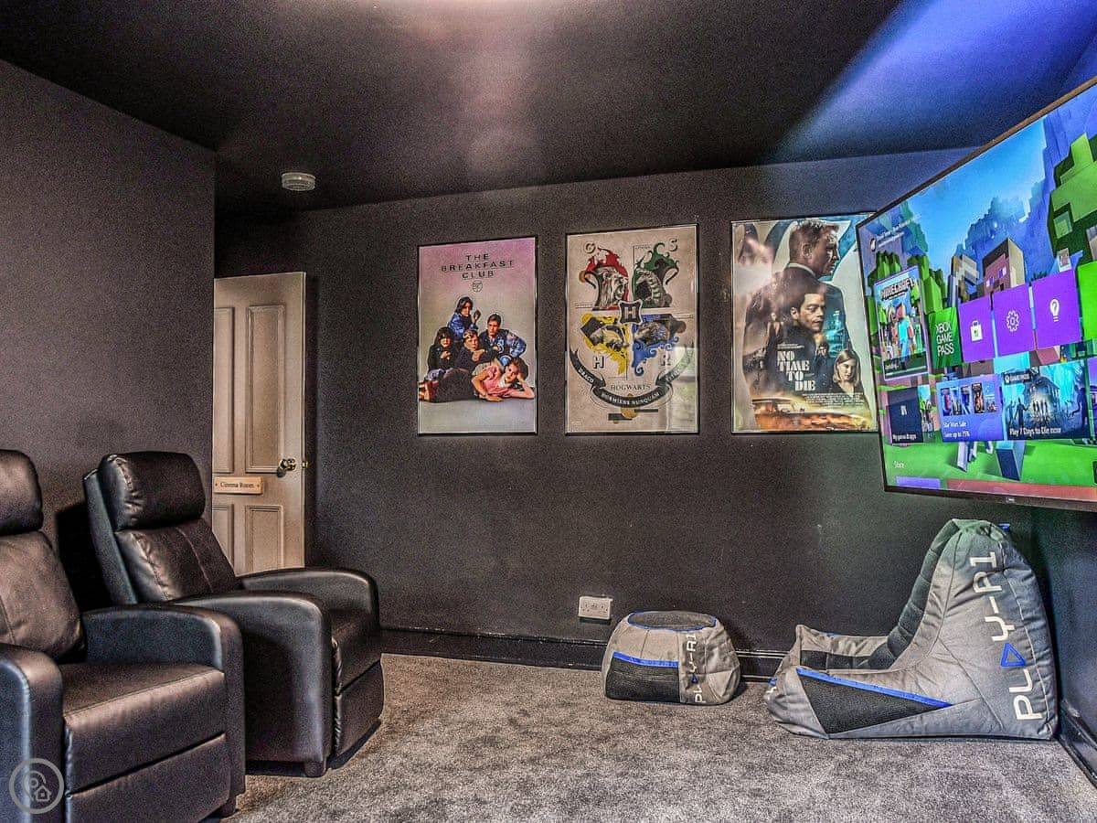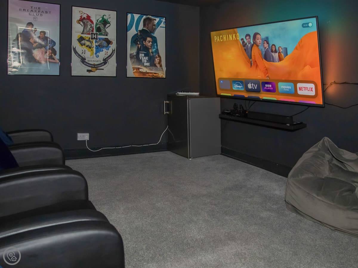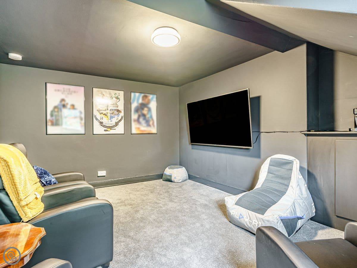 Inside, it's a mix of old furniture and new stuff. The kitchen is big enough for cooking for a crowd. There's a formal dining room with a large table. The main living room is cosy, with a TV. Downstairs in the lower ground floor there's a vaulted bar area with old stone walls. On the top floor there's a cinema room with sofas and an Xbox.