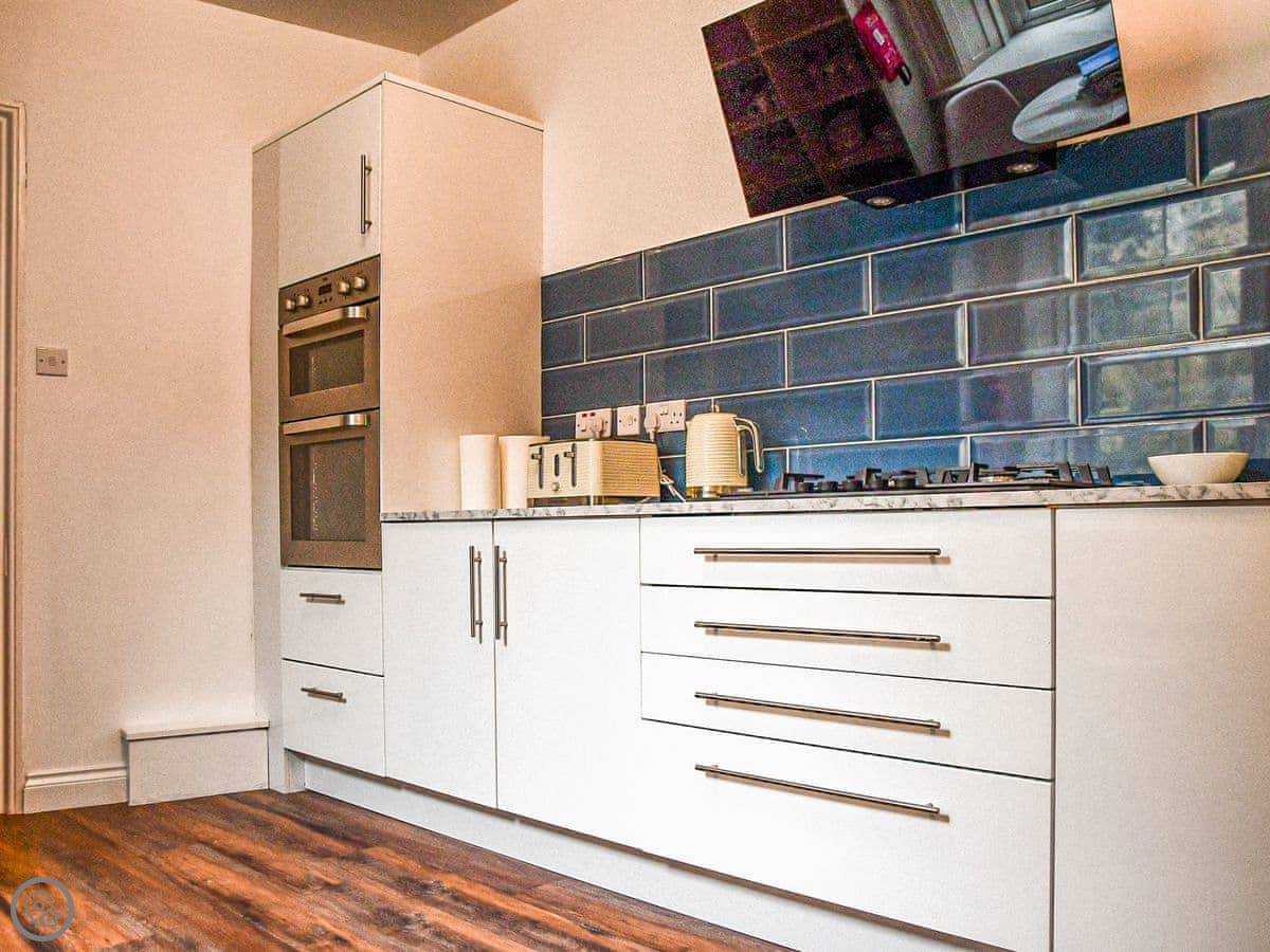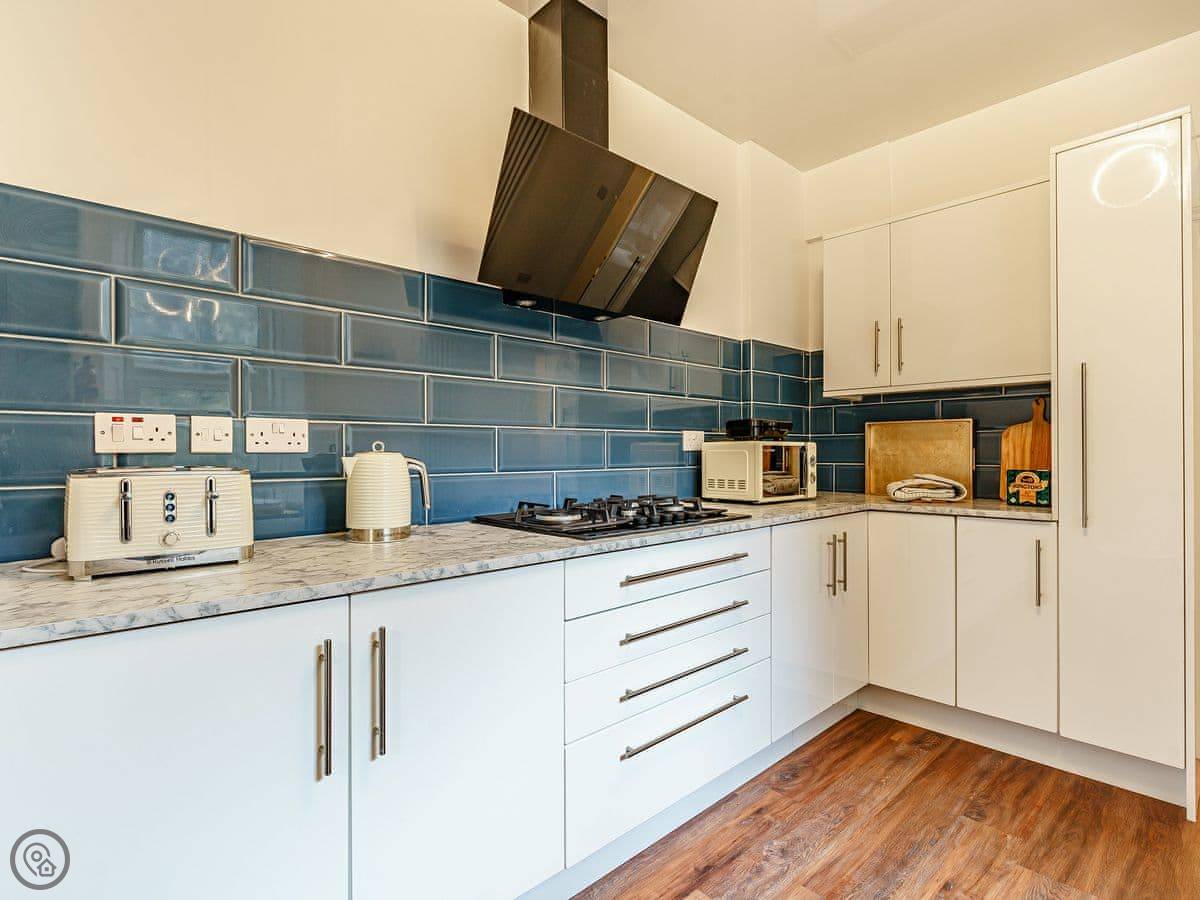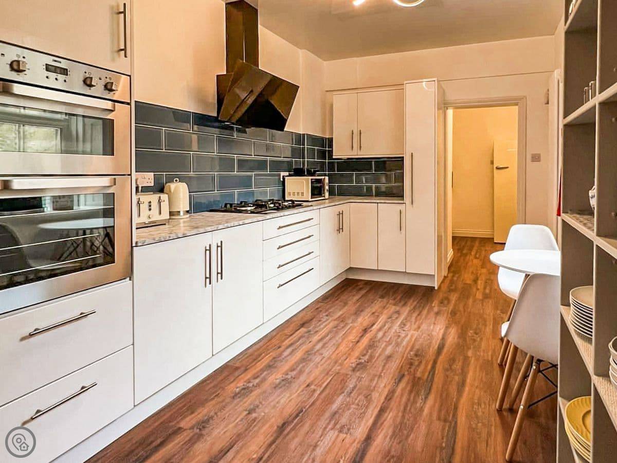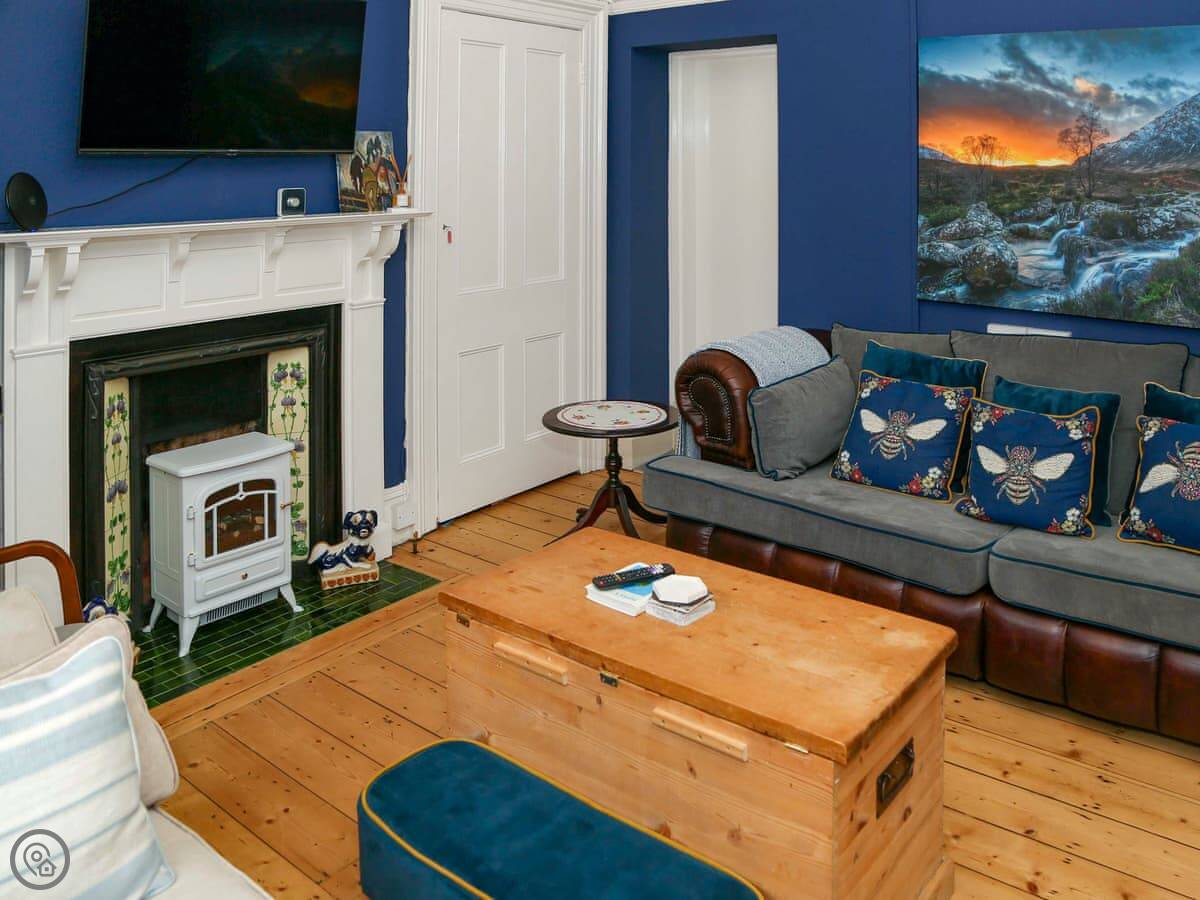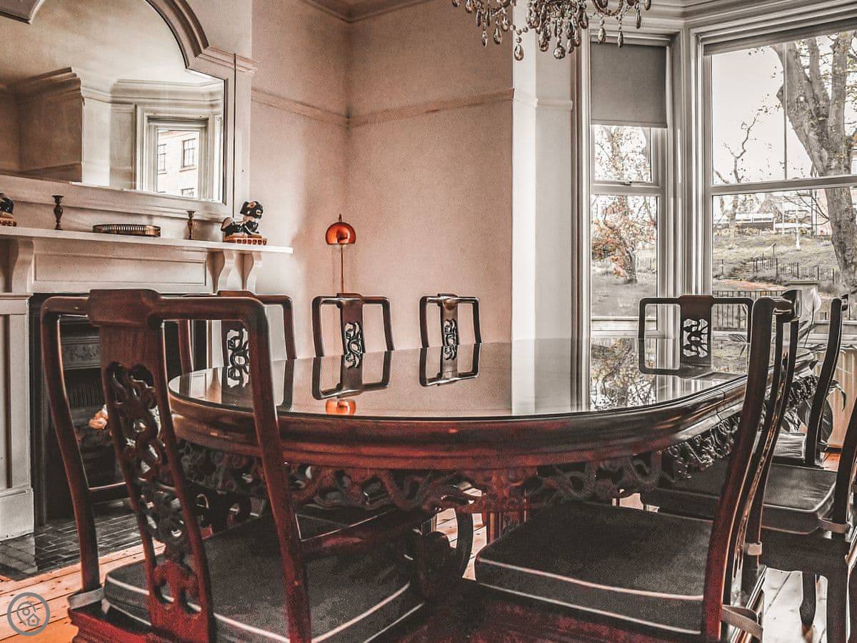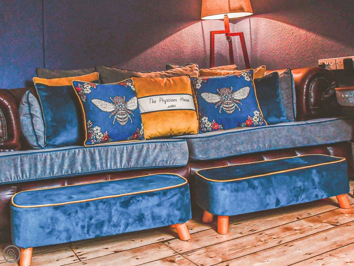 Inside, it's a mix of old furniture and new stuff. The kitchen is big enough for cooking for a crowd. There's a formal dining room with a large table. The main living room is cosy, with a TV. Downstairs in the lower ground floor there's a vaulted bar area with old stone walls. On the top floor there's a cinema room with sofas and an Xbox.