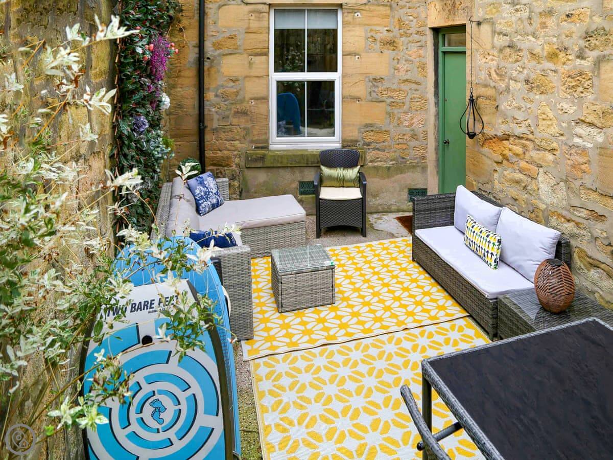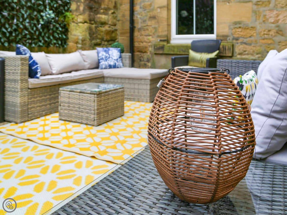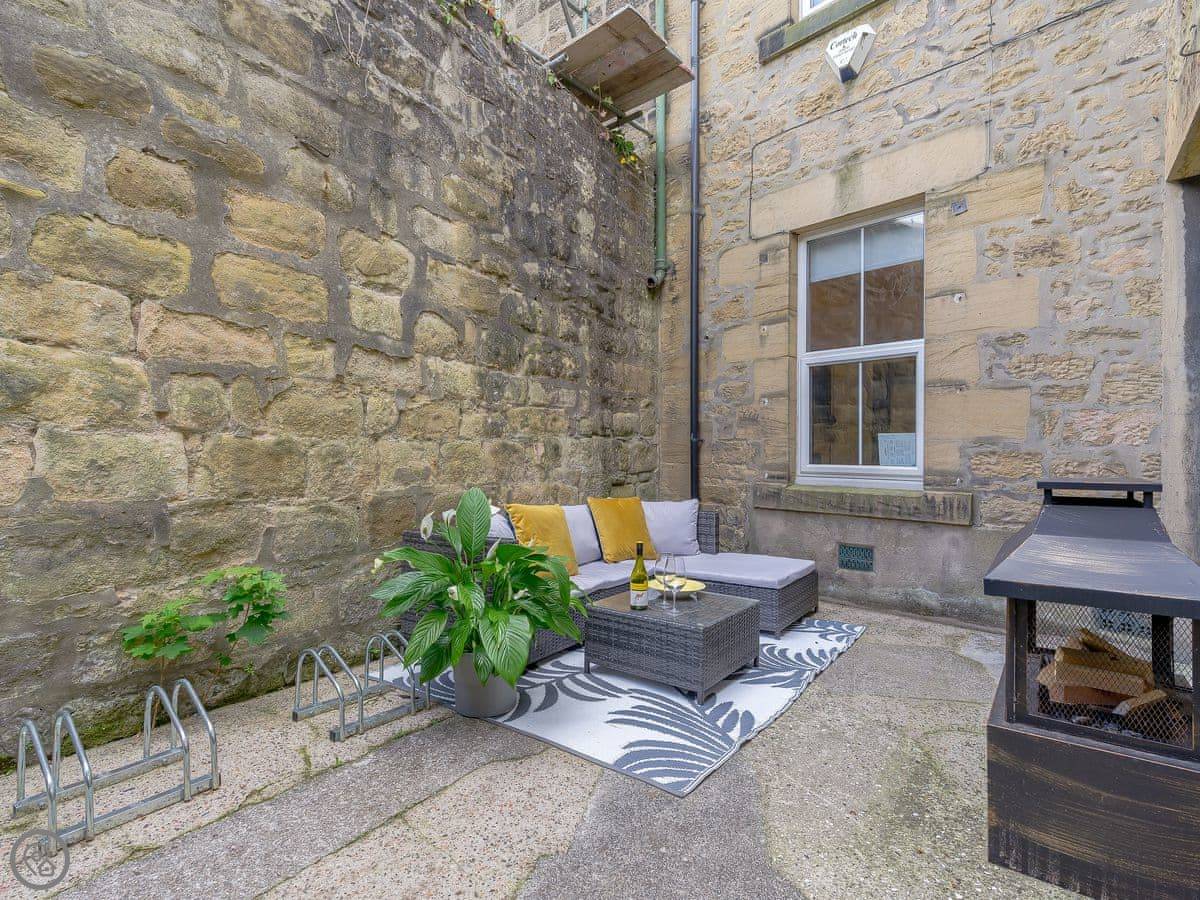 Outside there's a small courtyard with a table and a chimenea.