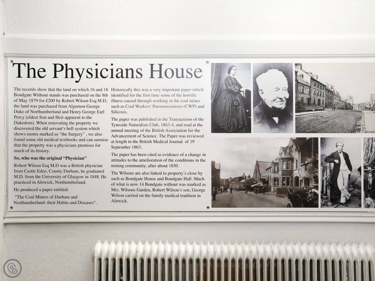 The Physicians House is on Narrowgate in Alnwick. It's Georgian, part of the old Duke of Northumberland's estate before a doctor owned it. It's right in the middle of town, two minutes' walk from the market square.