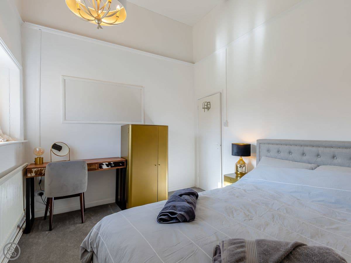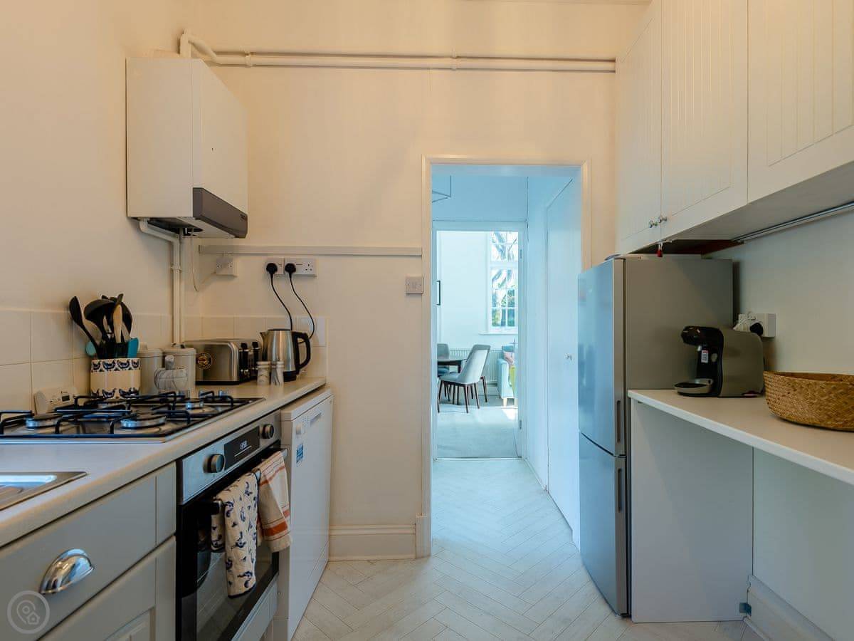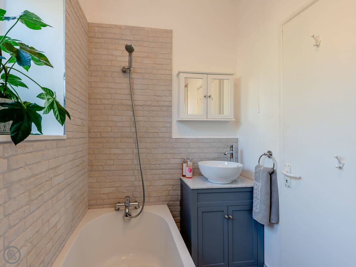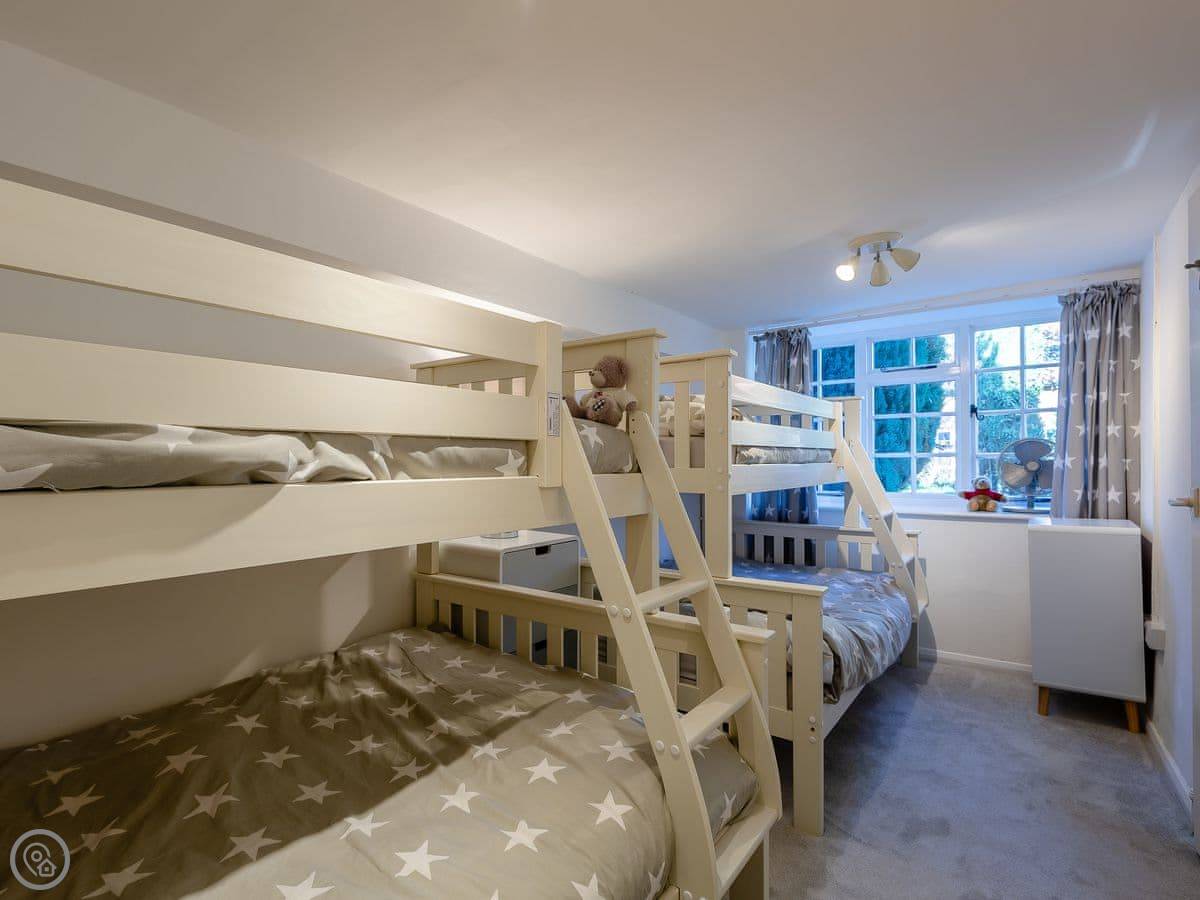 It sleeps four people. There are three bedrooms and one bathroom. It has a 4 Star rating, which means it's well-equipped and comfortable. The ceilings are high, which gives it a light feel, and there’s an open fireplace.