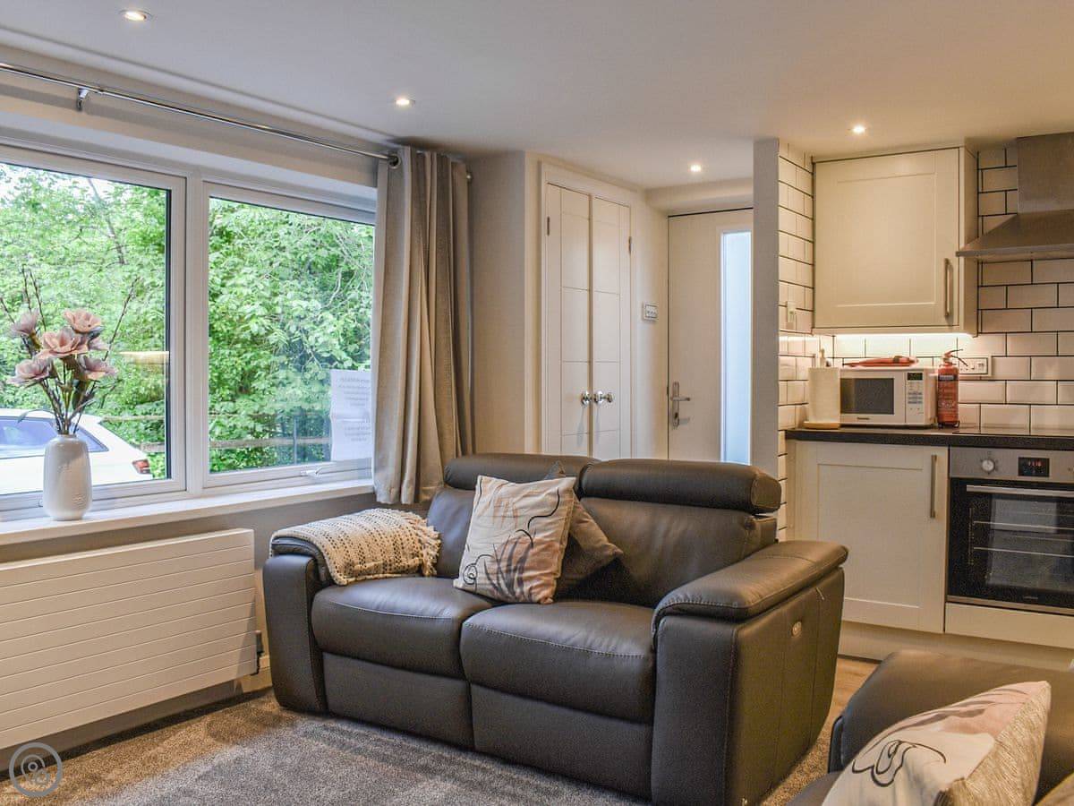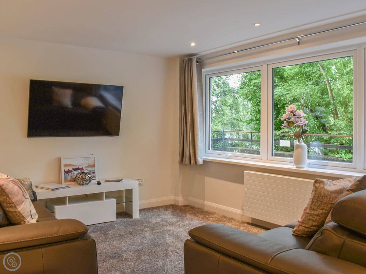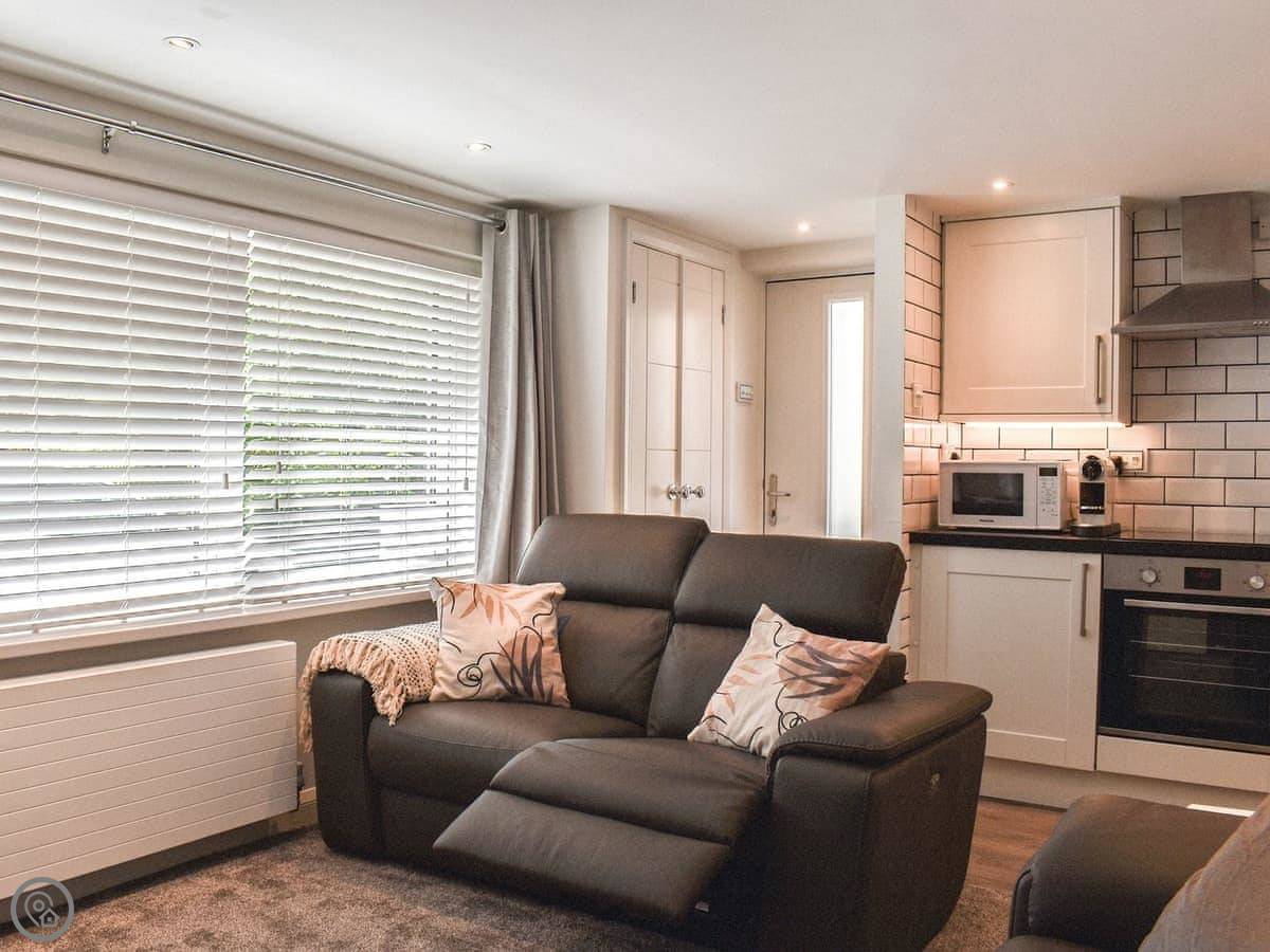 It's an easy walk into the centre of Bowness, five minutes maybe. You can leave the car in the allocated space at the back. Inside, it's open plan. The kitchen's white gloss. The sofa's leather and one end reclines. There's a big TV on the wall. The shower is a walk-in rainfall type.