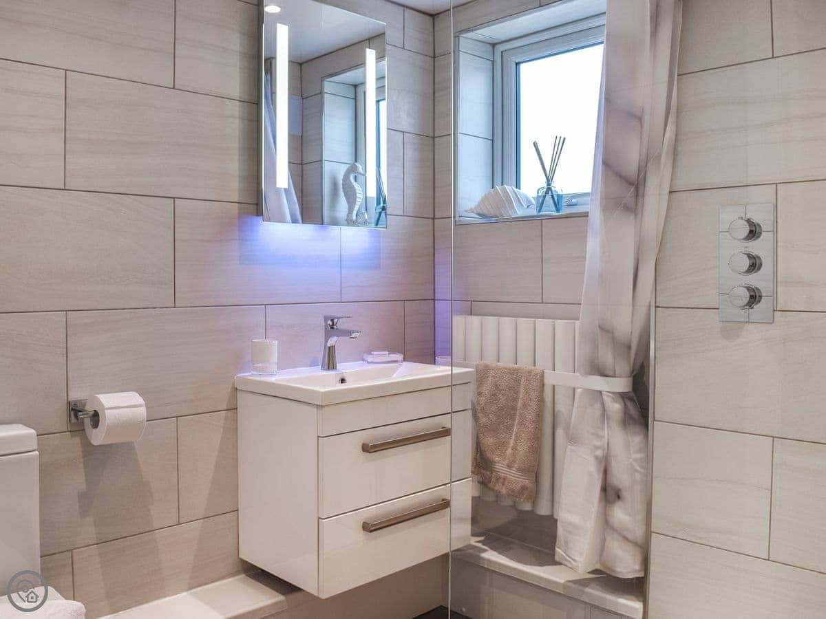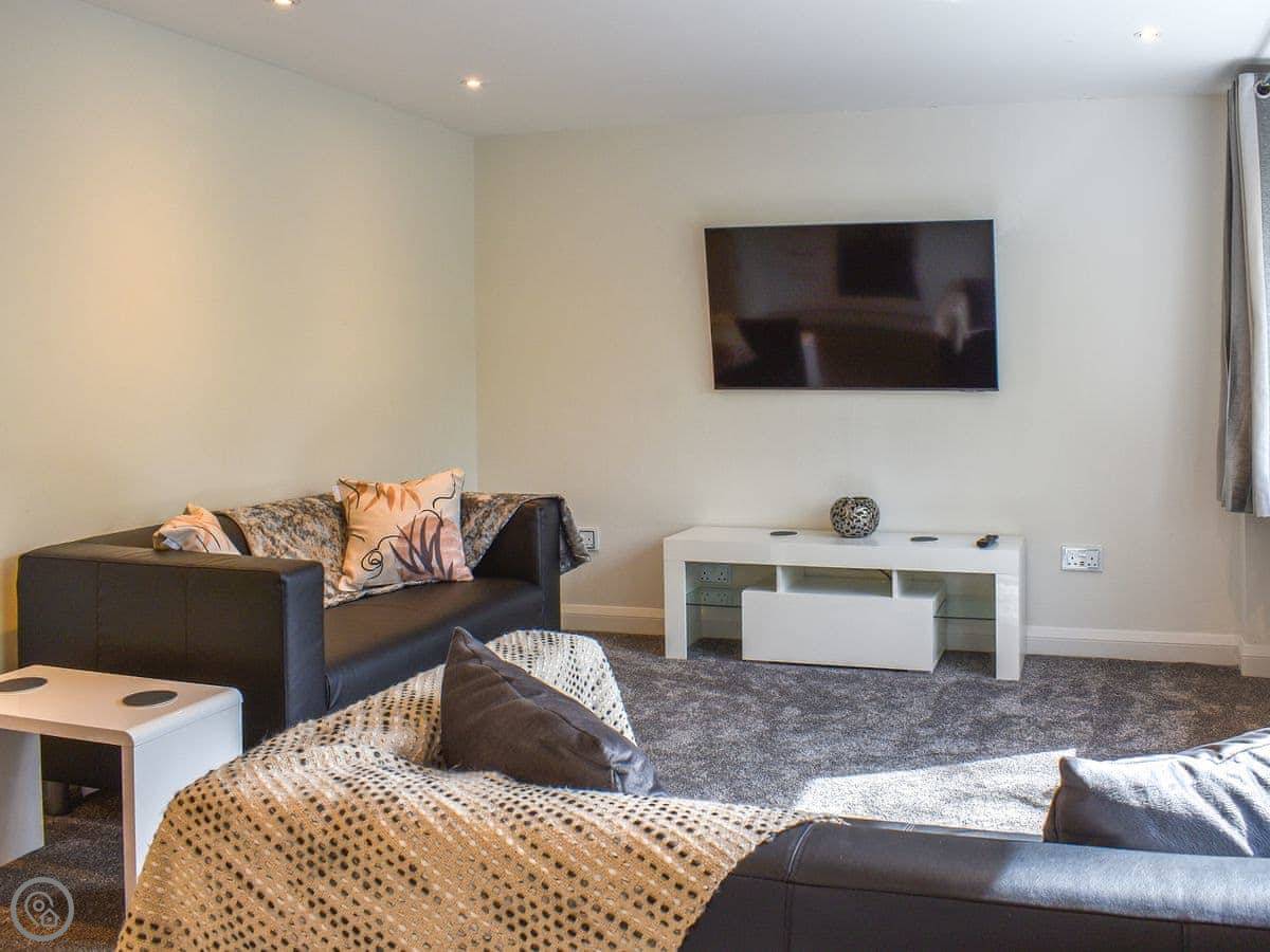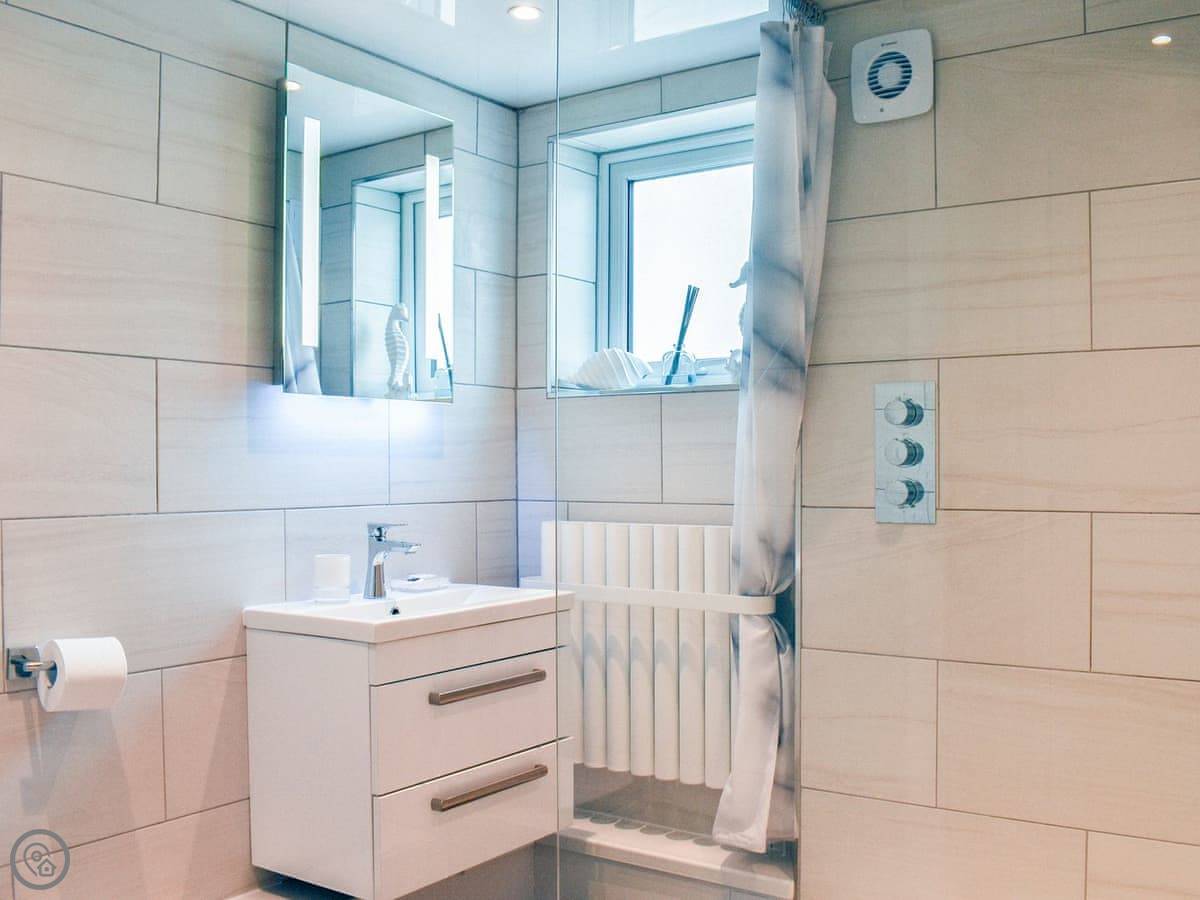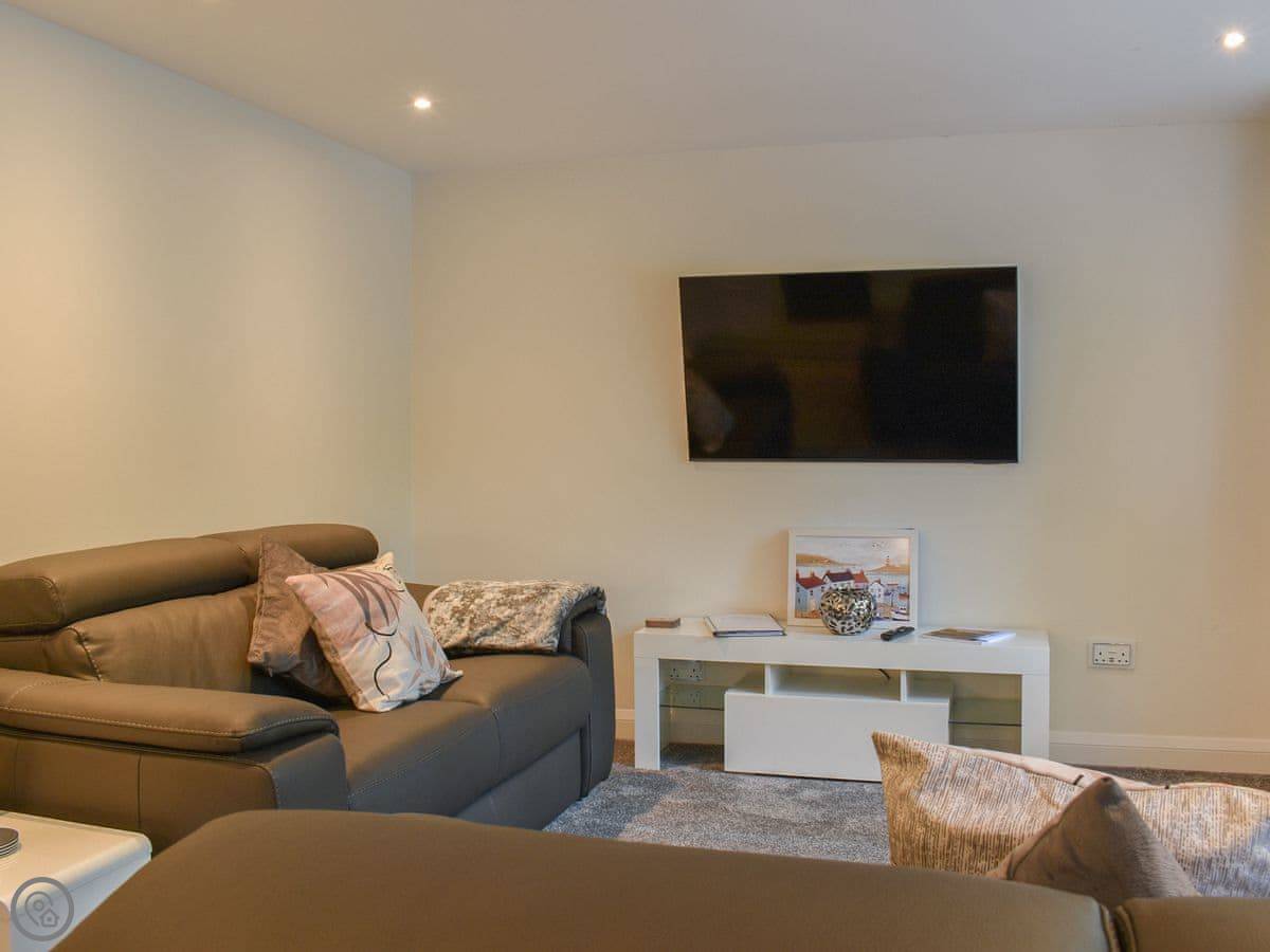 It's an easy walk into the centre of Bowness, five minutes maybe. You can leave the car in the allocated space at the back. Inside, it's open plan. The kitchen's white gloss. The sofa's leather and one end reclines. There's a big TV on the wall. The shower is a walk-in rainfall type.