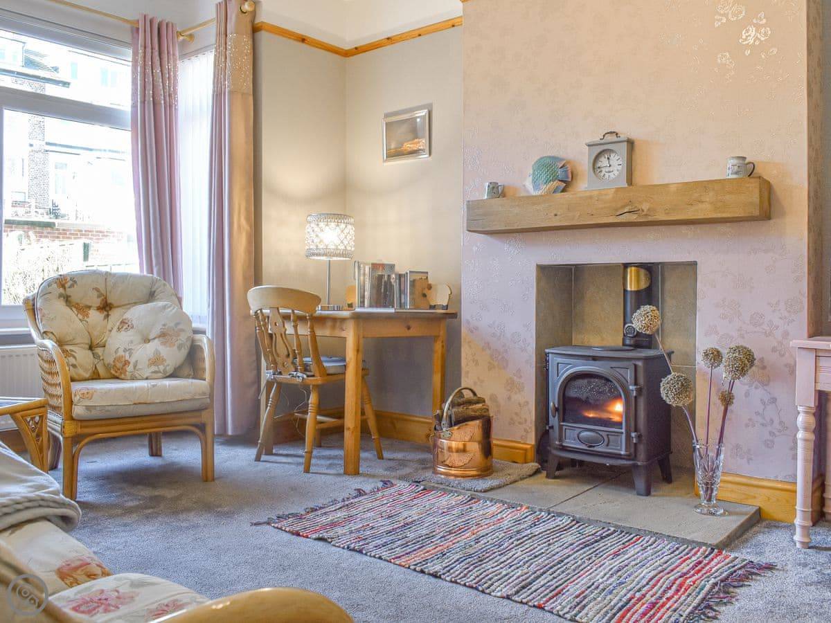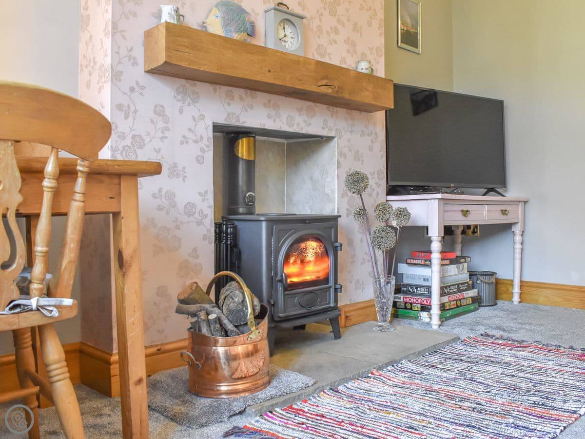 You get a small enclosed lawn at the front with some flowers, and a little yard at the back with a shed. The shed is handy if you've brought bikes or surfboards. The living room has a wood burning stove.