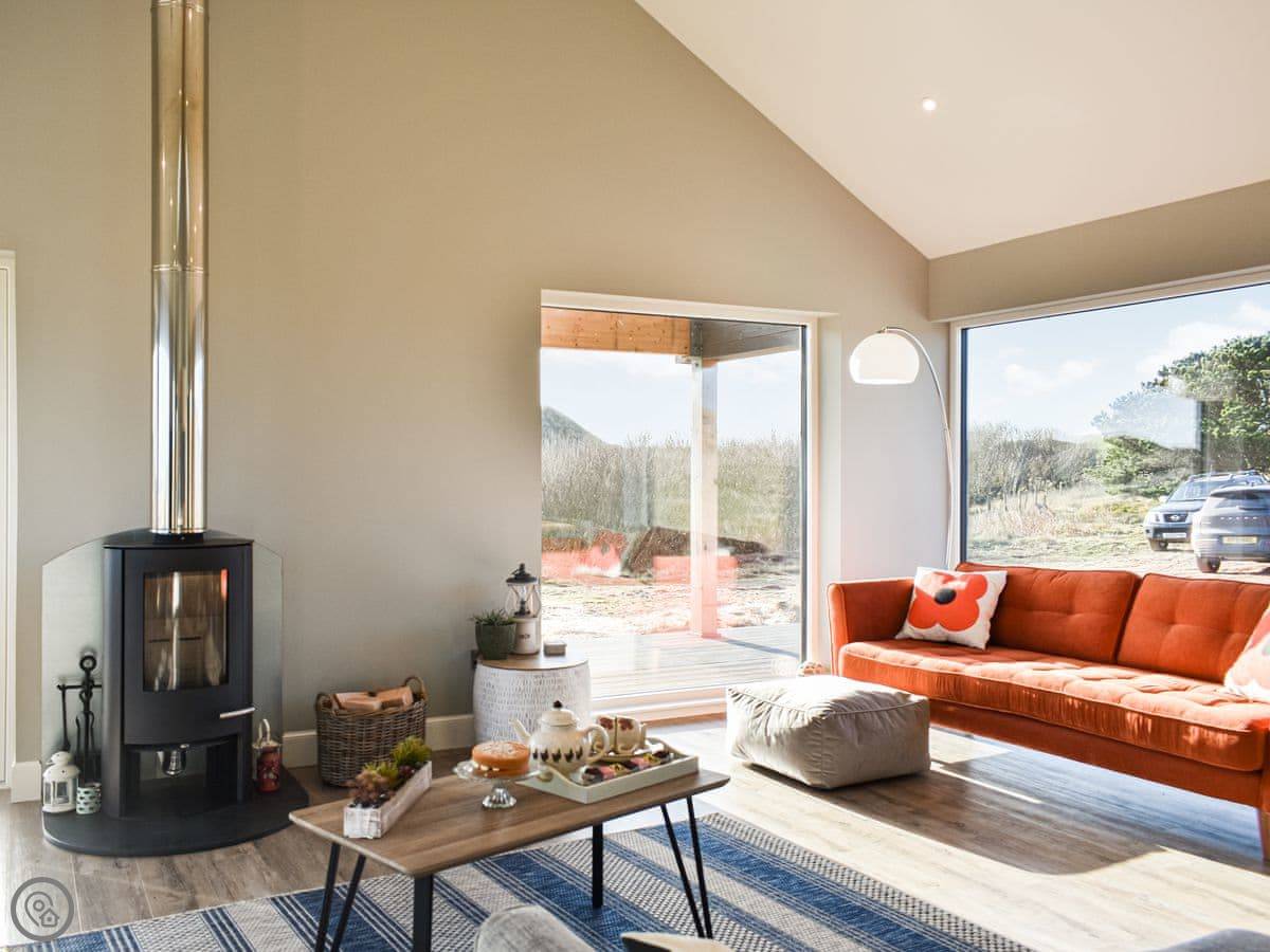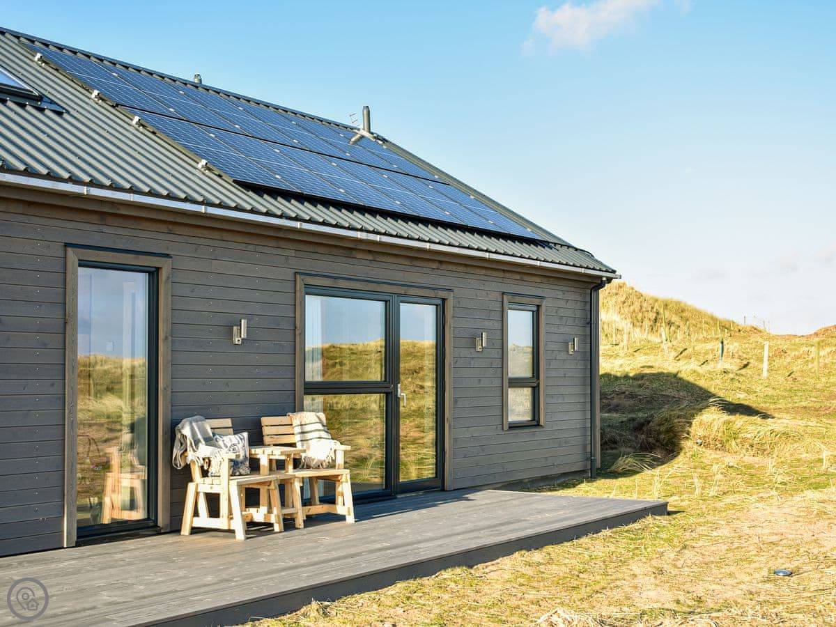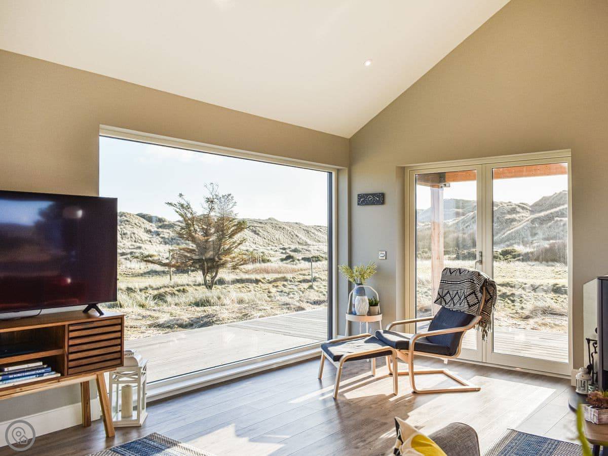 The front is mostly windows, floor to ceiling. You get a good view of the fields and the sea from inside. The garden is enclosed. There's parking right there.