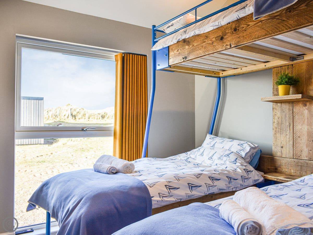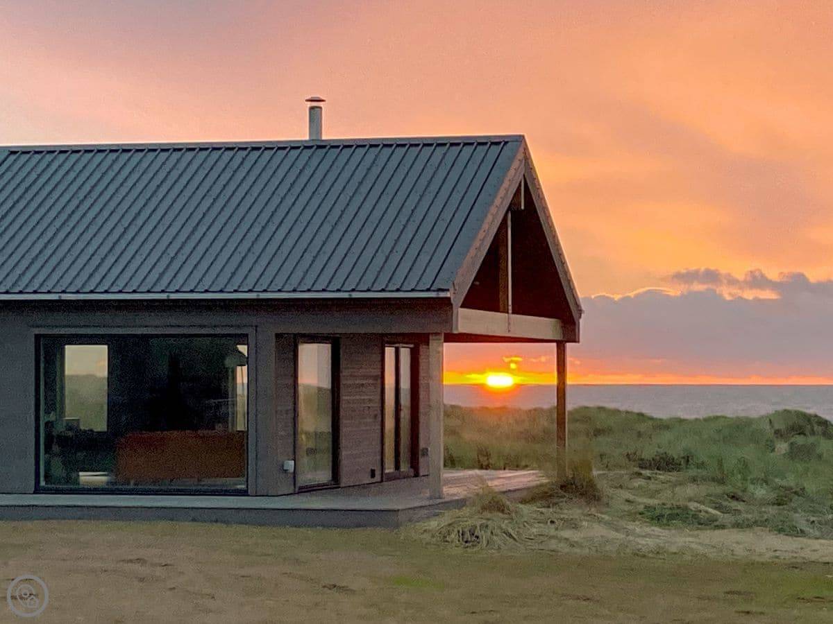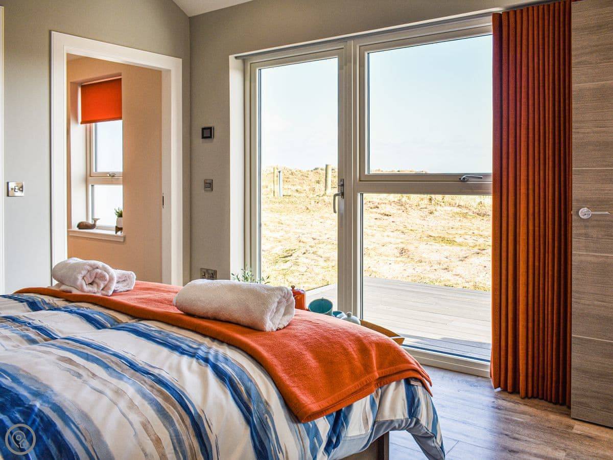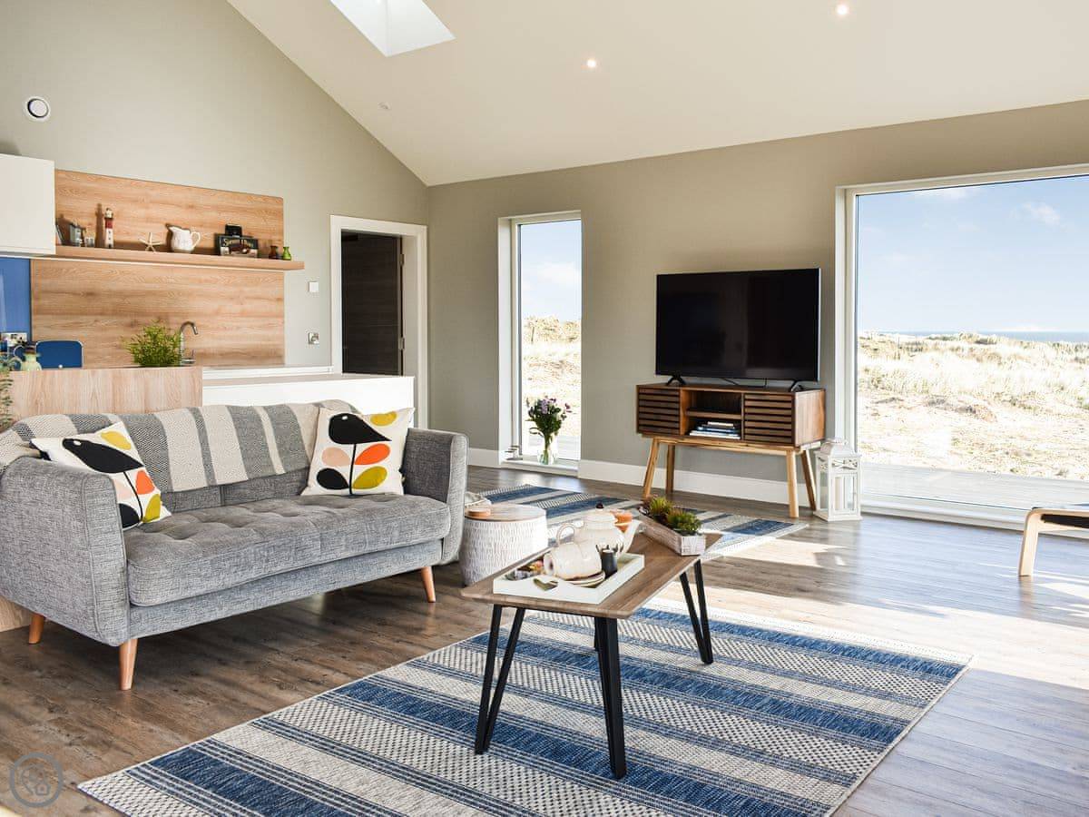 The front is mostly windows, floor to ceiling. You get a good view of the fields and the sea from inside. The garden is enclosed. There's parking right there.