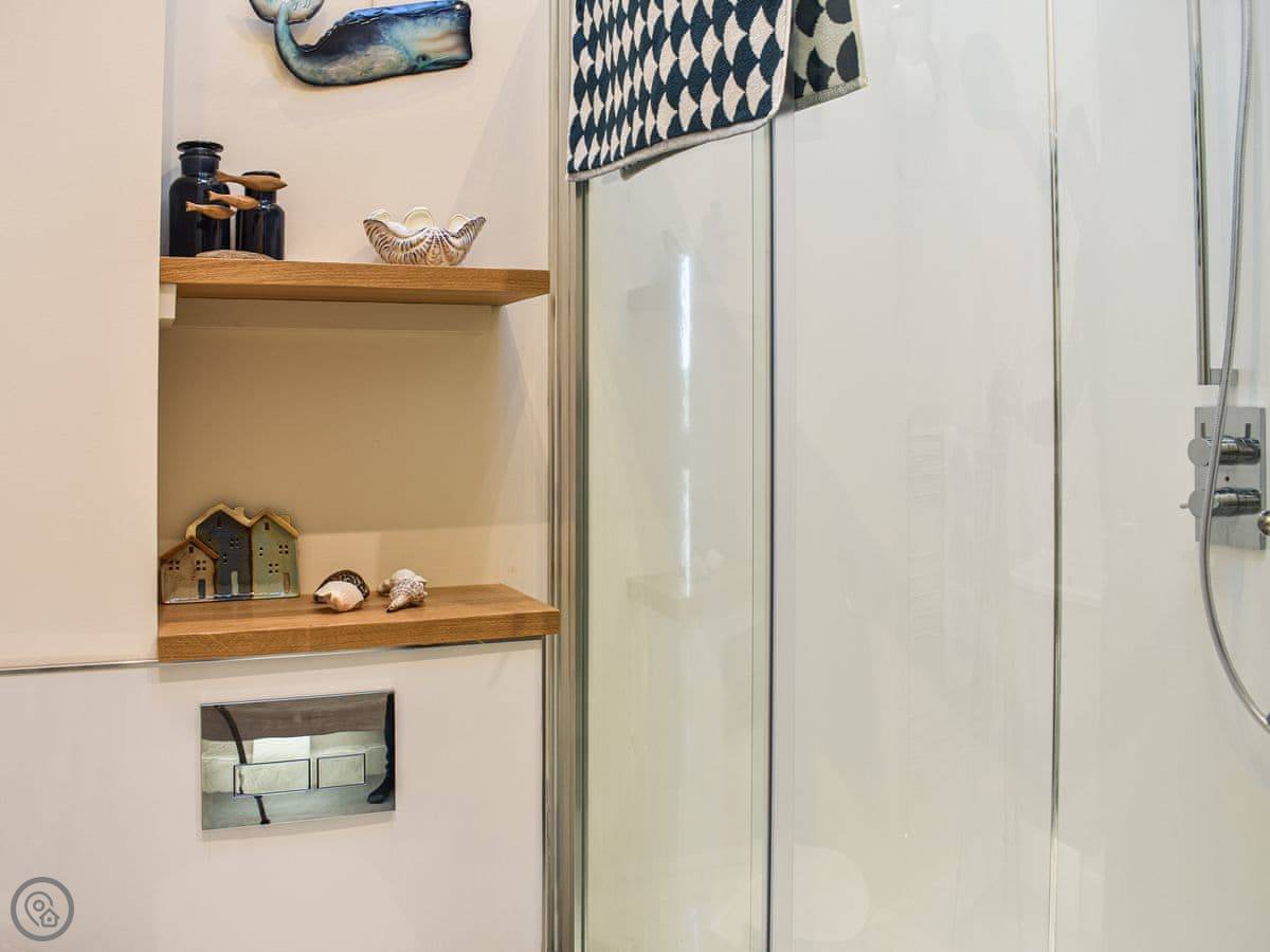 The main thing is it's off-grid. It runs on solar and a generator. Everything works fine, you've got power and hot water, but you notice you're using your own electricity. It makes you think about it. There's a wood burner for heat.