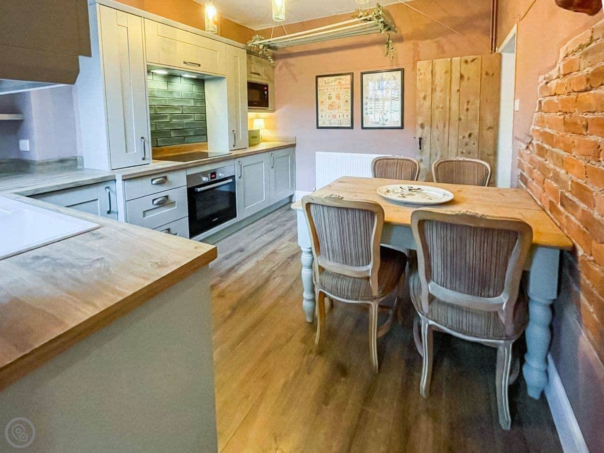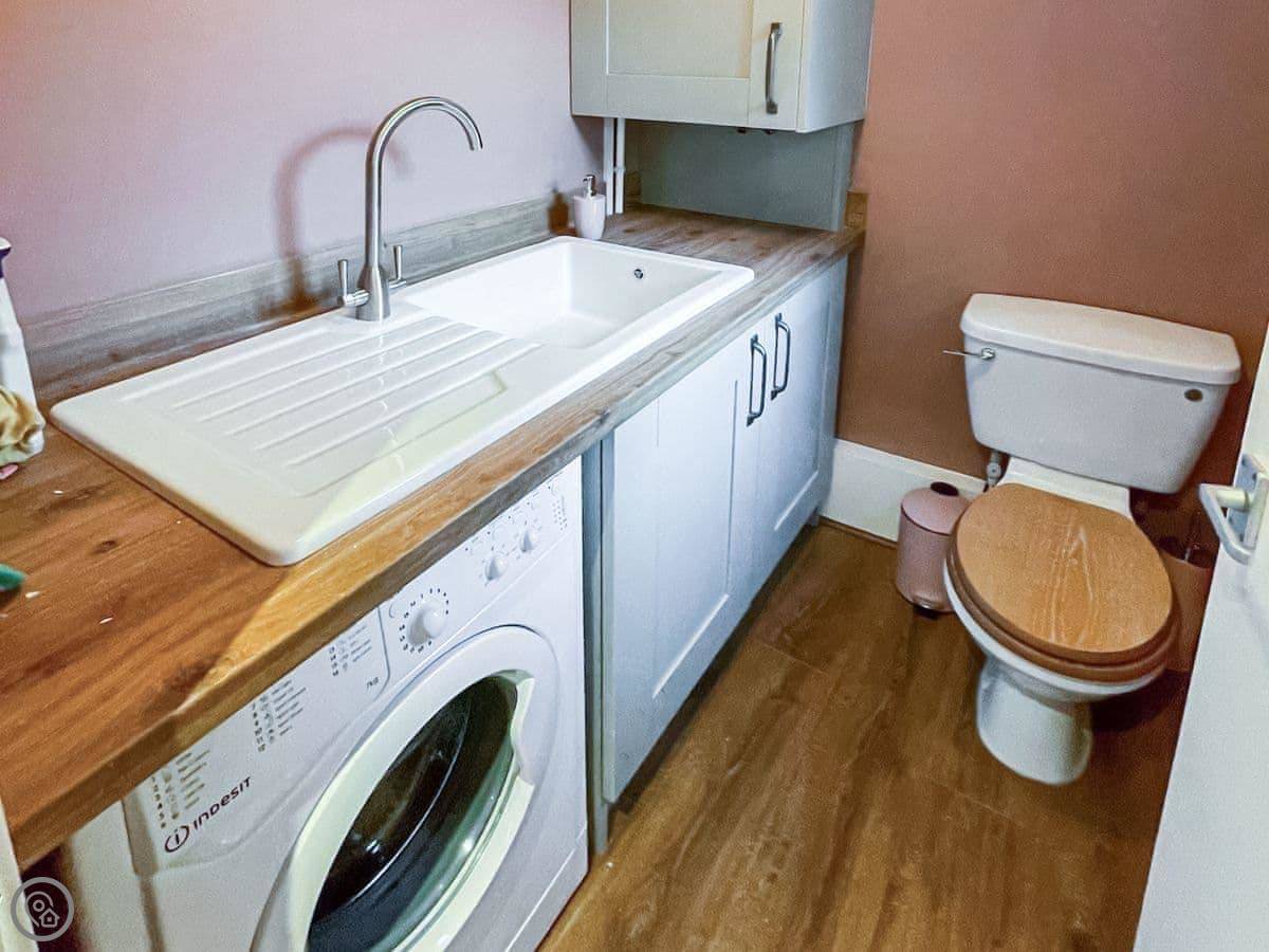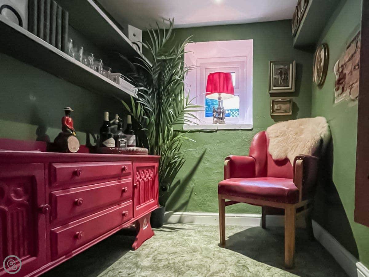 Downstairs, there's a living room with a wood burner. The kitchen diner is at the back. Through there is a utility room with a washing machine, a boot sink, and a toilet. There's also a door from there into the old keeping cellar. We've put a small secret bar in there. It's a bit of fun.