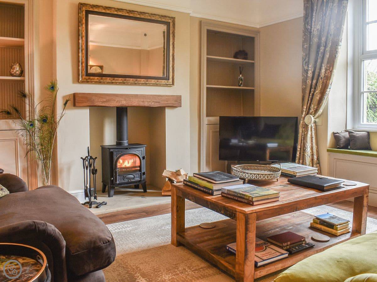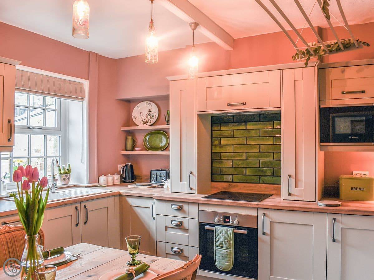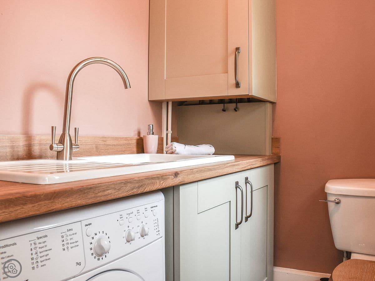 Downstairs, there's a living room with a wood burner. The kitchen diner is at the back. Through there is a utility room with a washing machine, a boot sink, and a toilet. There's also a door from there into the old keeping cellar. We've put a small secret bar in there. It's a bit of fun.