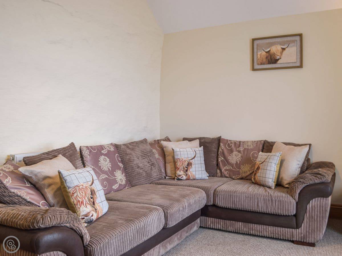 It sleeps six. Three bedrooms and two bathrooms, which helps with the morning queue. It's a 4 Star place, so everything's in good order and it's been looked after. The main room is open-plan, with stone walls and a wood burner. It's a decent size for everyone to sit together. There's a separate sunroom that looks out onto the garden.