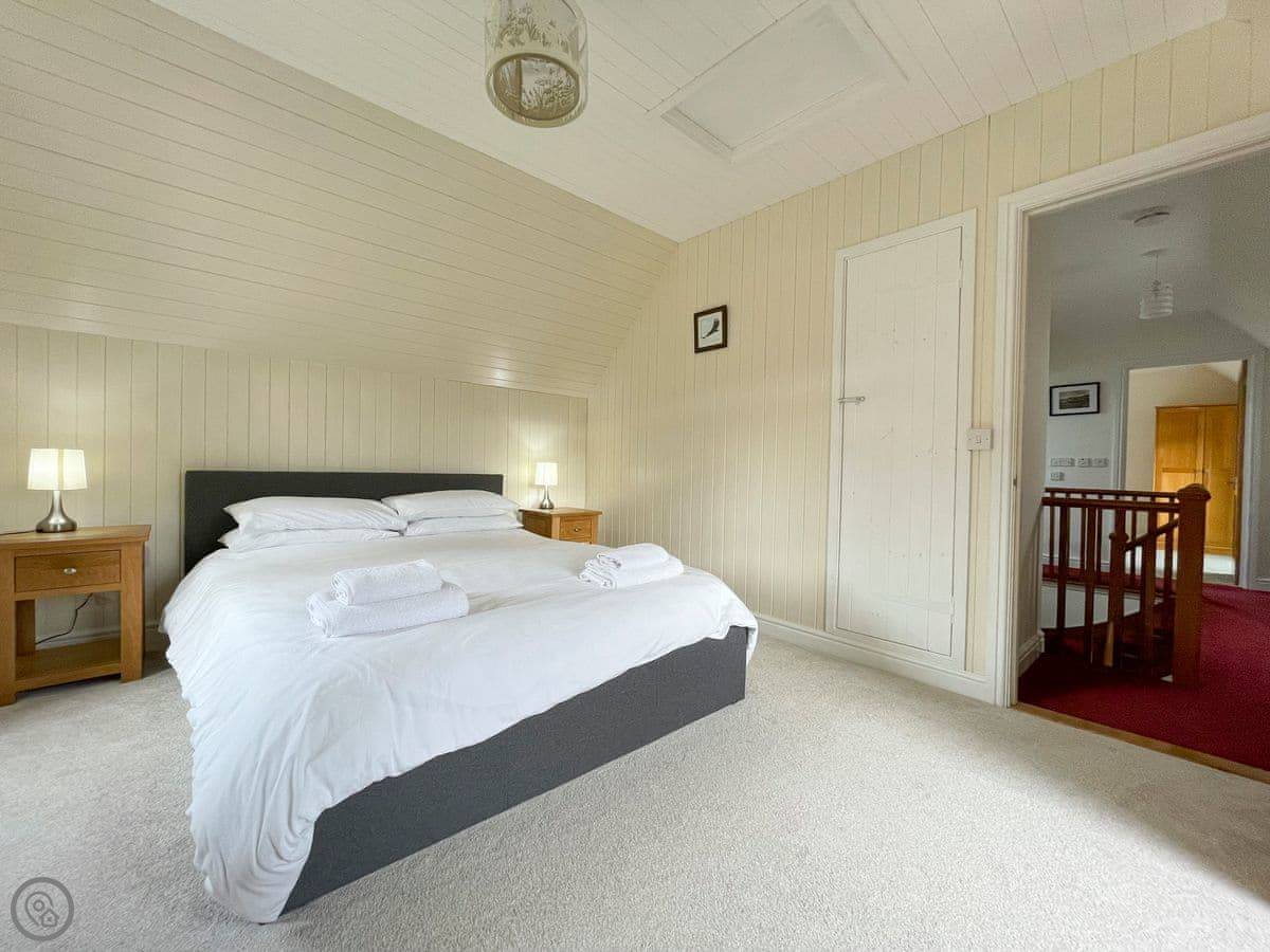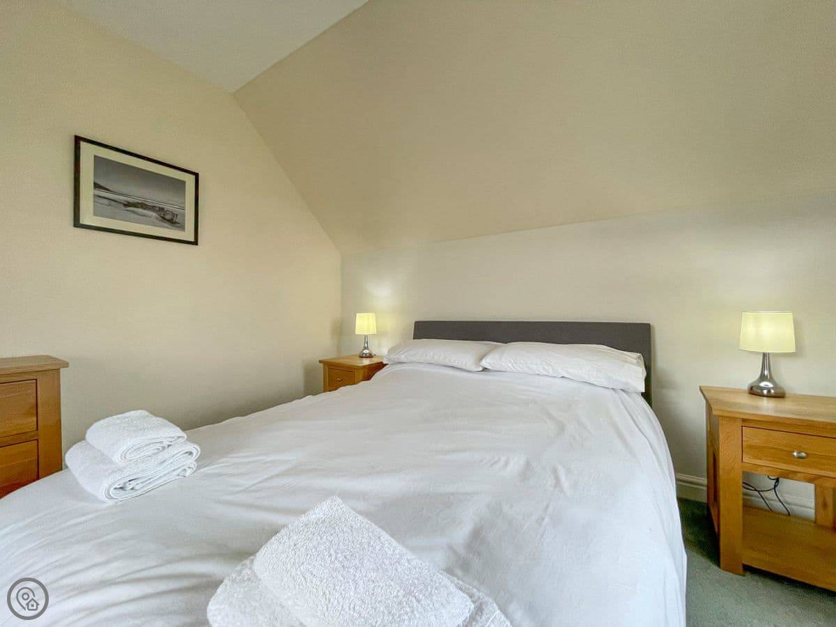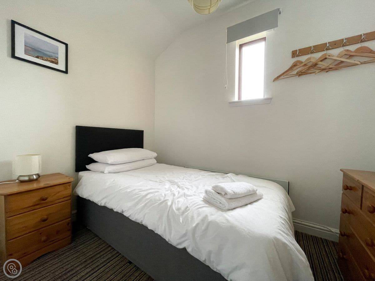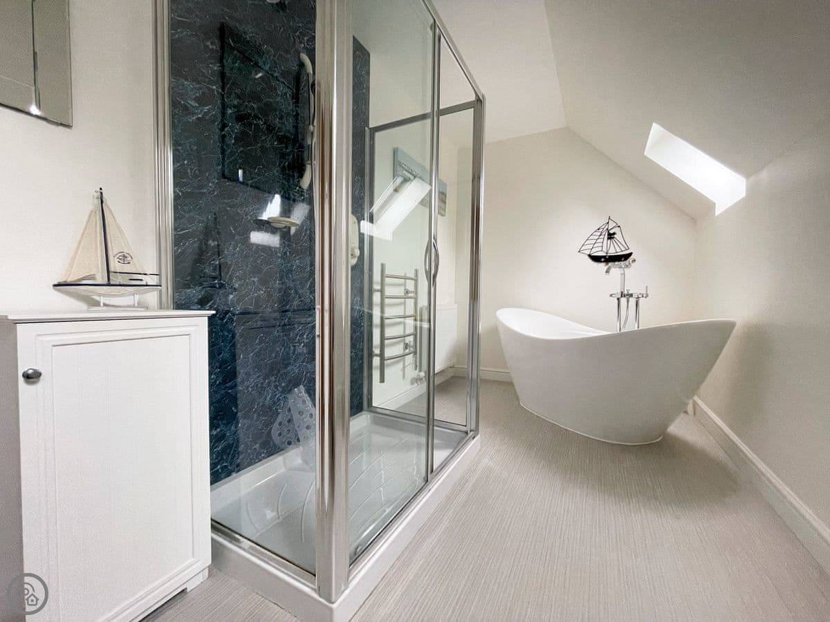 It sleeps five. Three bedrooms and one bathroom. The rating is 4 Star. It's a proper, spacious house. There's one single bedroom downstairs near the back door, and two bedrooms upstairs, one king size and one double. The double room has a great view down to the beach. The bathroom is upstairs too, with both a shower and a free-standing bath.
