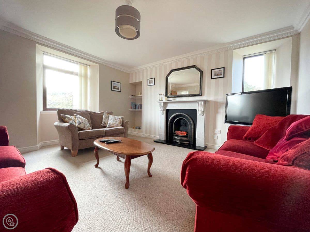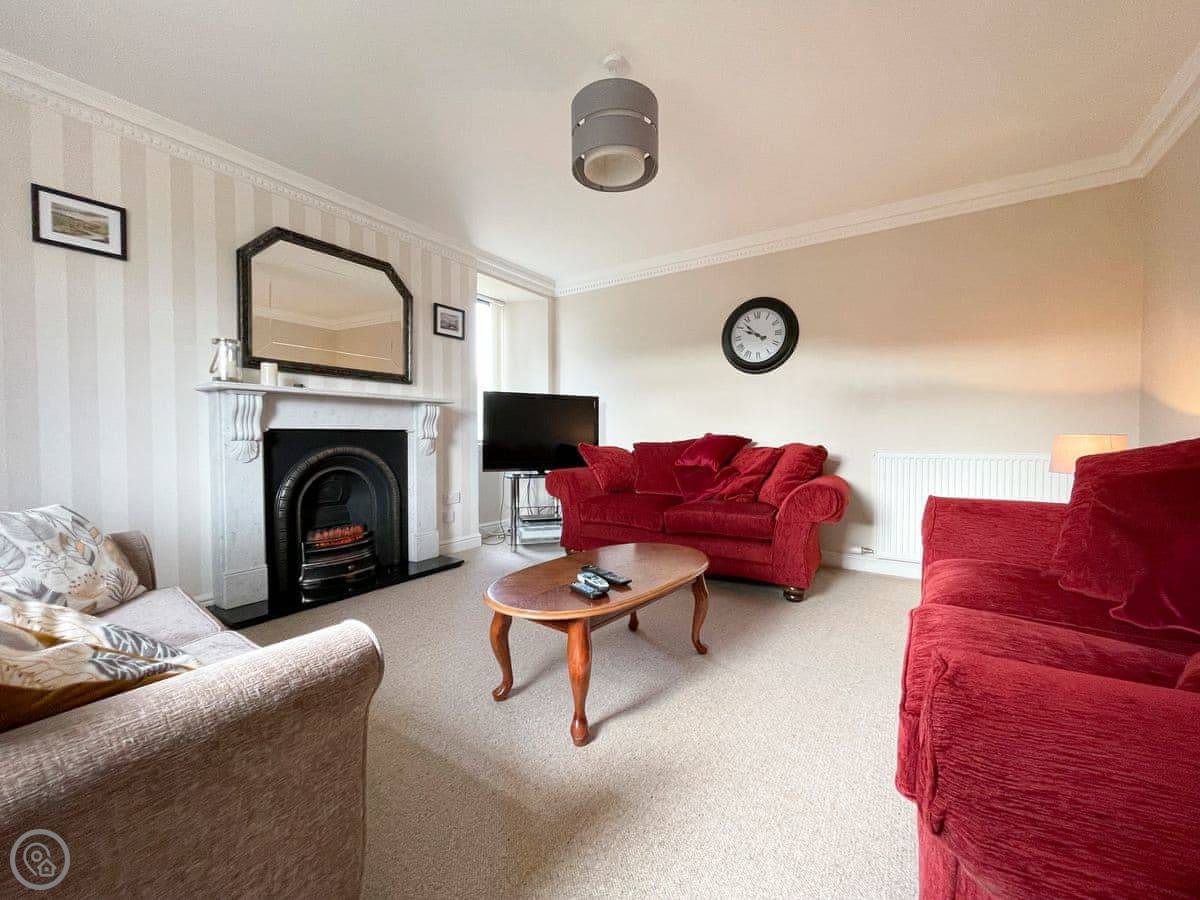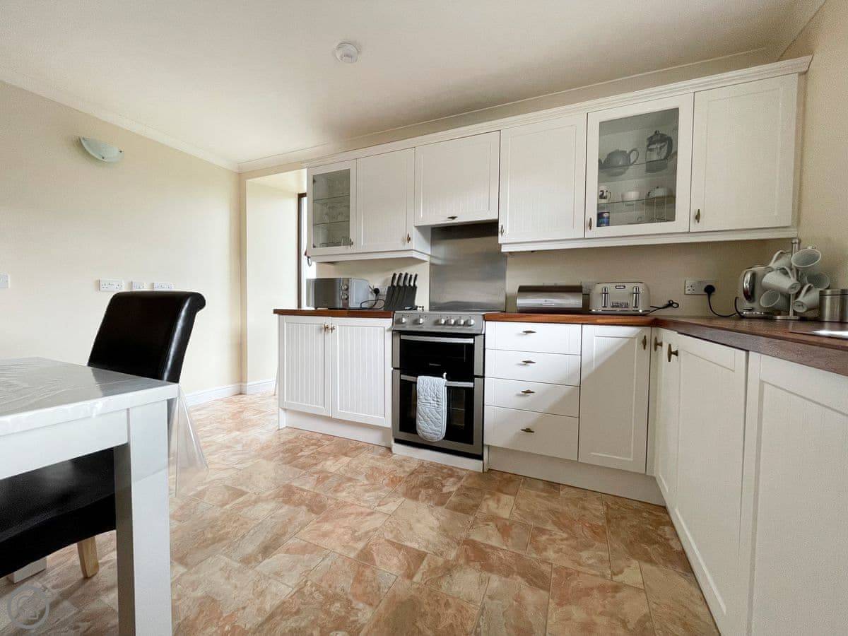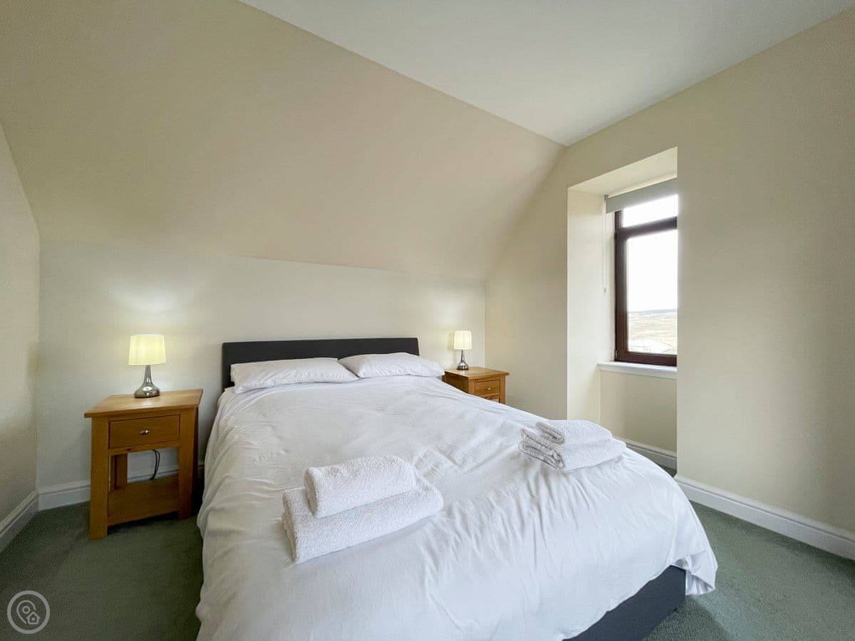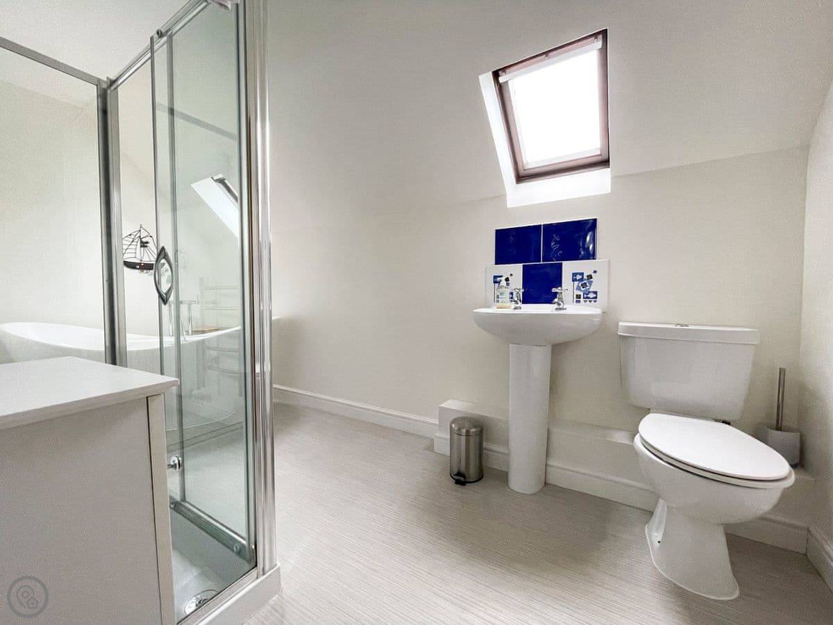 It sleeps five. Three bedrooms and one bathroom. The rating is 4 Star. It's a proper, spacious house. There's one single bedroom downstairs near the back door, and two bedrooms upstairs, one king size and one double. The double room has a great view down to the beach. The bathroom is upstairs too, with both a shower and a free-standing bath.
