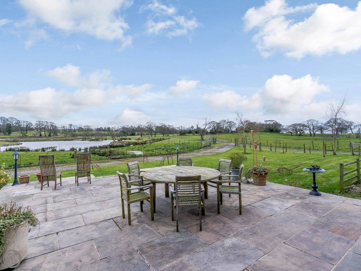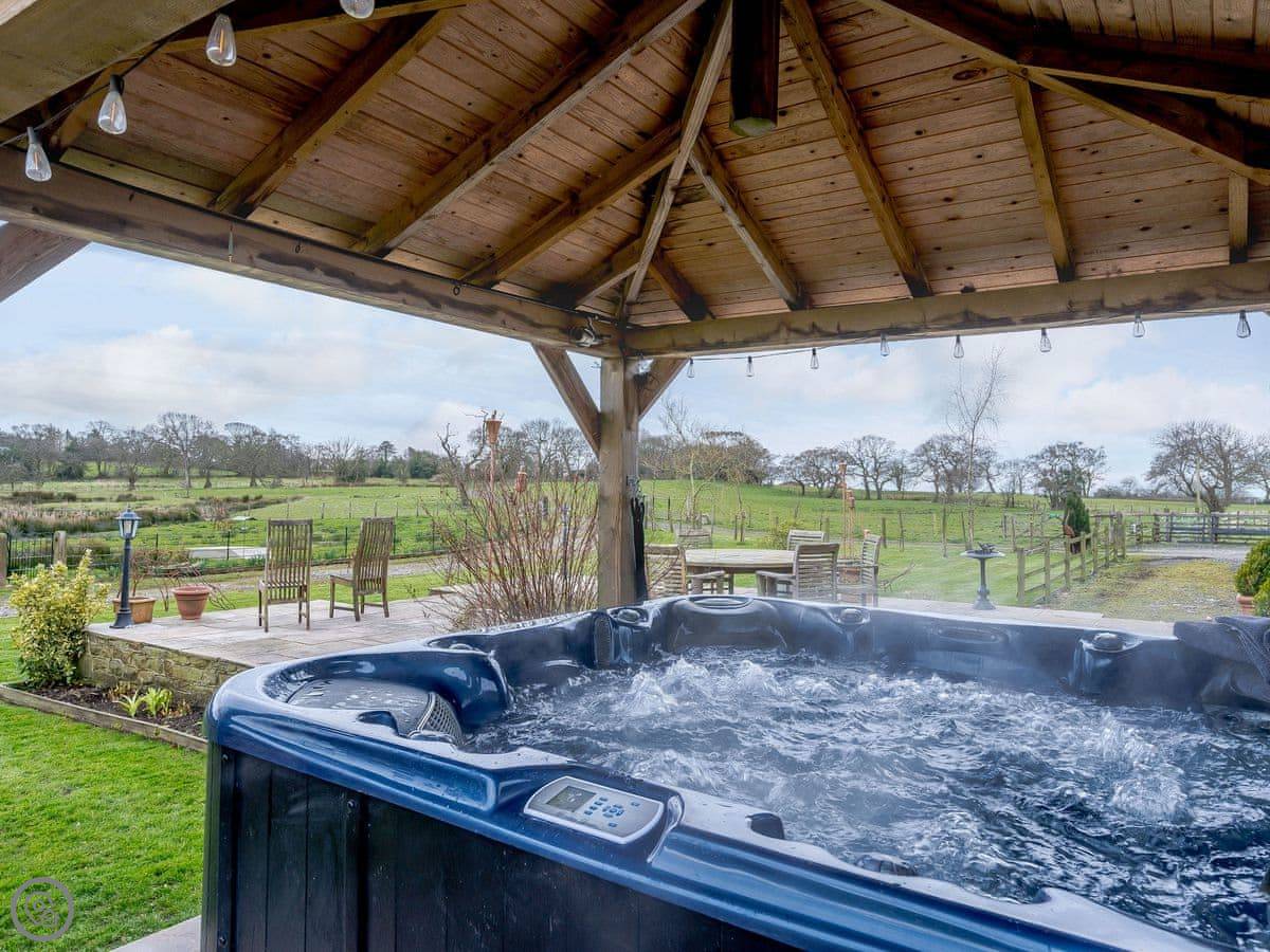 Outside, there's a patio with a table and chairs. The view looks out over a lake and fields. The hot tub is under a gazebo, so you can use it in the rain. It's a nice spot.
