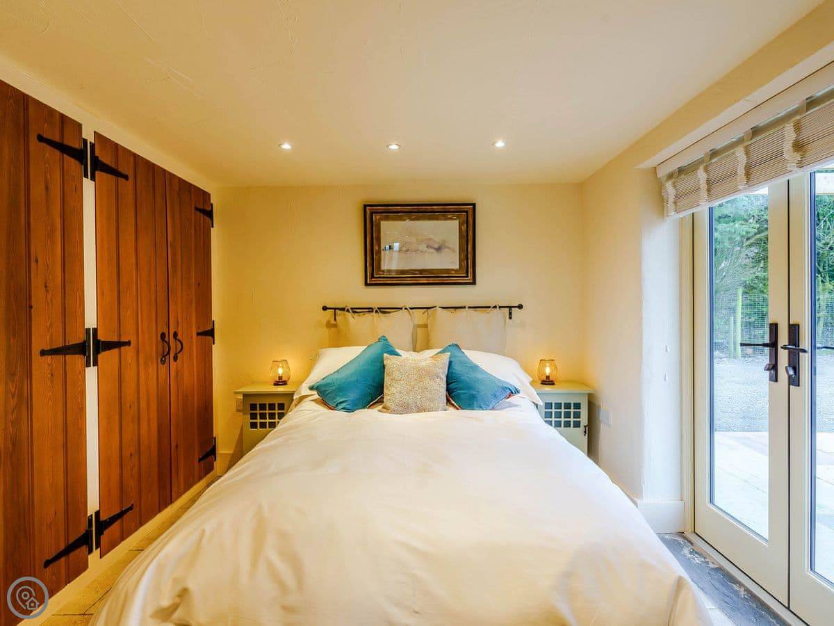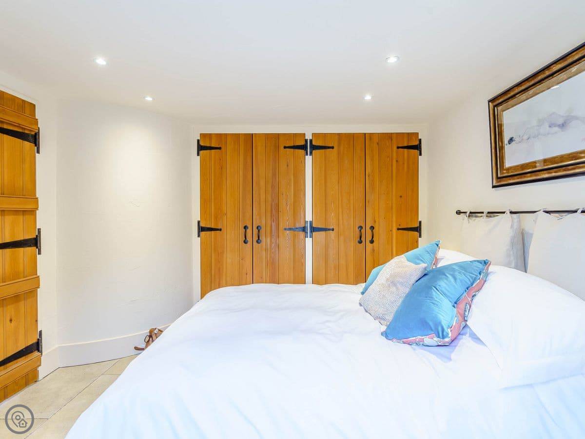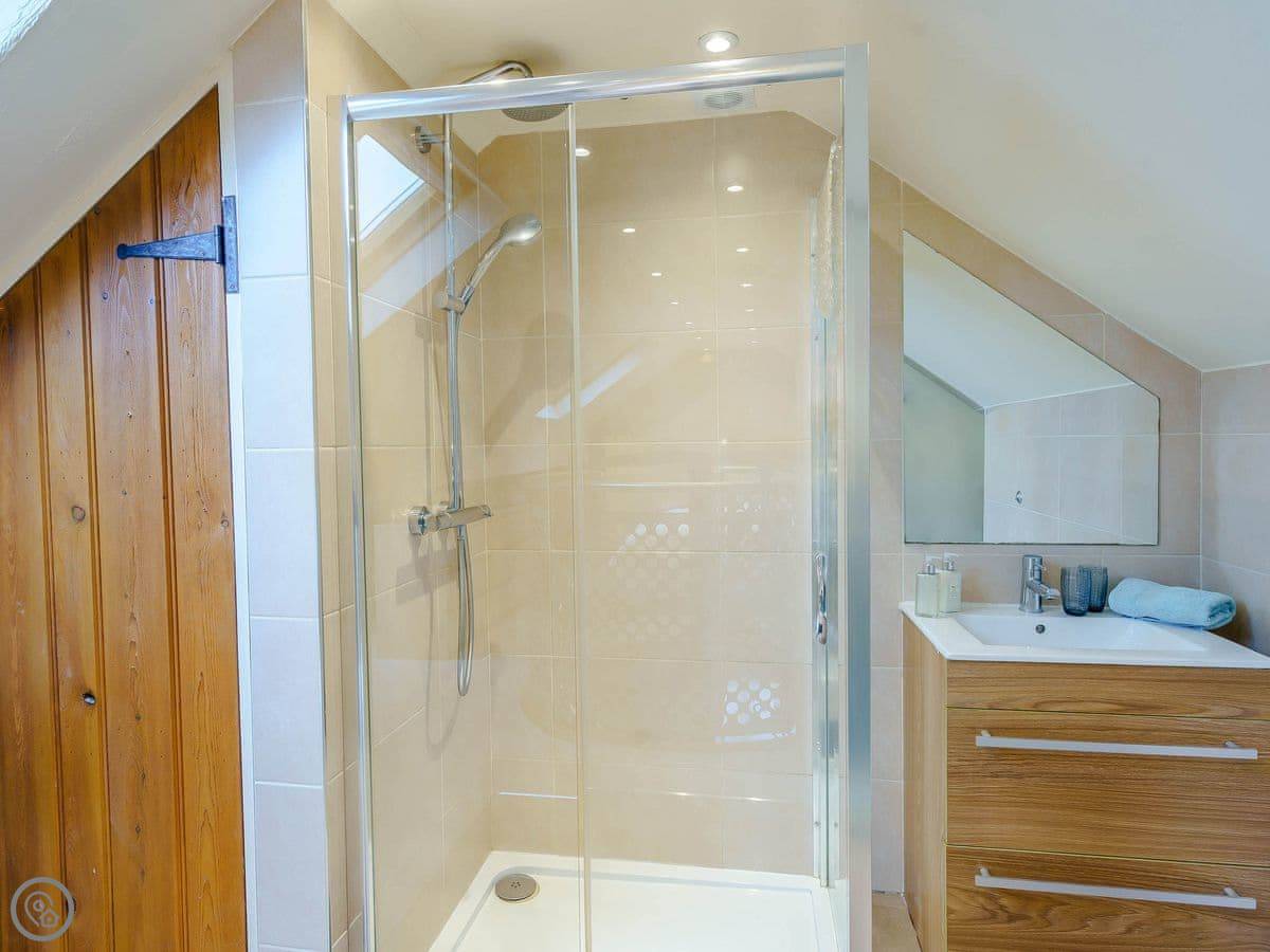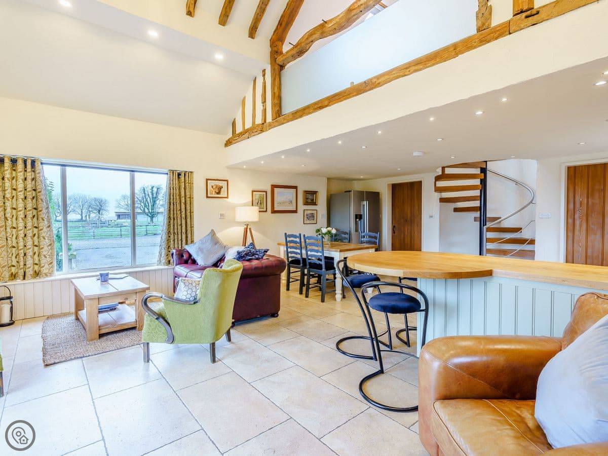 It sleeps four. Two bedrooms and two bathrooms. One of the bedrooms is up on a mezzanine, so it's open to the living area below. The stairs to get up there are spiral and a bit steep. The shower for that room is just up there behind a frosted screen, it's not a separate room. There's underfloor heating downstairs and a wood burner.