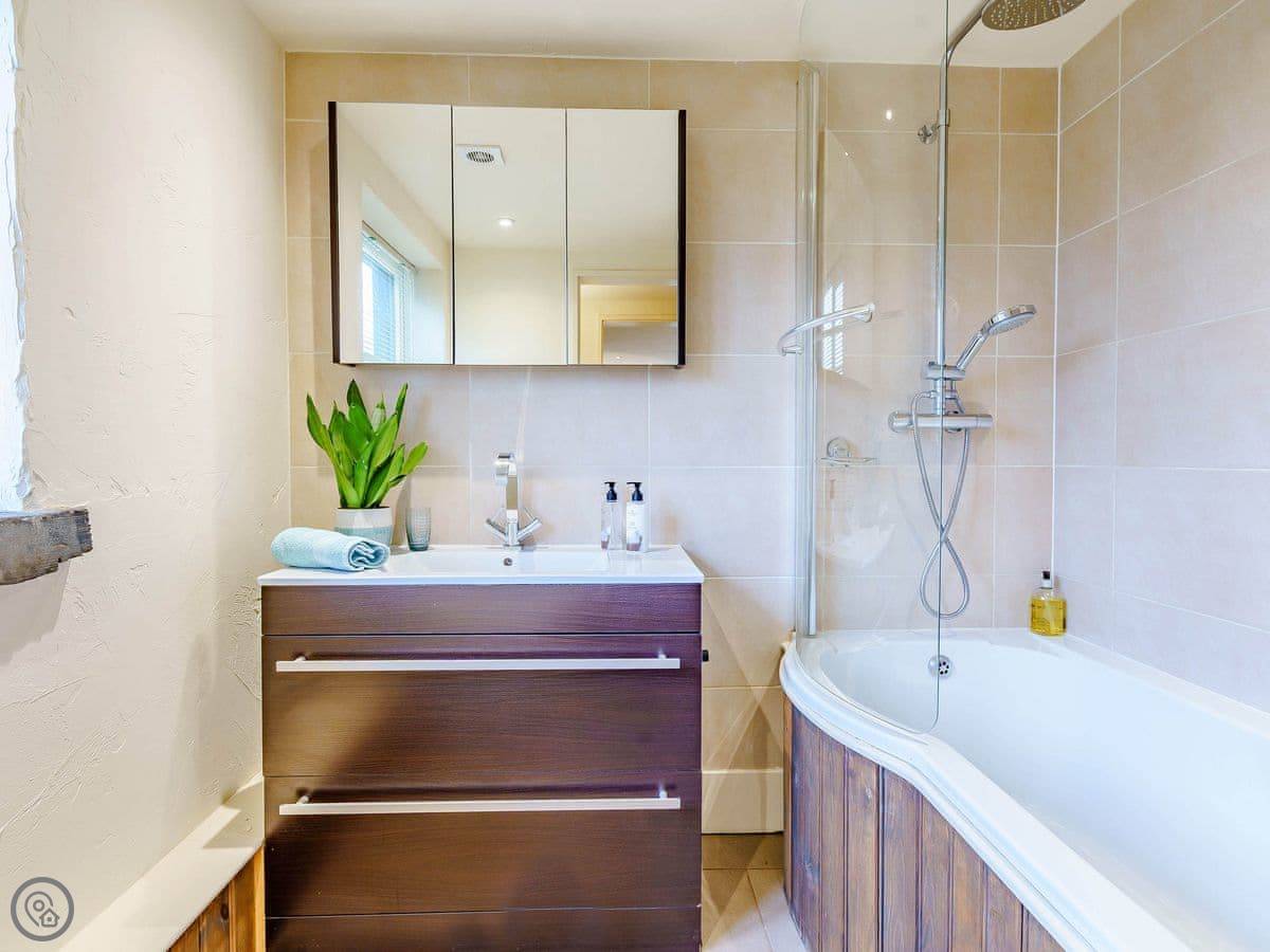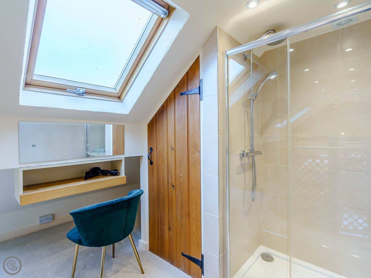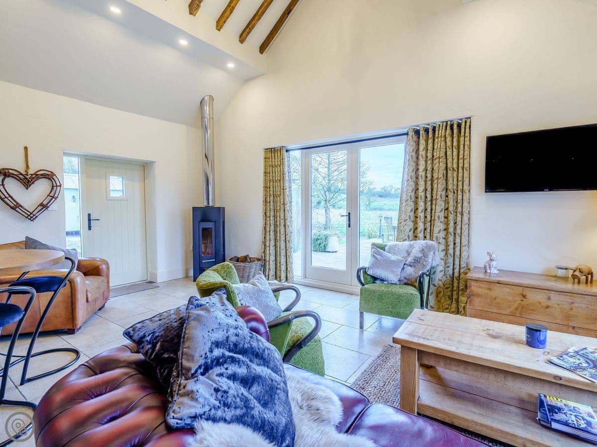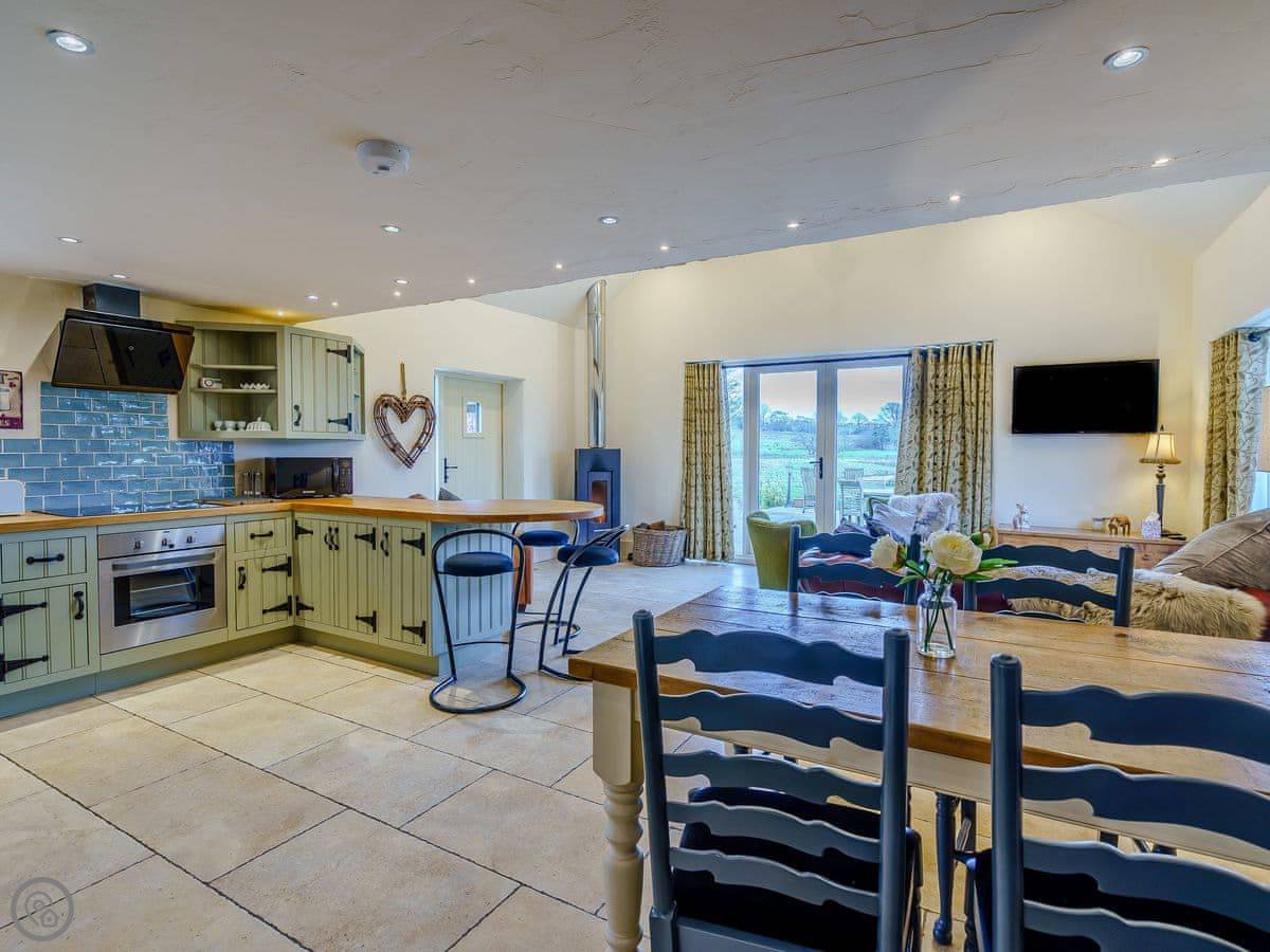 It sleeps four. Two bedrooms and two bathrooms. One of the bedrooms is up on a mezzanine, so it's open to the living area below. The stairs to get up there are spiral and a bit steep. The shower for that room is just up there behind a frosted screen, it's not a separate room. There's underfloor heating downstairs and a wood burner.