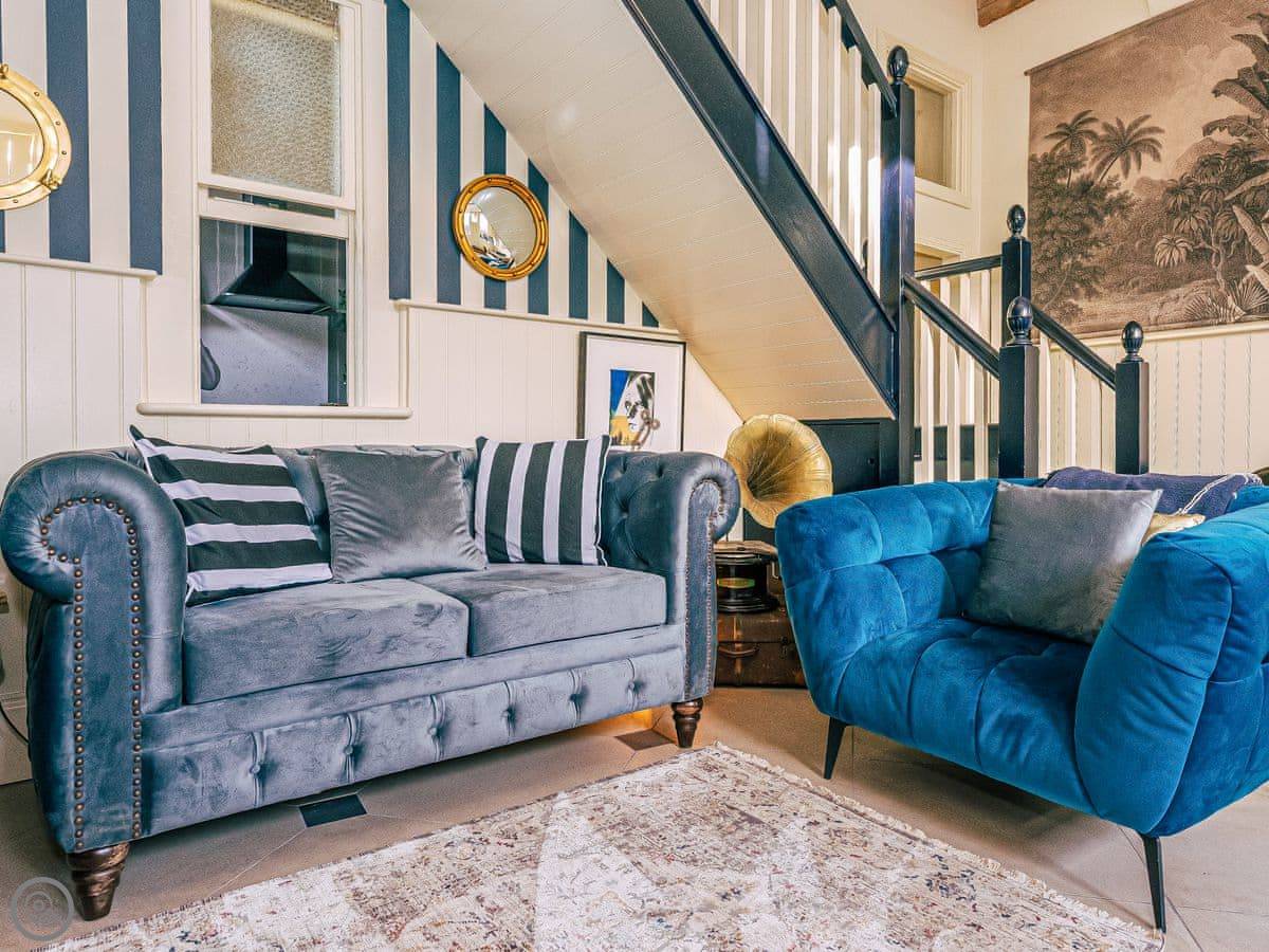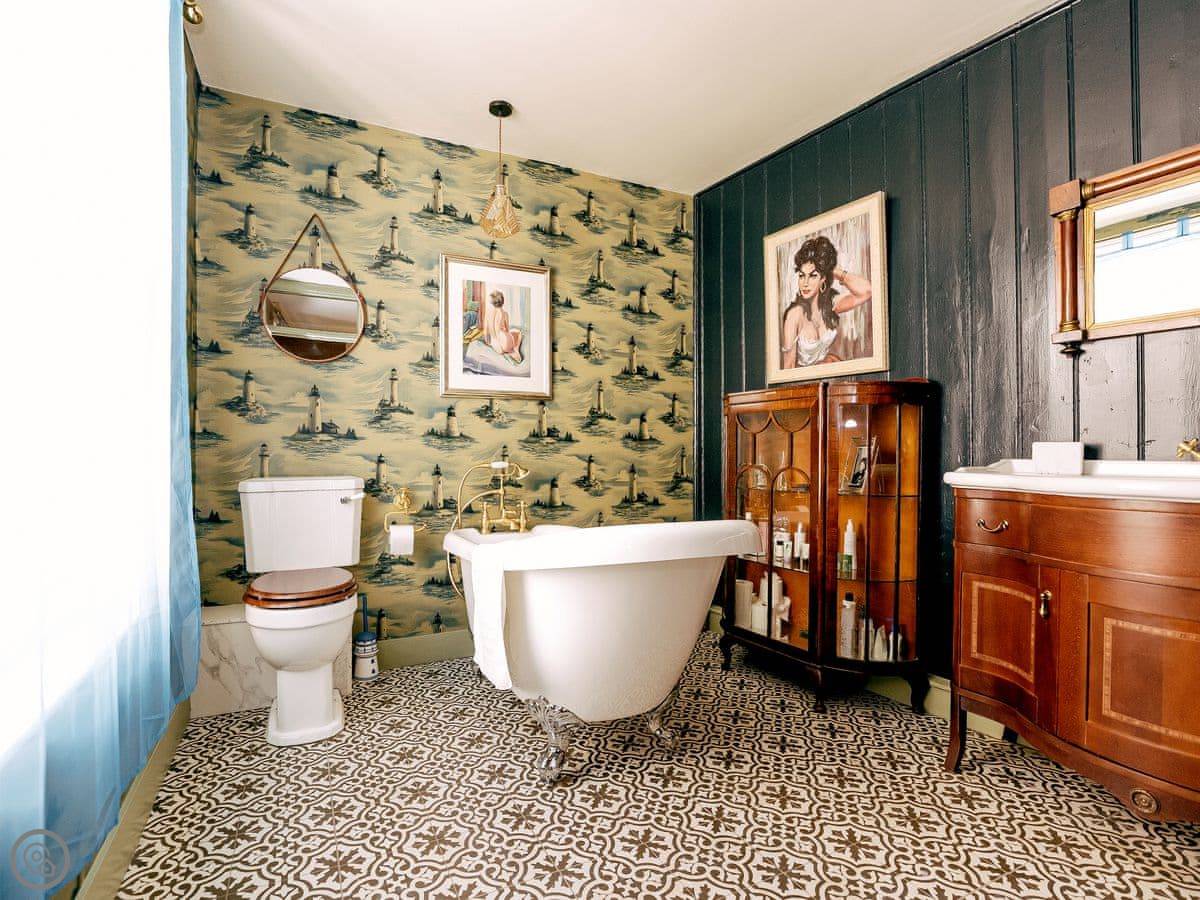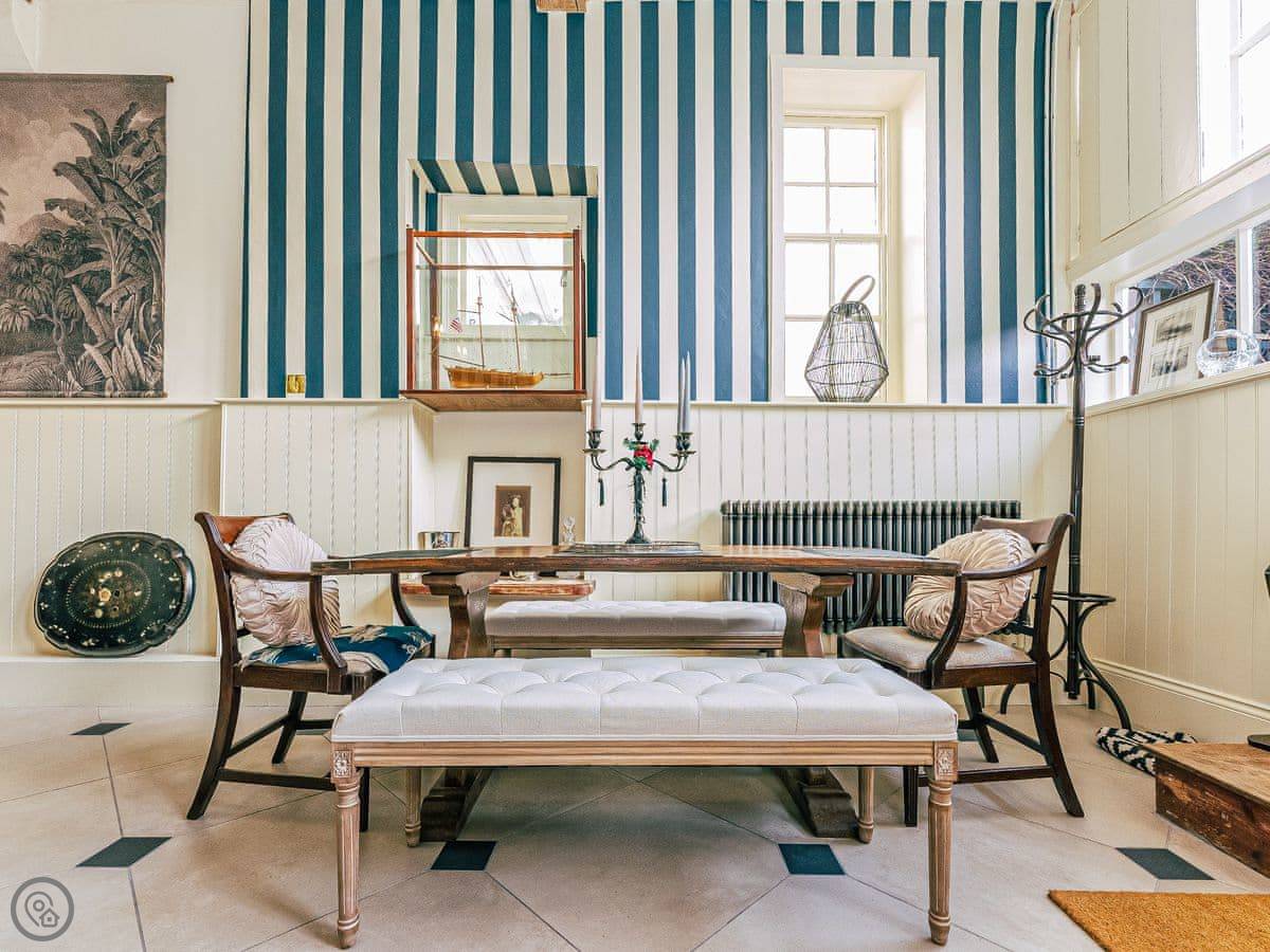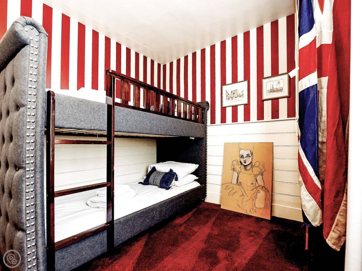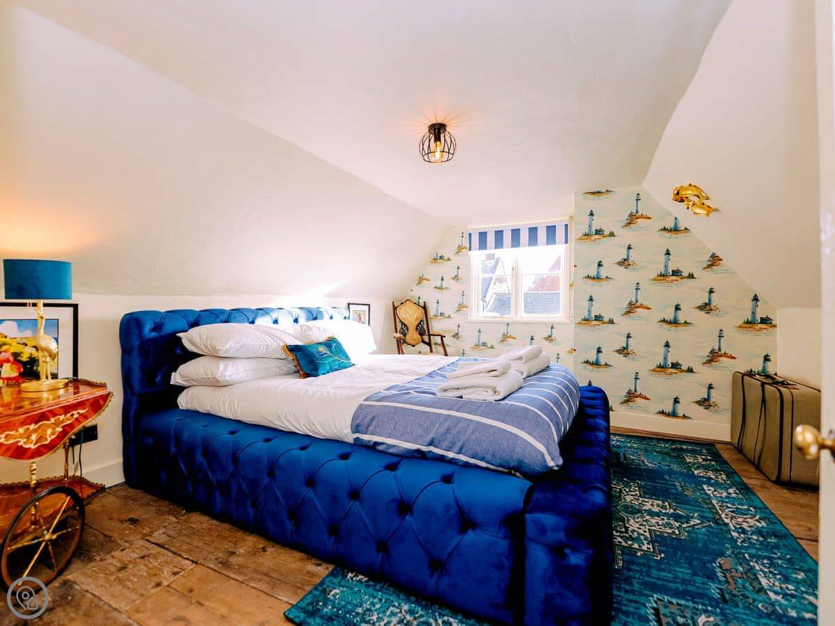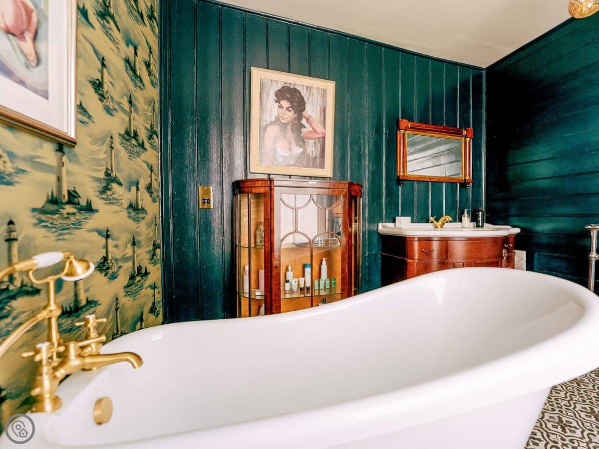 Once you enter the main living space you immediately understand how this was once a dance floor. The double height ceiling, the whole wall of shuttered windows and the cabochon tiles on the floor. Yet there is still a lovely cosy, relaxing atmosphere. The owners call it Naval Bohemia. Stripey designer wallpaper, boating memorabilia juxtaposed against sumptuous Chesterfields, locally found antiques, rugs, a fireplace, a working gramophone and of course the all important Smart TV. In the kitchen, you’ll find a unique set-up with a captain’s bar and galley, a ship’s wheel light, nautical wallpaper, mahogany dresser, butler sink, marble work surface and utensils all hung from shaker hooks. The master and commander’s bedroom features a magnificent wooden, 4-poster kingsize bed. The en-suite is playful with its black porcelain toilet, sink and shower set against marble tiles. The grand steamer bunk room feels very Phileas Fogg with its Chesterfield, bunk bed and burgundy tones. Upstairs to the attic are two further bedrooms. Both rooms have the same luxurious mattresses and bedding as the first floor, plus it feels even more magical and time warpy in these upper rooms. The large family bathroom is a homage to the famous lighthouses here in Harwich and Dovercourt. Stormy lighthouse wallpaper, a roll top slipper bath, rococo tiled floor and mahogany heirlooms make this a real bath time fantasy.