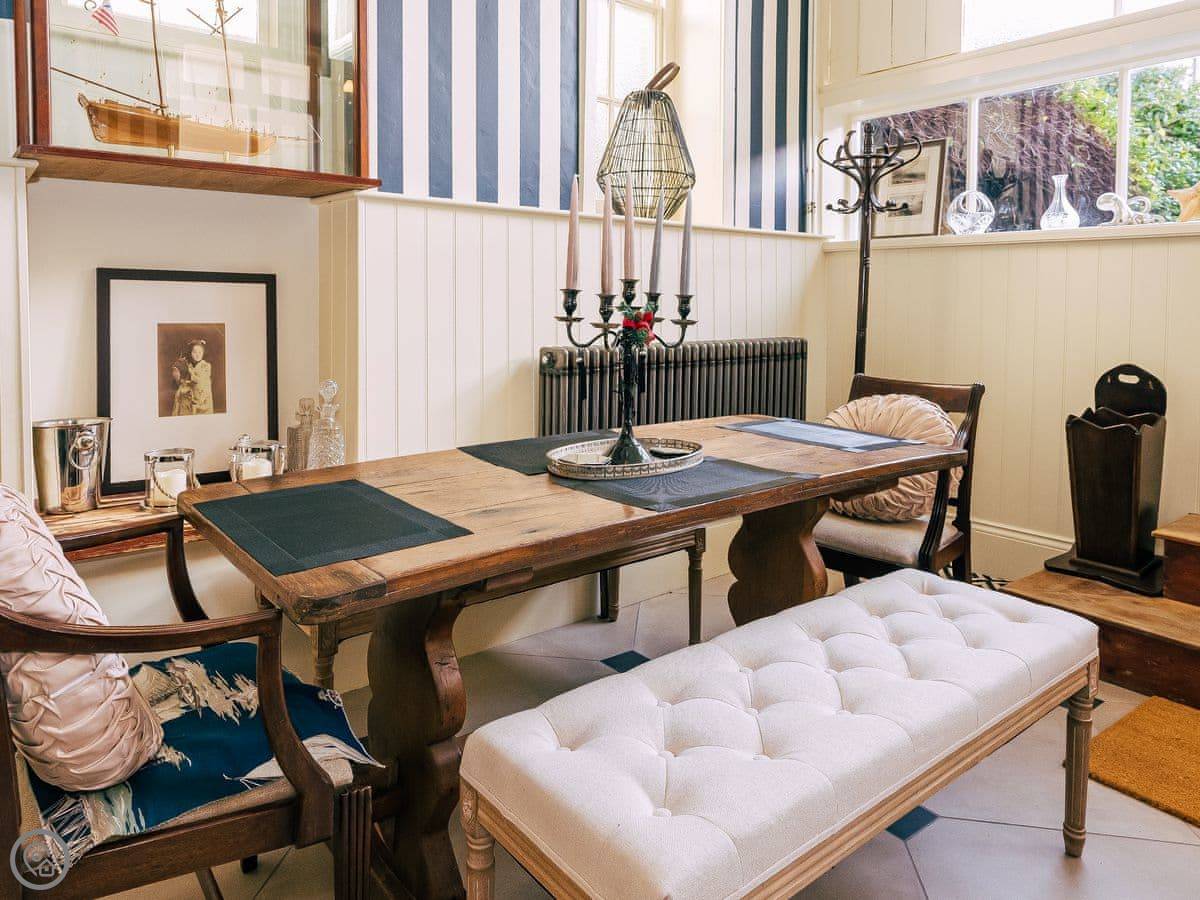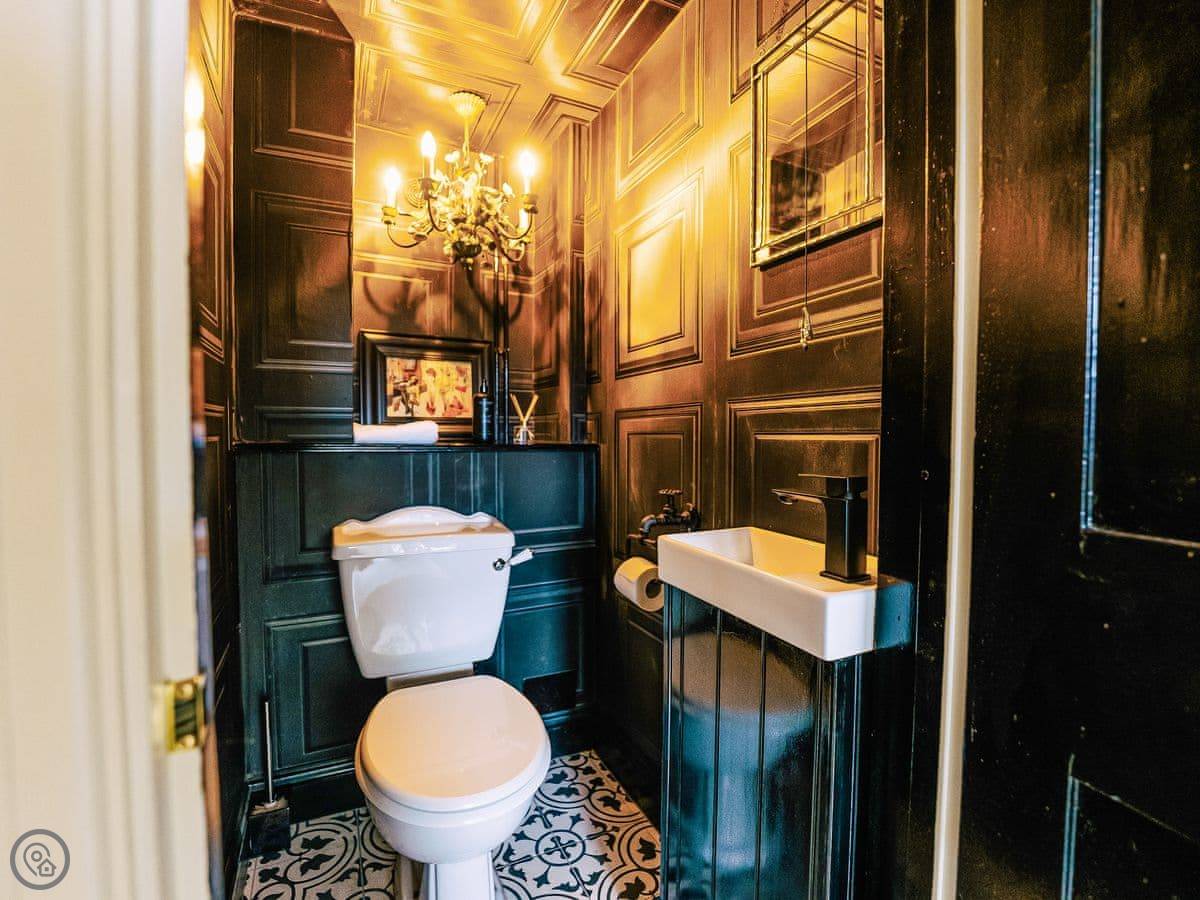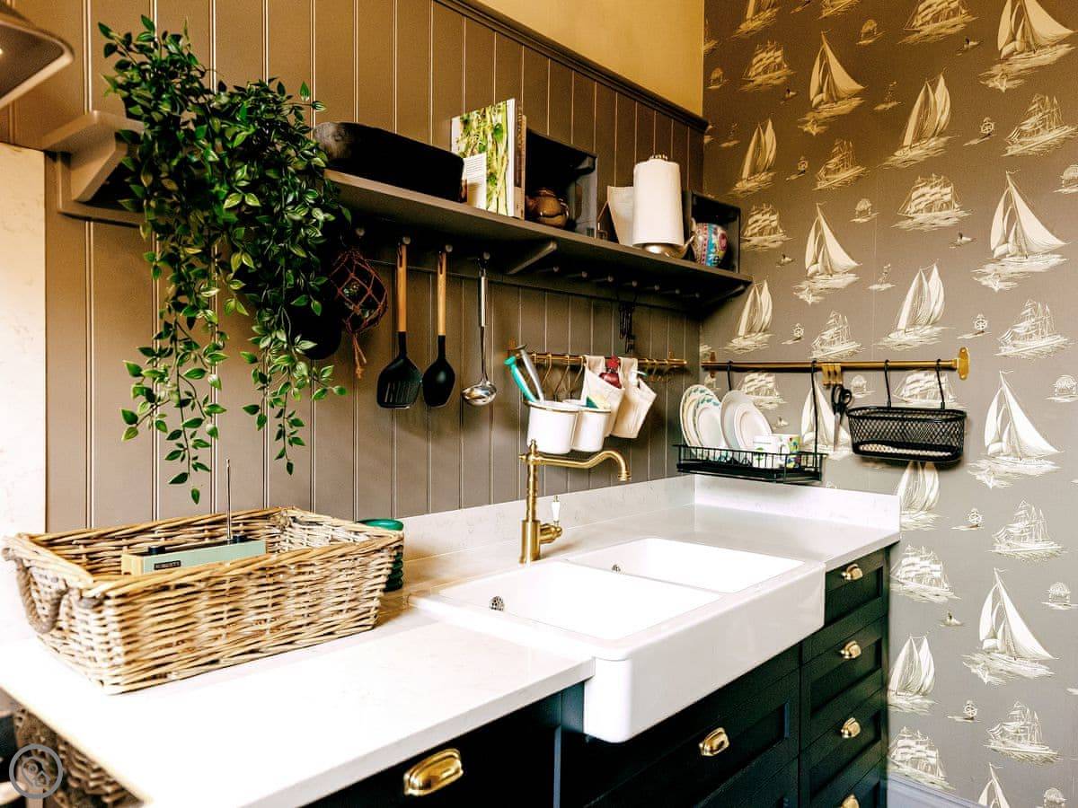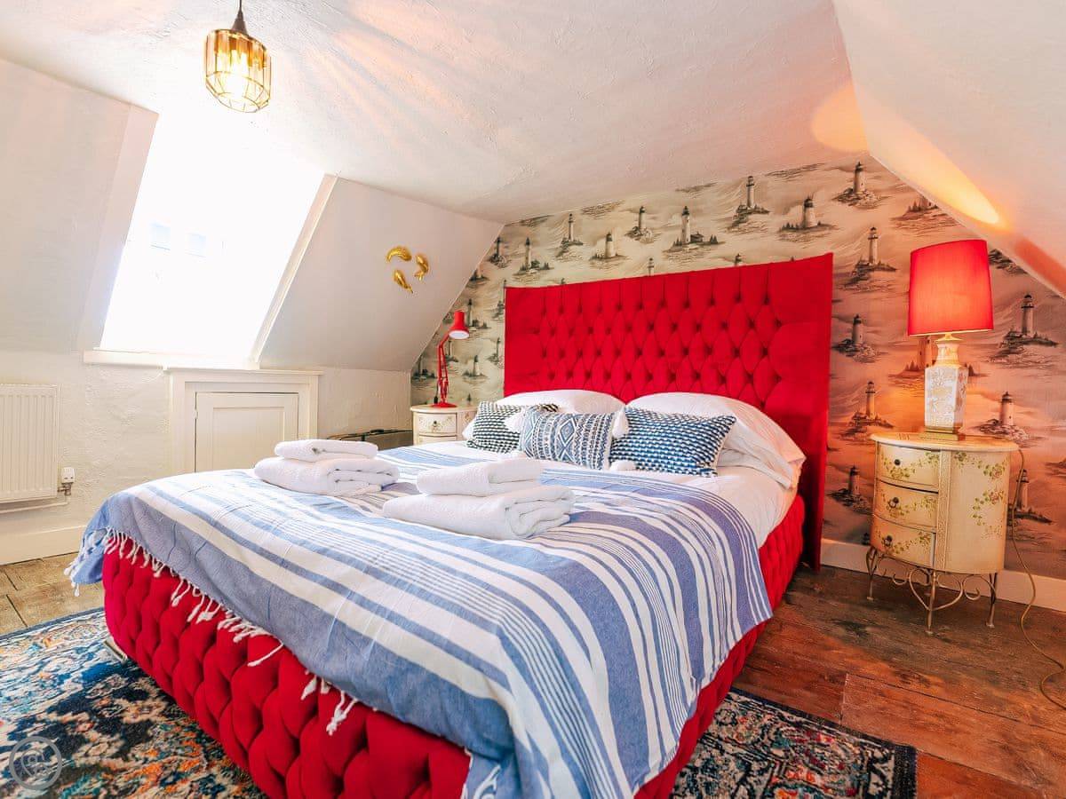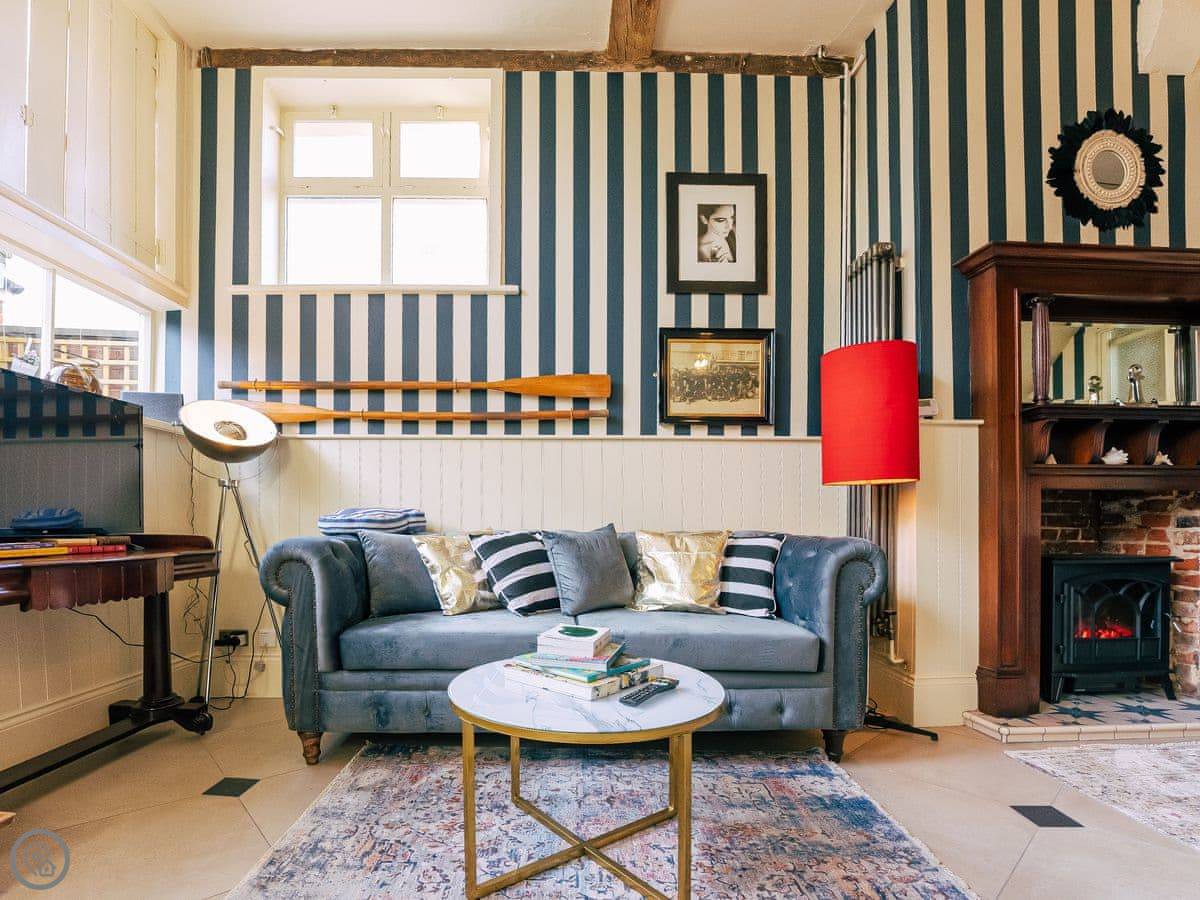 Once you enter the main living space you immediately understand how this was once a dance floor. The double height ceiling, the whole wall of shuttered windows and the cabochon tiles on the floor. Yet there is still a lovely cosy, relaxing atmosphere. The owners call it Naval Bohemia. Stripey designer wallpaper, boating memorabilia juxtaposed against sumptuous Chesterfields, locally found antiques, rugs, a fireplace, a working gramophone and of course the all important Smart TV. In the kitchen, you’ll find a unique set-up with a captain’s bar and galley, a ship’s wheel light, nautical wallpaper, mahogany dresser, butler sink, marble work surface and utensils all hung from shaker hooks. The master and commander’s bedroom features a magnificent wooden, 4-poster kingsize bed. The en-suite is playful with its black porcelain toilet, sink and shower set against marble tiles. The grand steamer bunk room feels very Phileas Fogg with its Chesterfield, bunk bed and burgundy tones. Upstairs to the attic are two further bedrooms. Both rooms have the same luxurious mattresses and bedding as the first floor, plus it feels even more magical and time warpy in these upper rooms. The large family bathroom is a homage to the famous lighthouses here in Harwich and Dovercourt. Stormy lighthouse wallpaper, a roll top slipper bath, rococo tiled floor and mahogany heirlooms make this a real bath time fantasy.