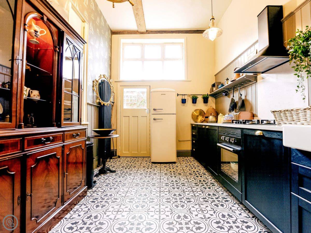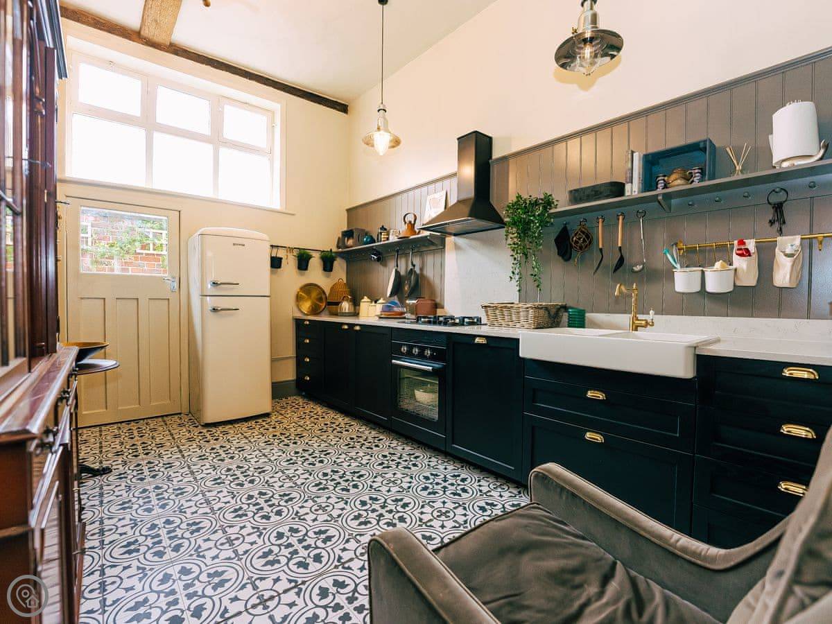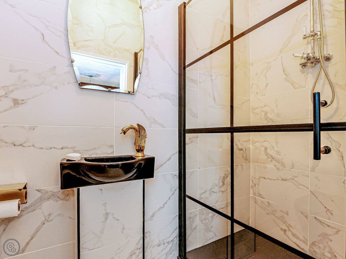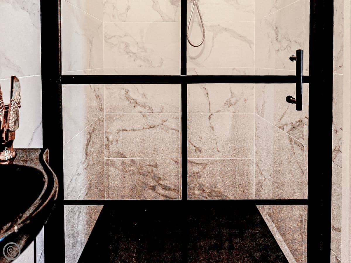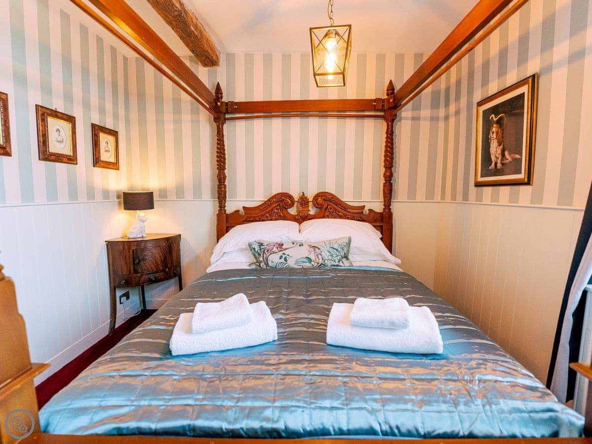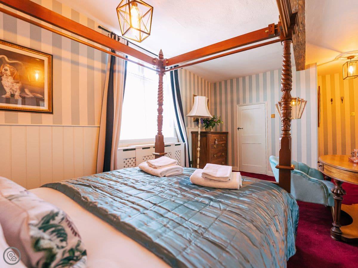 Once you enter the main living space you immediately understand how this was once a dance floor. The double height ceiling, the whole wall of shuttered windows and the cabochon tiles on the floor. Yet there is still a lovely cosy, relaxing atmosphere. The owners call it Naval Bohemia. Stripey designer wallpaper, boating memorabilia juxtaposed against sumptuous Chesterfields, locally found antiques, rugs, a fireplace, a working gramophone and of course the all important Smart TV. In the kitchen, you’ll find a unique set-up with a captain’s bar and galley, a ship’s wheel light, nautical wallpaper, mahogany dresser, butler sink, marble work surface and utensils all hung from shaker hooks. The master and commander’s bedroom features a magnificent wooden, 4-poster kingsize bed. The en-suite is playful with its black porcelain toilet, sink and shower set against marble tiles. The grand steamer bunk room feels very Phileas Fogg with its Chesterfield, bunk bed and burgundy tones. Upstairs to the attic are two further bedrooms. Both rooms have the same luxurious mattresses and bedding as the first floor, plus it feels even more magical and time warpy in these upper rooms. The large family bathroom is a homage to the famous lighthouses here in Harwich and Dovercourt. Stormy lighthouse wallpaper, a roll top slipper bath, rococo tiled floor and mahogany heirlooms make this a real bath time fantasy.