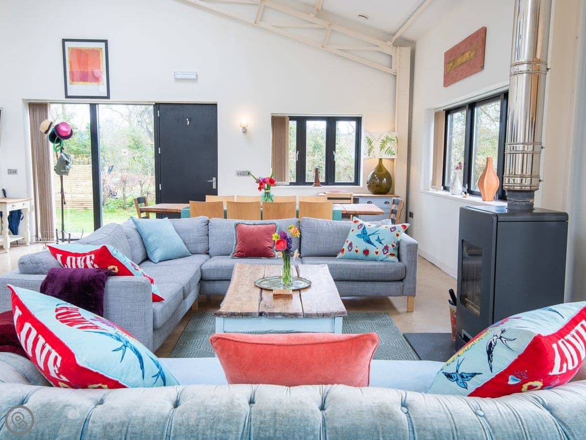 Inside the open plan accommodation, there is a large dining room table, perfect for all the family to enjoy, a cosy seating area with comfy sofas around the stunning rotating wood burner, or if you fancy a game of snooker or pool there is a small table to enjoy a game. There is also a Smart TV. French doors lead out to the front patio, which is enclosed and secluded, the perfect place to make use of the firepit or for the dogs to enjoy. The kitchen has been tastefully completed keeping the ‘eco’ feel with a breakfast area, fridge freezer, washing machine and dishwasher. Also on the ground floor is a bedroom with kingsize bed and day bed. A wet room can also be found on the ground floor.