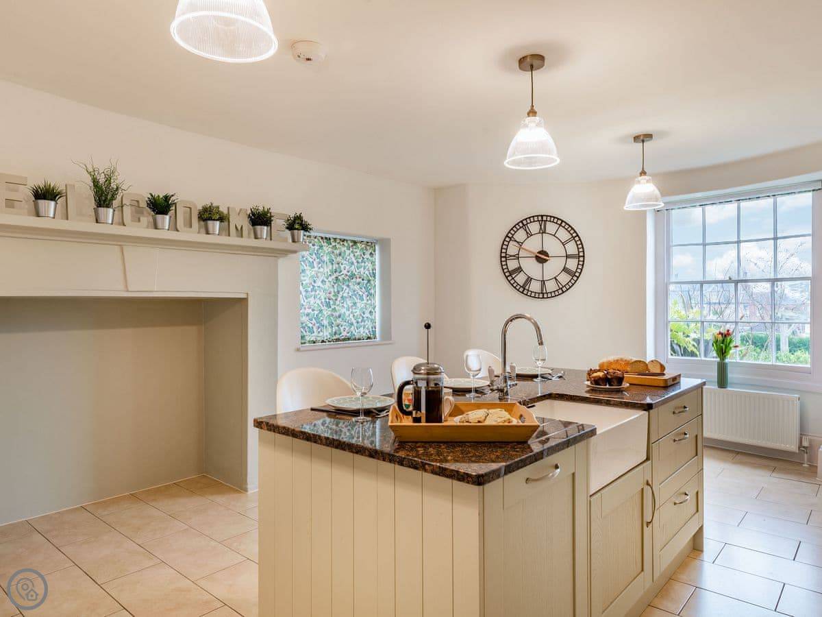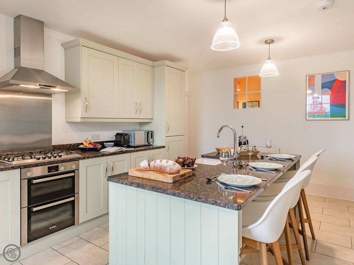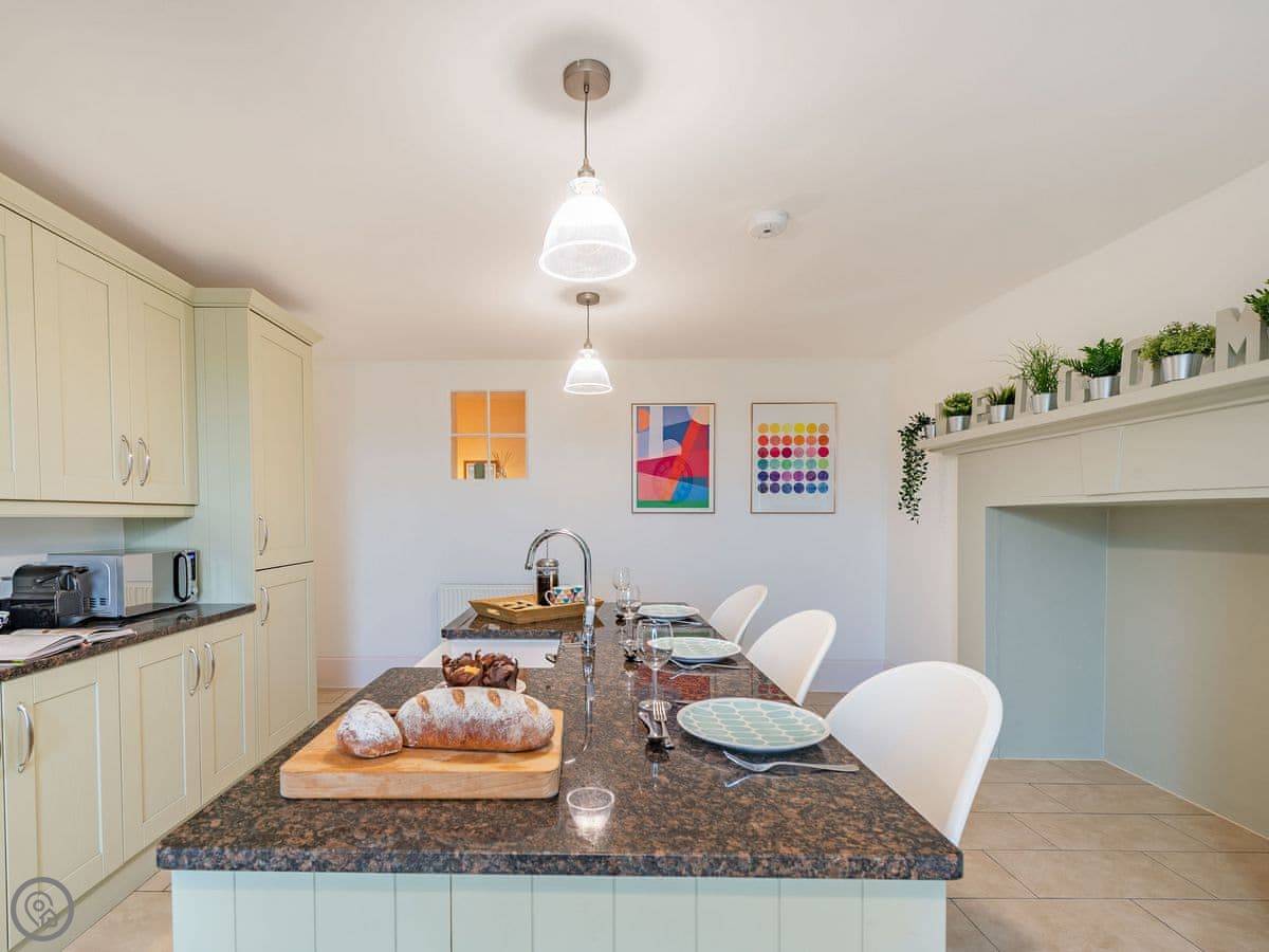 The kitchen is big, with an island and a table. It has a dishwasher and a double oven. The living room is very large with an electric fire and a Smart TV. We provide dog beds and bowls if you need them. The place is good for two dogs.