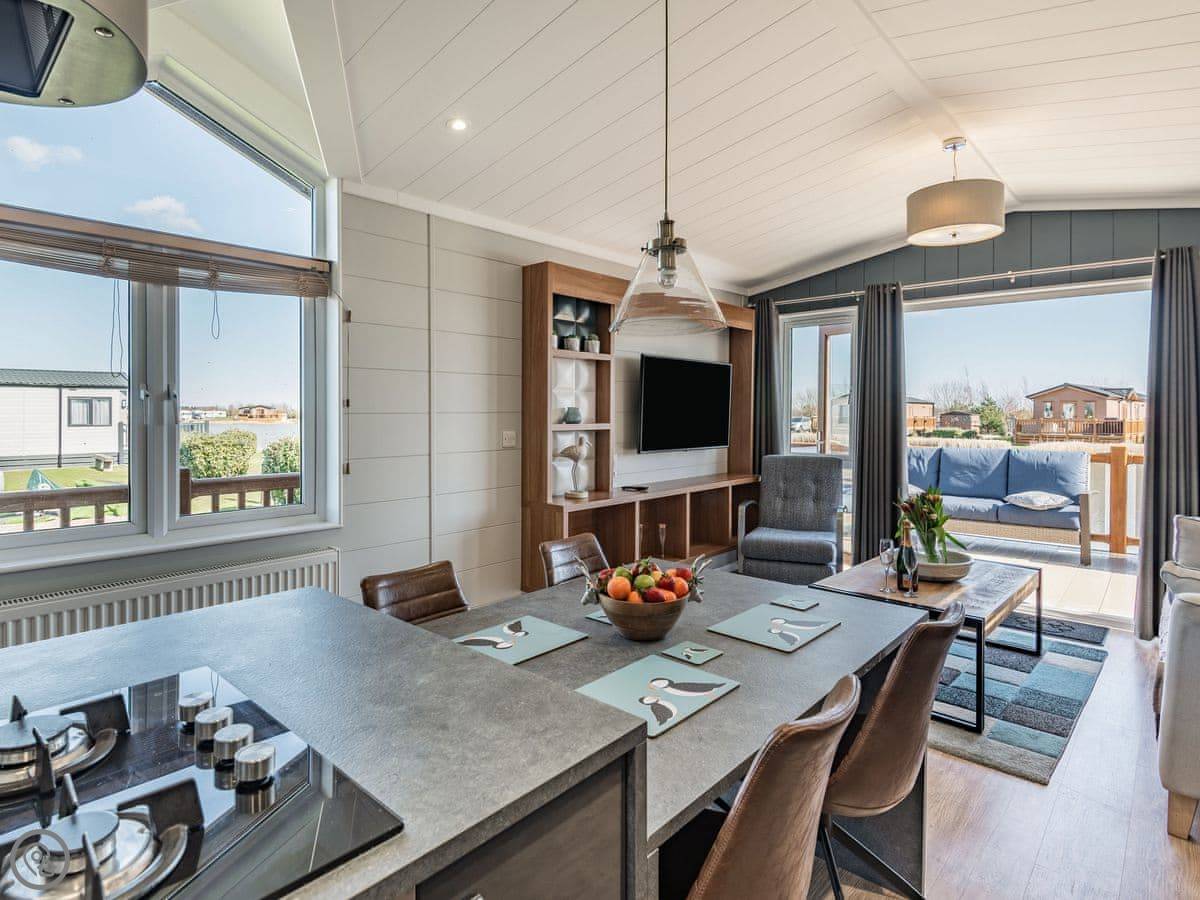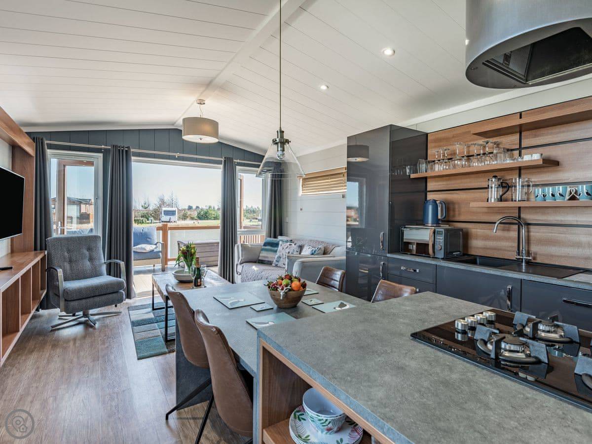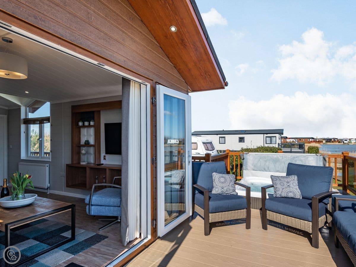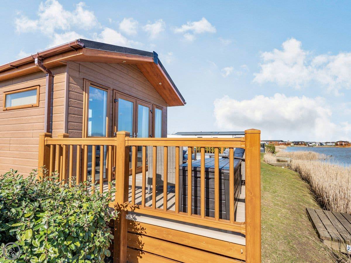 It sleeps four. Two bedrooms, both with their own bathrooms. It has a 5 Star rating, which means it's well fitted out and comfortable. It's open plan inside, so the living, kitchen, and dining area is all one space. The big deck is fully enclosed, which is good if you have dogs or kids. It looks straight out over the fishing lakes. The hot tub is on the deck.