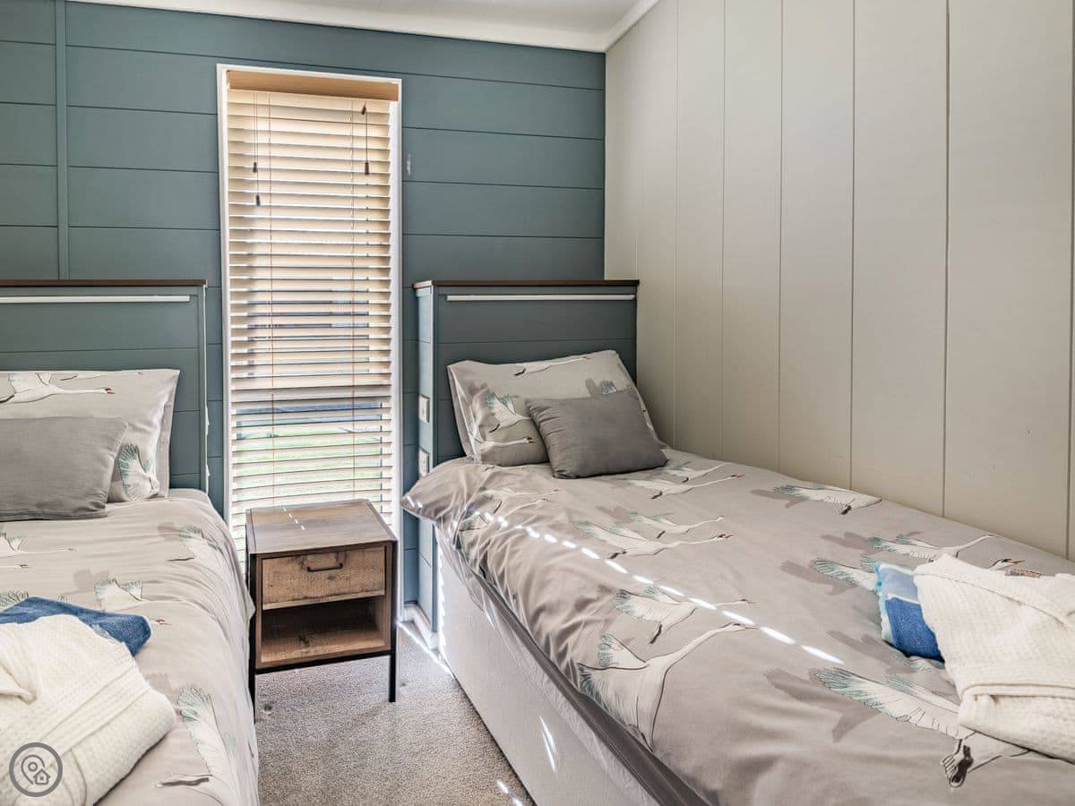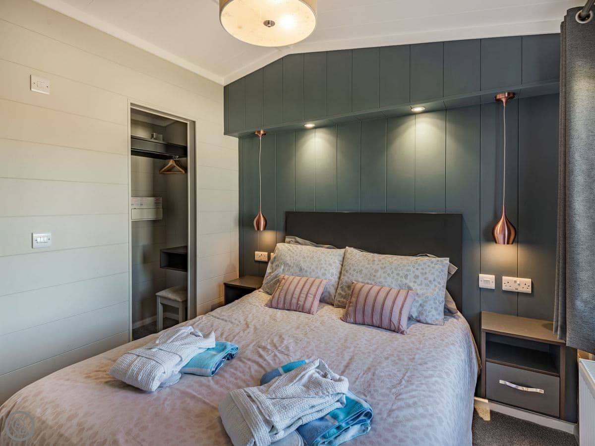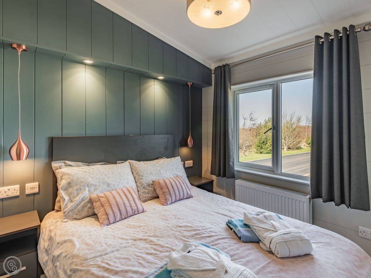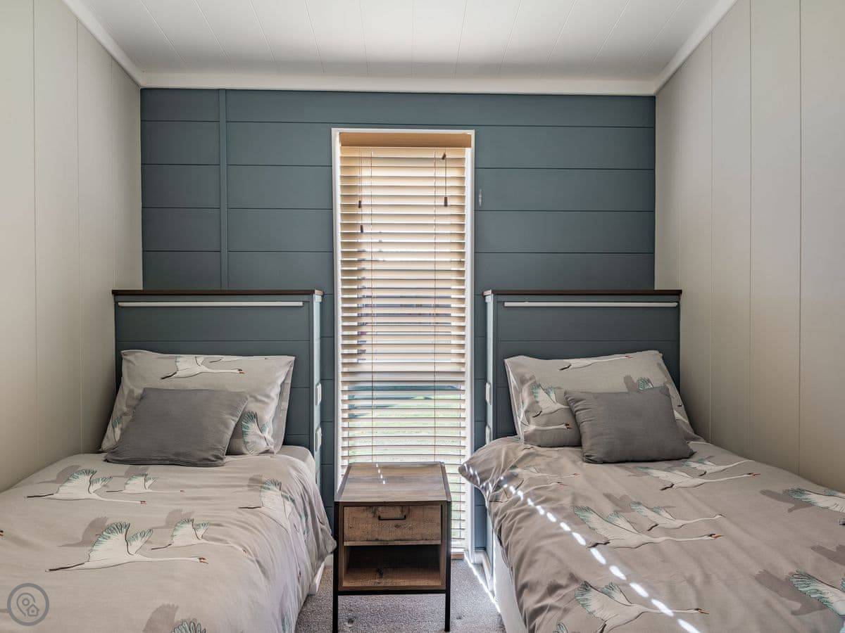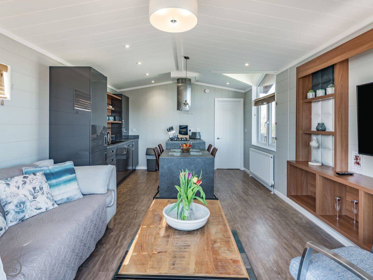 It sleeps four. Two bedrooms, both with their own bathrooms. It has a 5 Star rating, which means it's well fitted out and comfortable. It's open plan inside, so the living, kitchen, and dining area is all one space. The big deck is fully enclosed, which is good if you have dogs or kids. It looks straight out over the fishing lakes. The hot tub is on the deck.