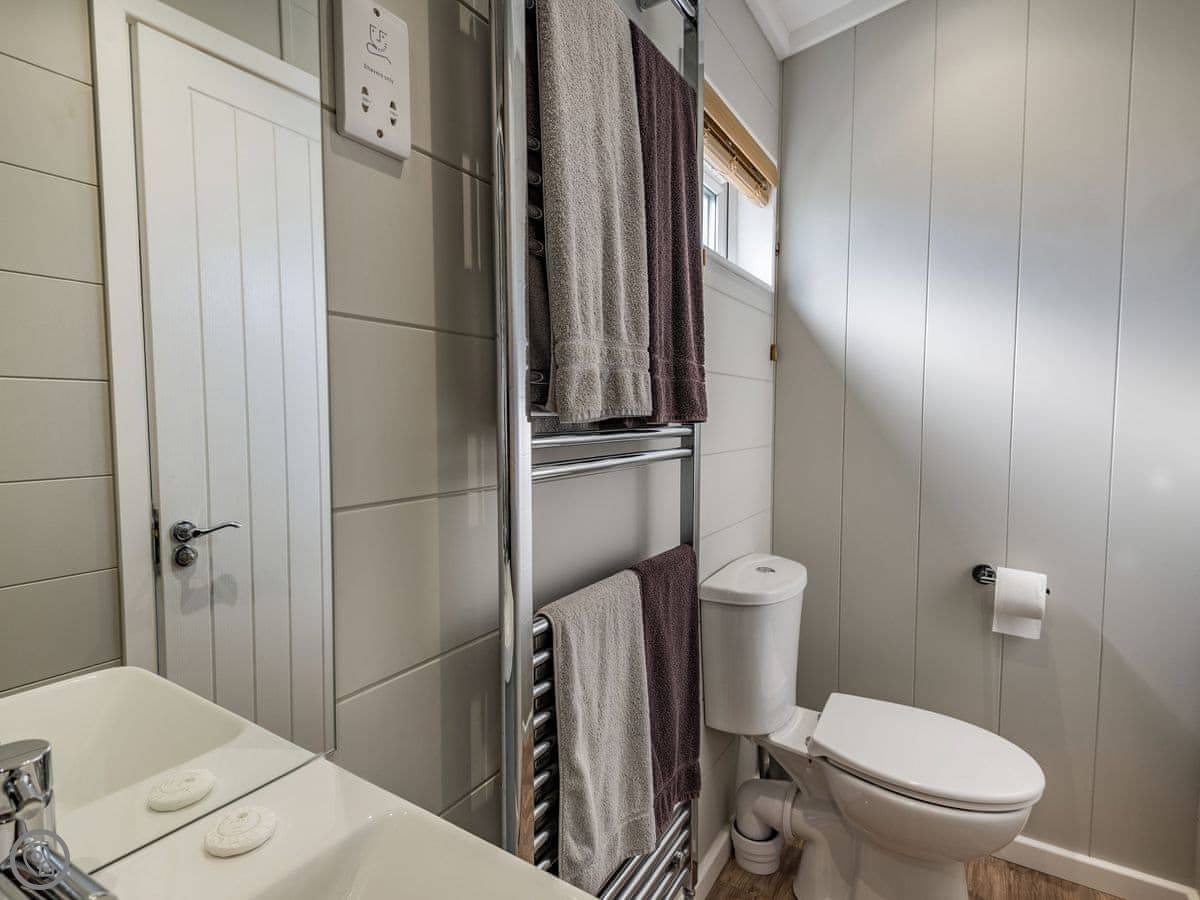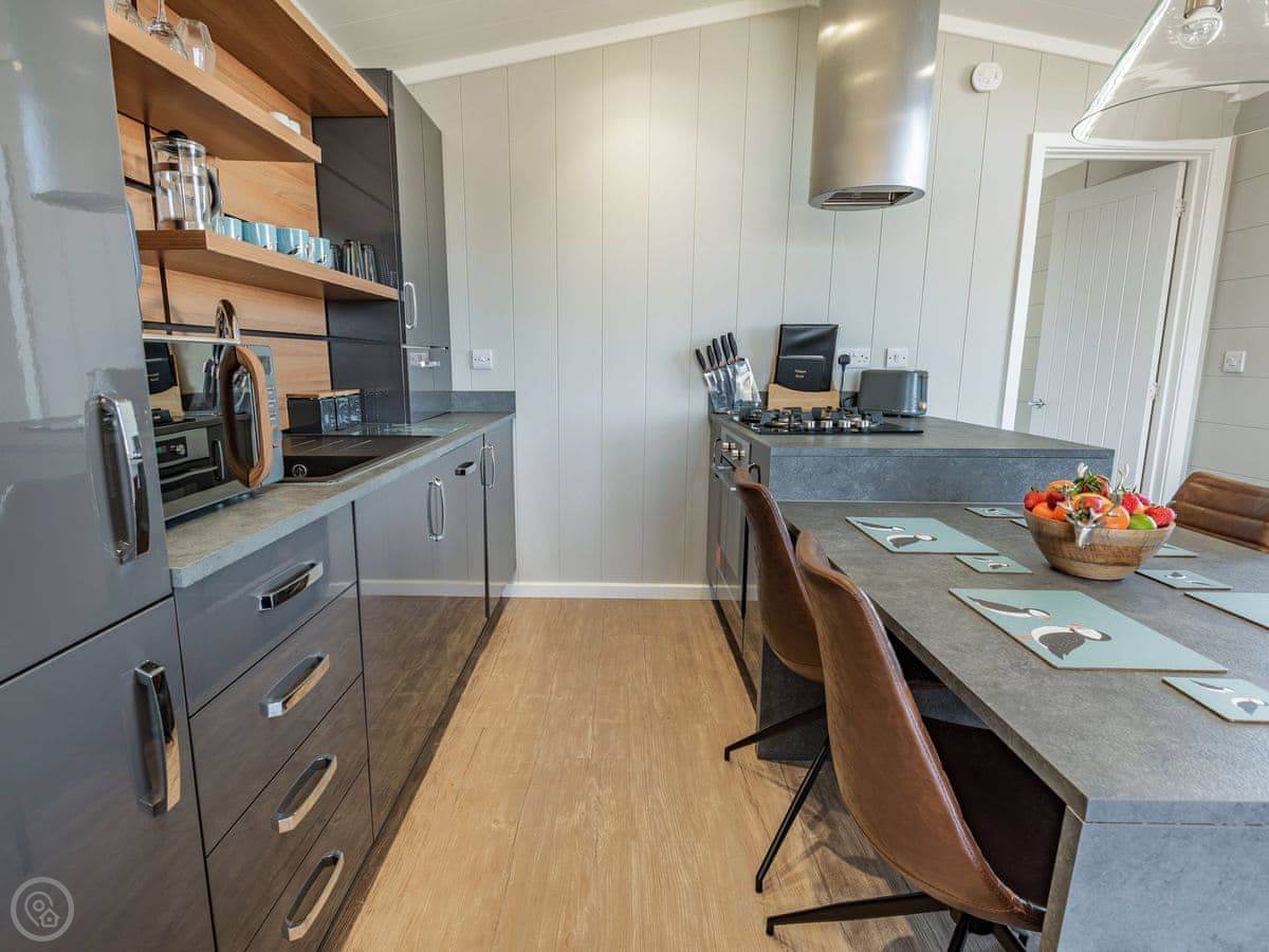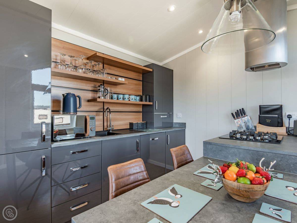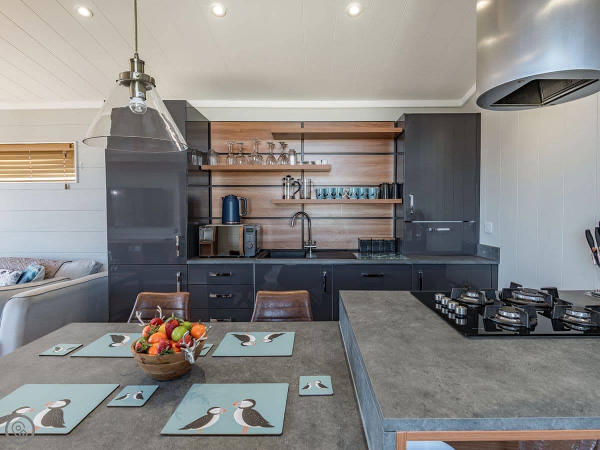 It sleeps four. Two bedrooms, both with their own bathrooms. It has a 5 Star rating, which means it's well fitted out and comfortable. It's open plan inside, so the living, kitchen, and dining area is all one space. The big deck is fully enclosed, which is good if you have dogs or kids. It looks straight out over the fishing lakes. The hot tub is on the deck.