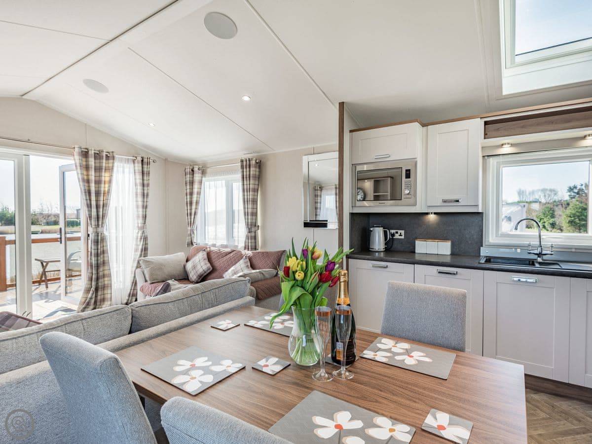 Reed Roost is a lodge in Addlethorpe. It's detached. The main thing is it's right on the edge of a fishing lake. You get a big, enclosed deck out front that looks out over the water and a private hot tub.