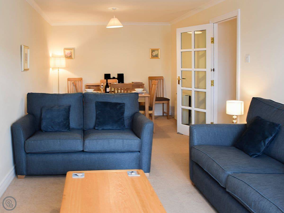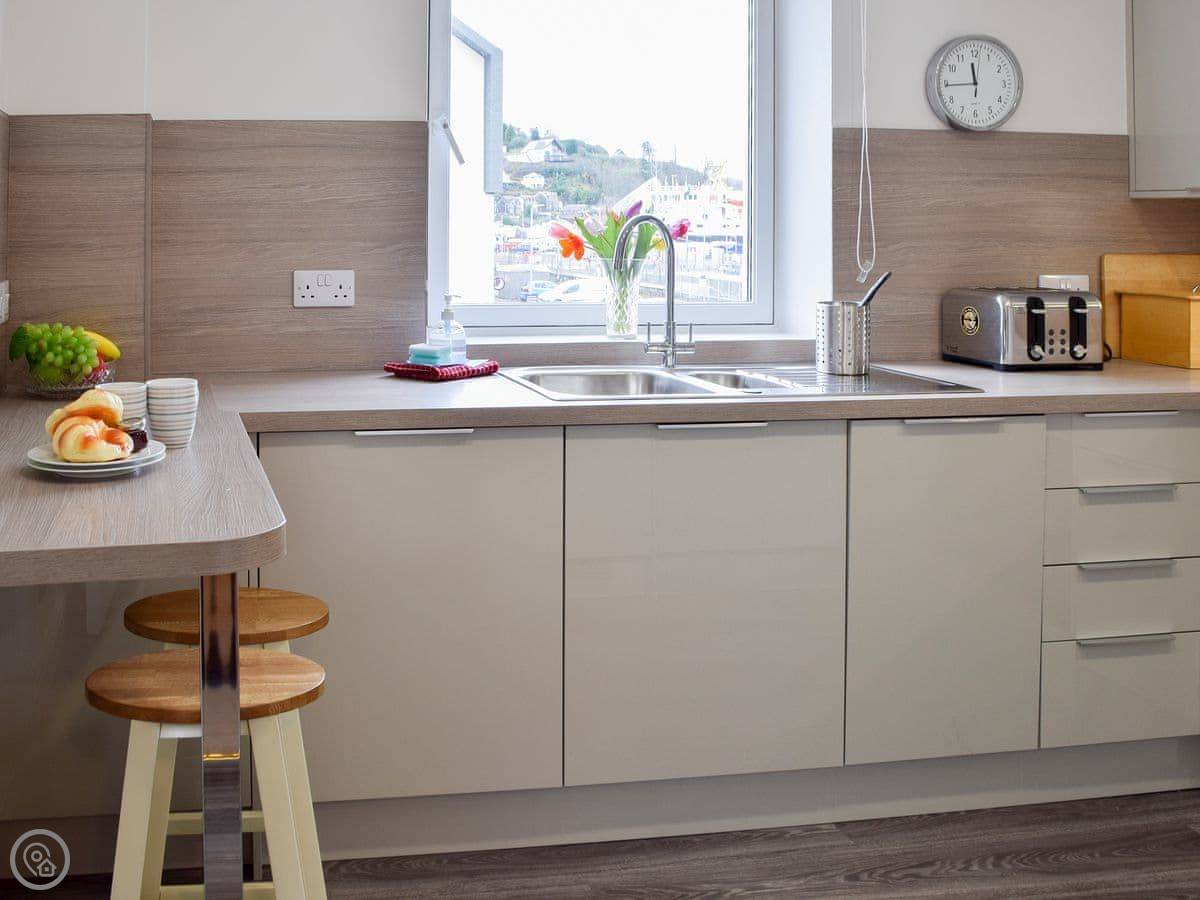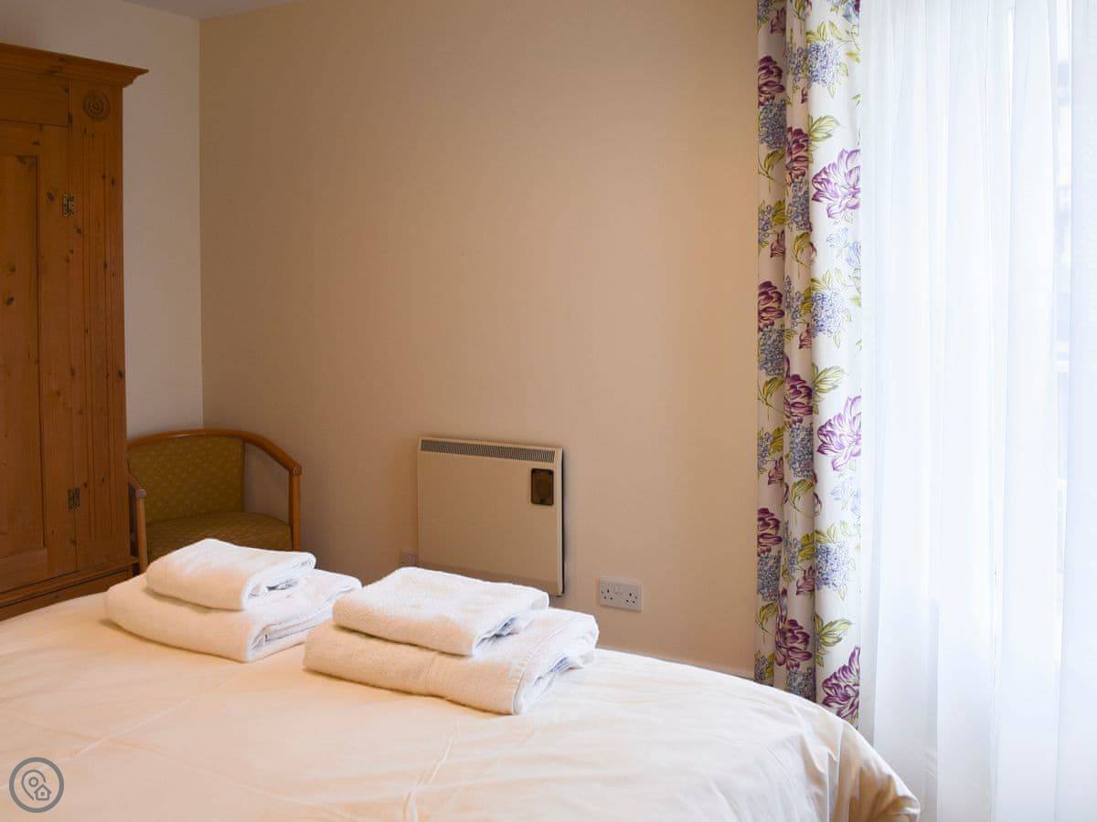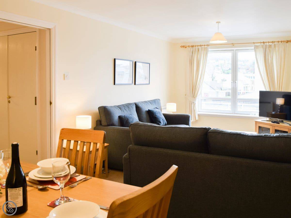 A beautifully decorated airy apartment, it’s the ideal size for a couple or small family wishing to enjoy a coastal town centre break and is made cosy by convenient electric heating. It has a spacious living/dining room, enjoying a view over the town up to Pulpit Hill and a modern well-equipped kitchen with breakfast bar. There are two spacious bedrooms with lovely comfy beds, a double room and a twin room. Both are served by a newly installed shower room with walk-in shower.