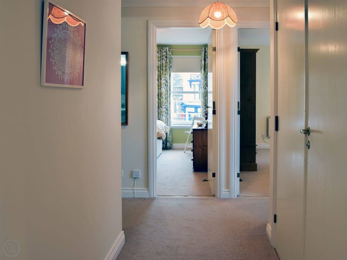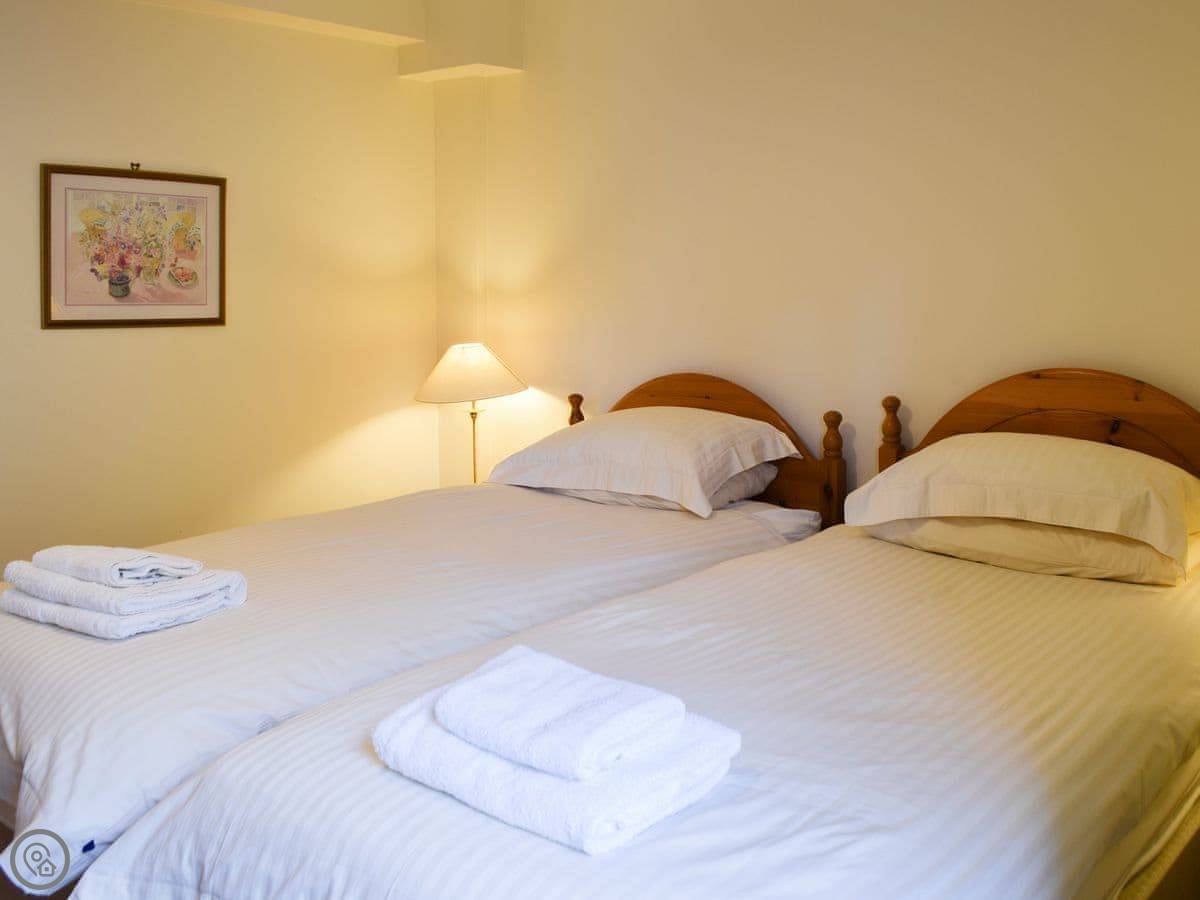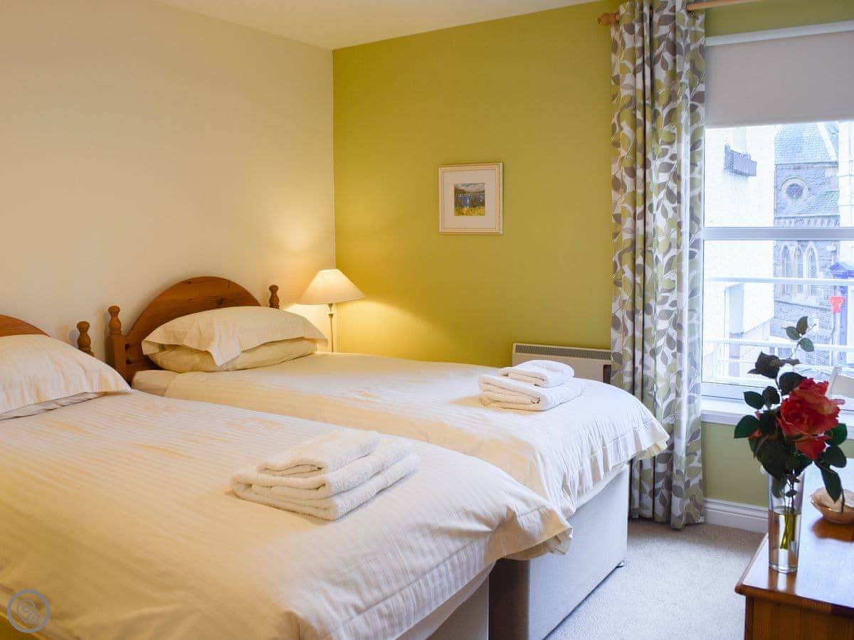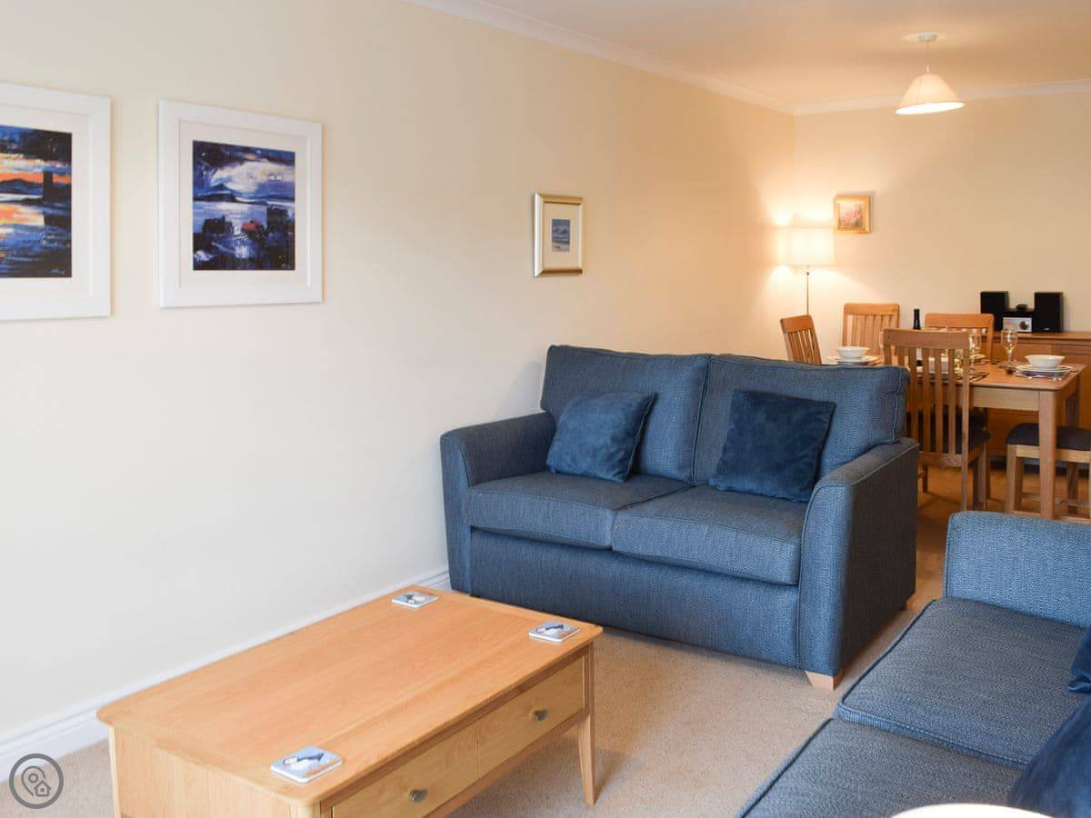 A beautifully decorated airy apartment, it’s the ideal size for a couple or small family wishing to enjoy a coastal town centre break and is made cosy by convenient electric heating. It has a spacious living/dining room, enjoying a view over the town up to Pulpit Hill and a modern well-equipped kitchen with breakfast bar. There are two spacious bedrooms with lovely comfy beds, a double room and a twin room. Both are served by a newly installed shower room with walk-in shower.